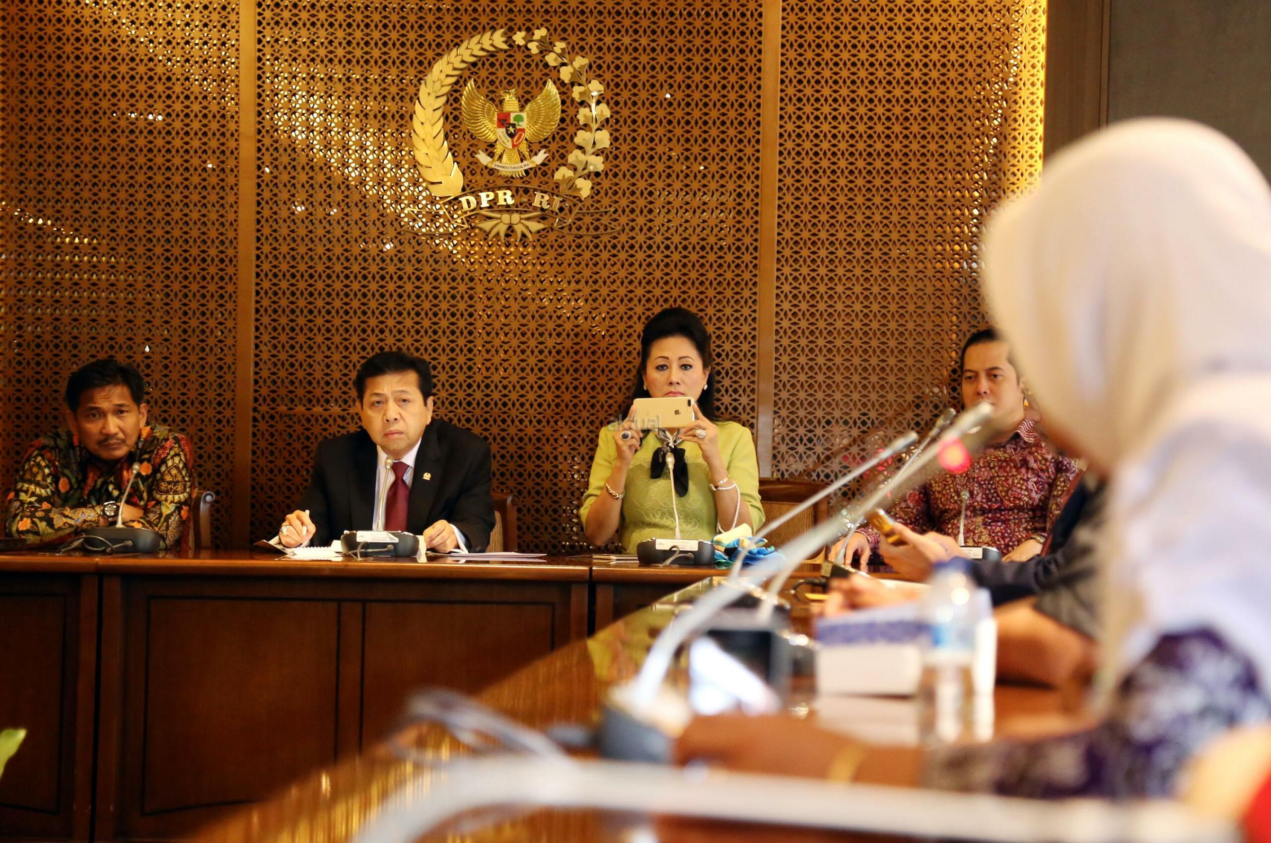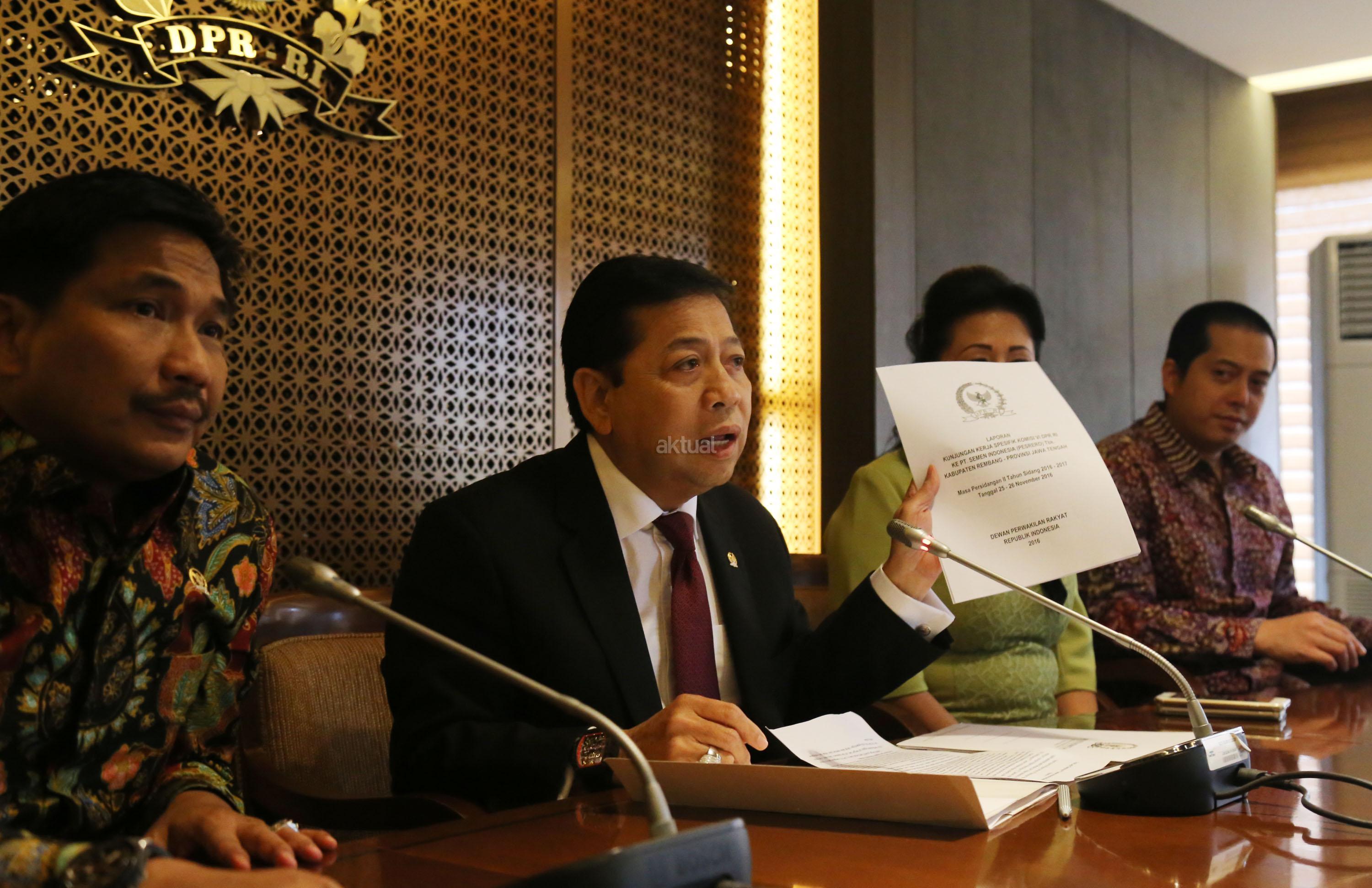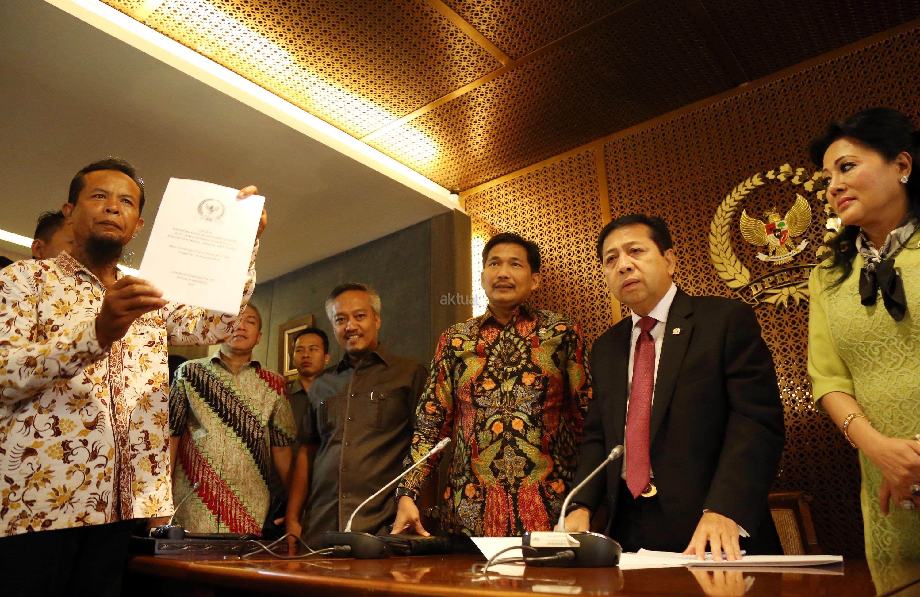 Ketua DPR RI Setya Novanto menerima perwakilan warga Desa Rembang Jawa Tengah di Jakarta, Kamis (12/1). Warga yang berada di sekitar Pabrik Semen Indonesia Rembang ini meminta agar proses pembangunan pabrik ini kembali dilanjutkan. Beberapa waktu sebelumnya MA mengabulkan tuntutan PK sebagian warga Rembang yang menolak pembangunan pabrik. AKTUAL/Tino Oktaviano
