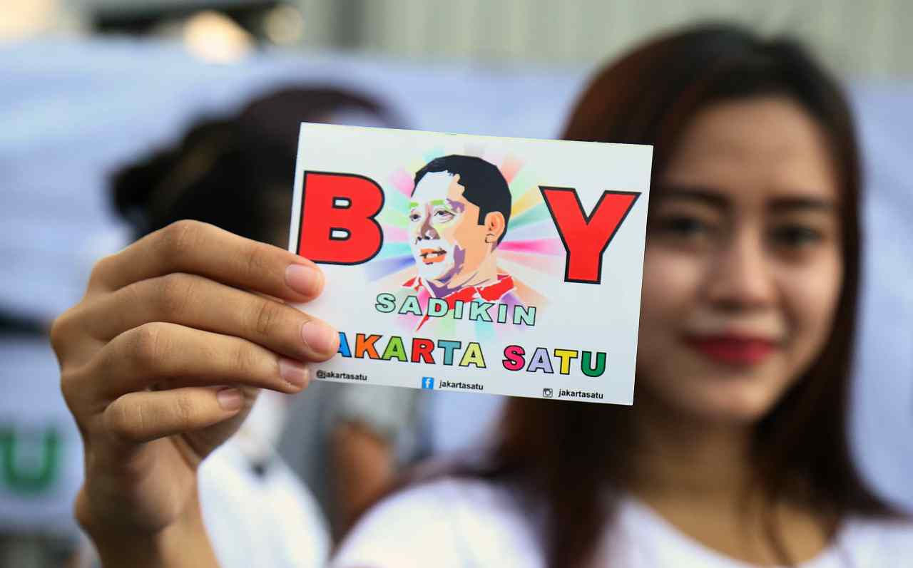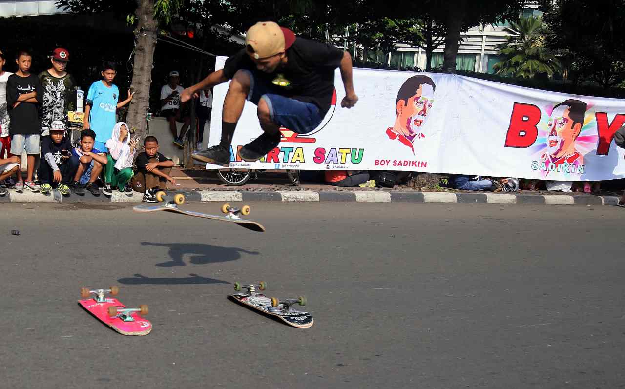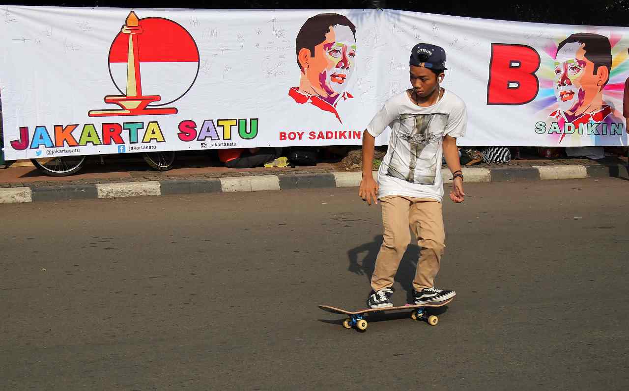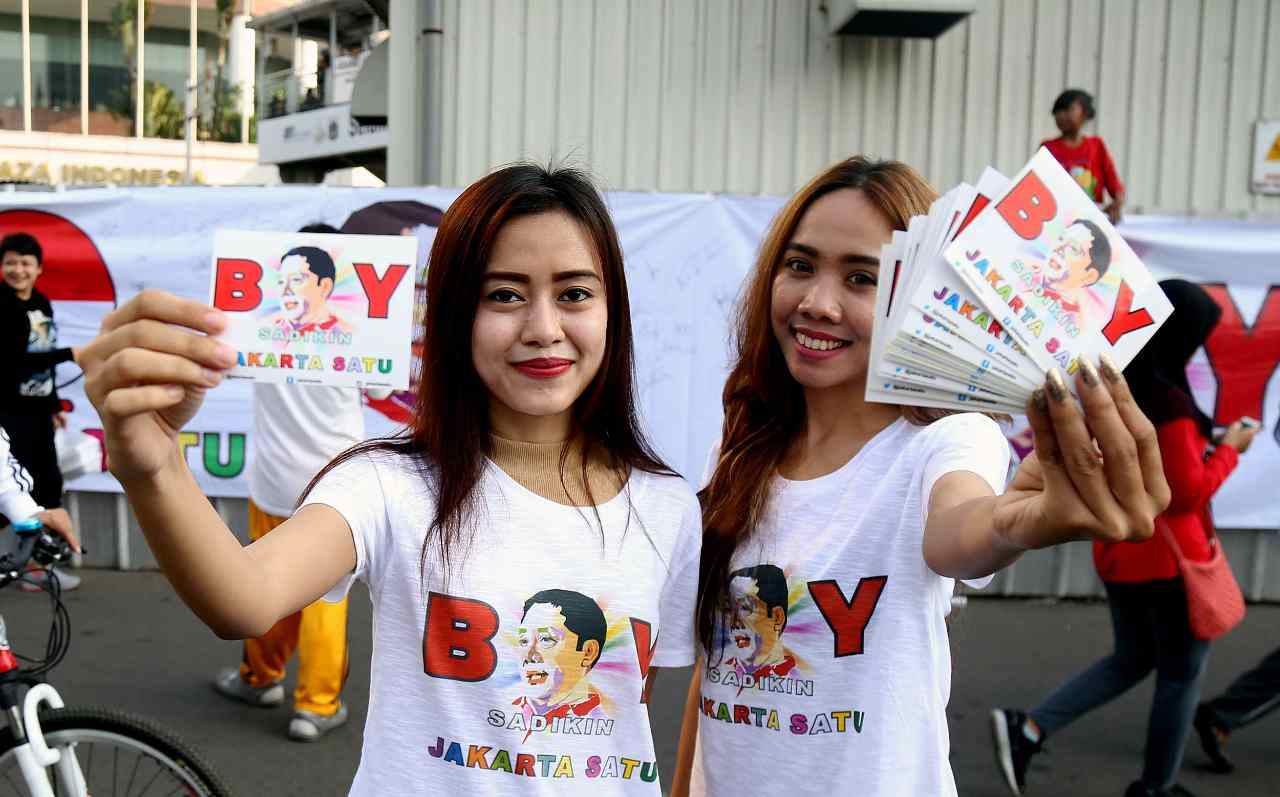 Relawan Jakarata Satu menunjukan sticer dukungan Boy Sadikin untuk menjadi Gubenur DKI Jakarta di acara Car Free Day, Jakarta, Minggu (24/7/2016). Selain melakukan tanda tangan para relawan Boy Sadikin juga memberikan sticer dukungan Boy Sadikin yang bertuliskan " Boy Sadikin Jakarta Satu".