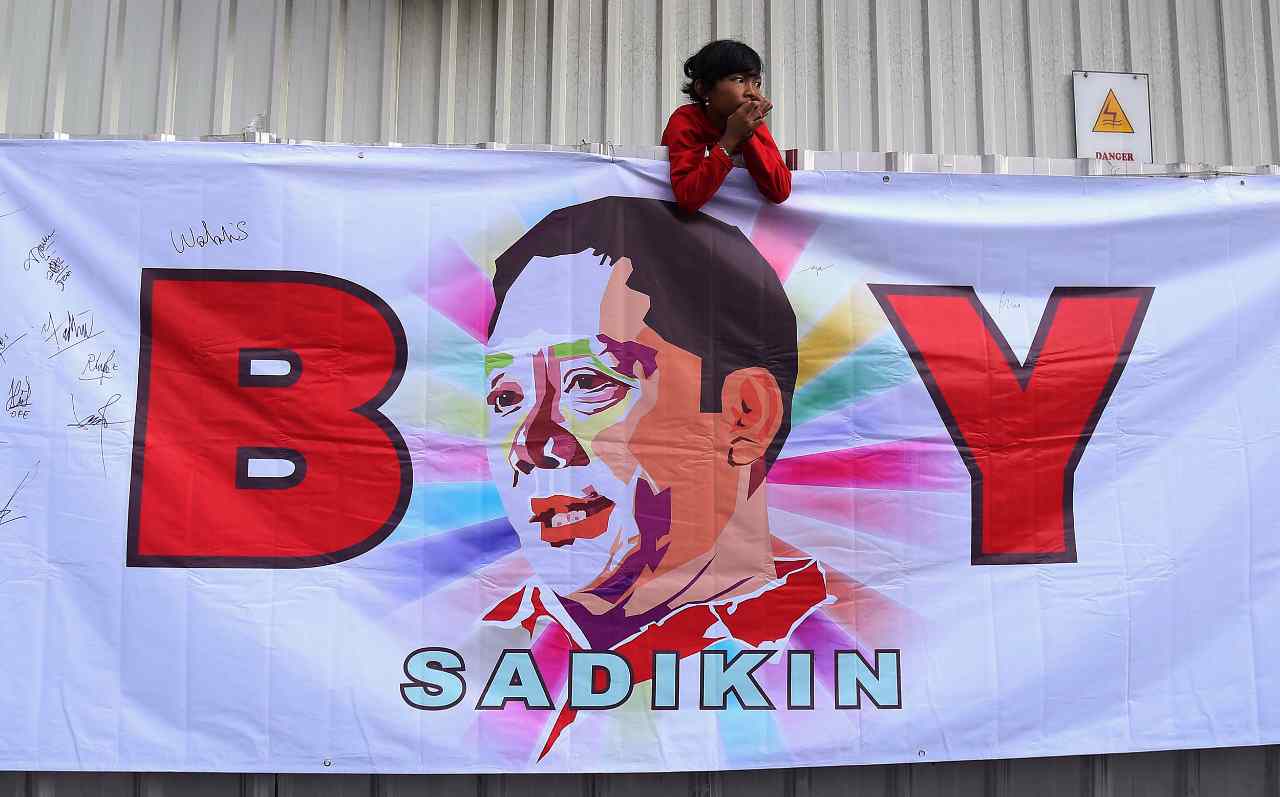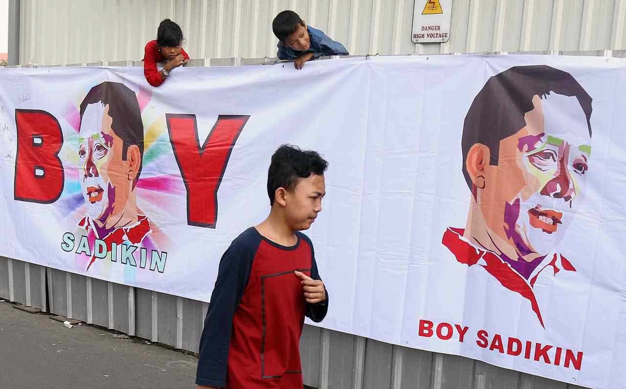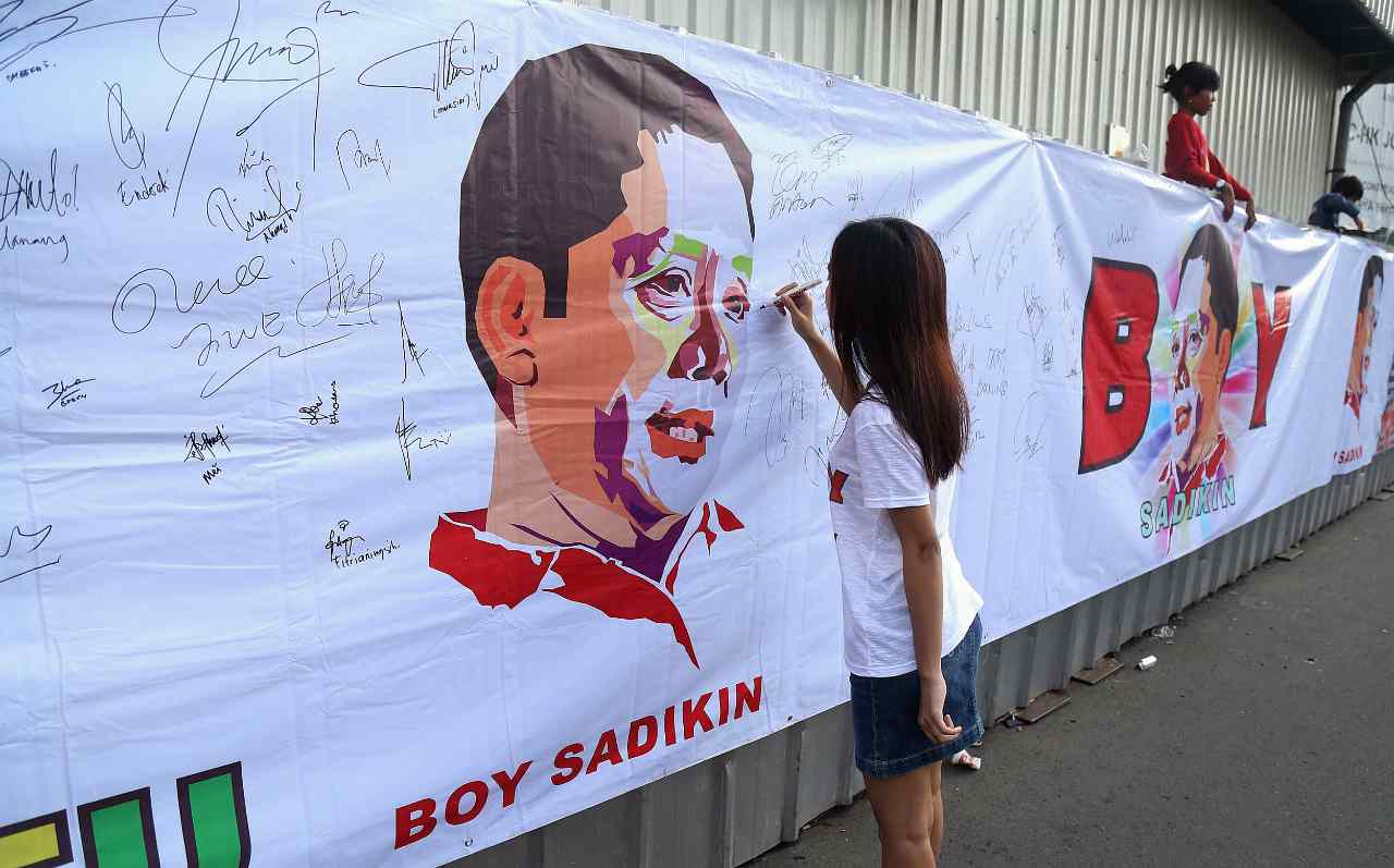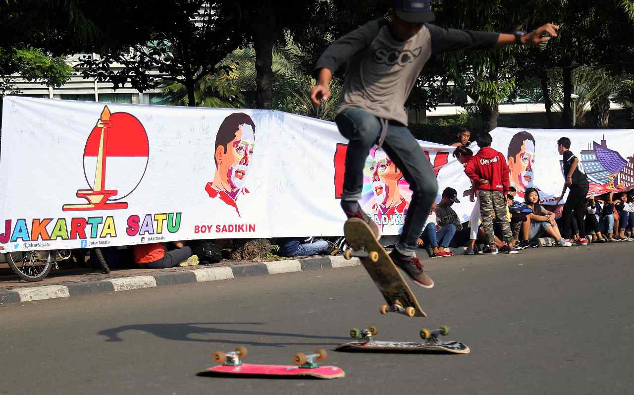 Relawan Jakarata Satu menunjukan sticer dukungan Boy Sadikin untuk menjadi Gubenur DKI Jakarta di acara Car Free Day, Jakarta, Minggu (24/7/2016). Selain melakukan tanda tangan para relawan Boy Sadikin juga memberikan sticer dukungan Boy Sadikin yang bertuliskan " Boy Sadikin Jakarta Satu".