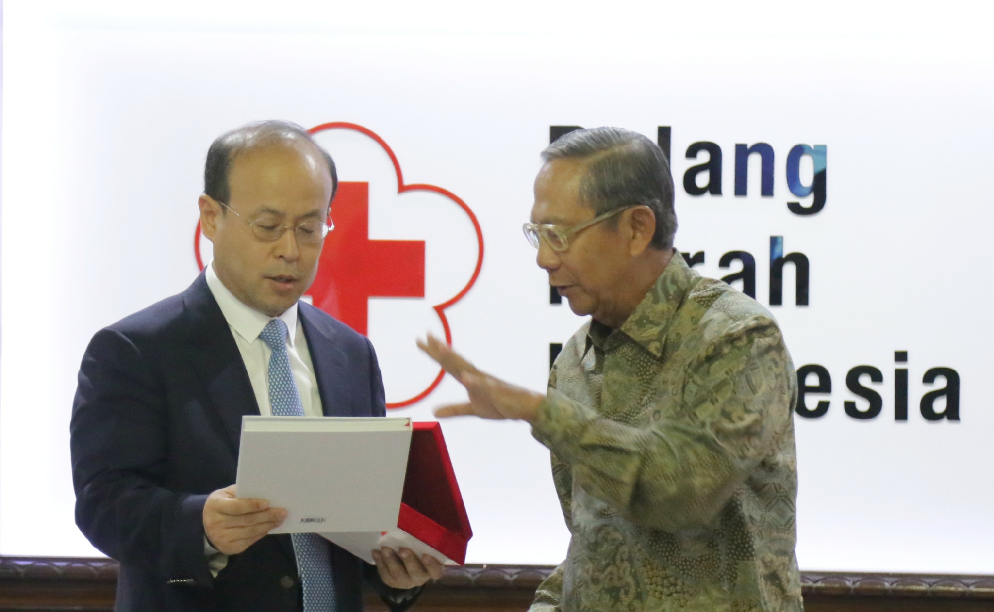 Duta Besar China untuk Indonesia Xiao Qian (kiri) memberikan donasi kepada Pelaksana Harian Ketua Umum Palang Merah Indonesia Ginandjar Kartasasmita (kanan) dari China Embassy untuk korban gempa Lombok di Jakarta, Rabu (8/8/2018). Palang Merah Tiongkok memberikan donasi tunai manusiawi sebesar 100.000 USD kepada Palang Merah Indonesia untuk meringankan korban gempa Lombok. AKTUAL/Tino Oktaviano