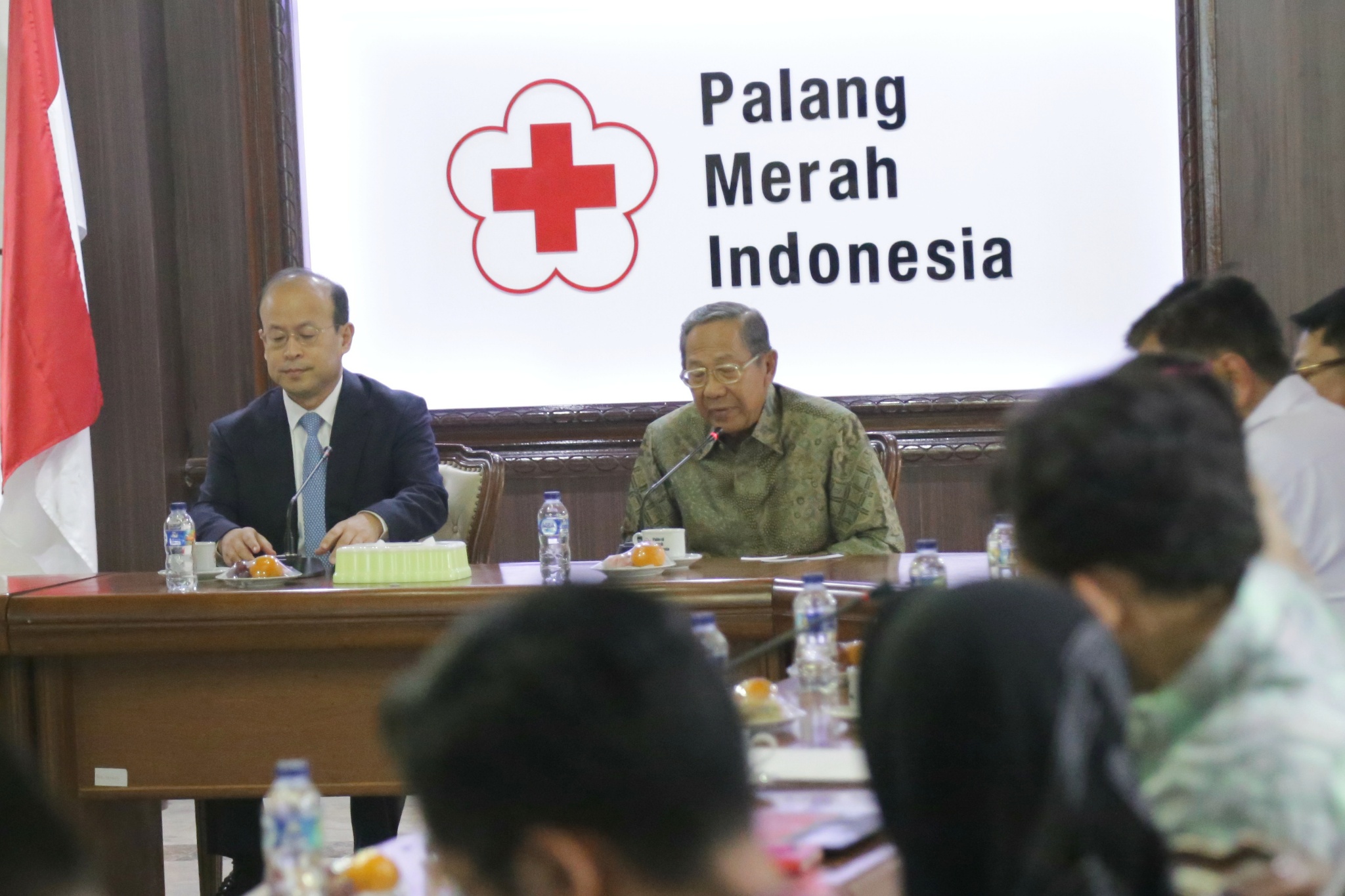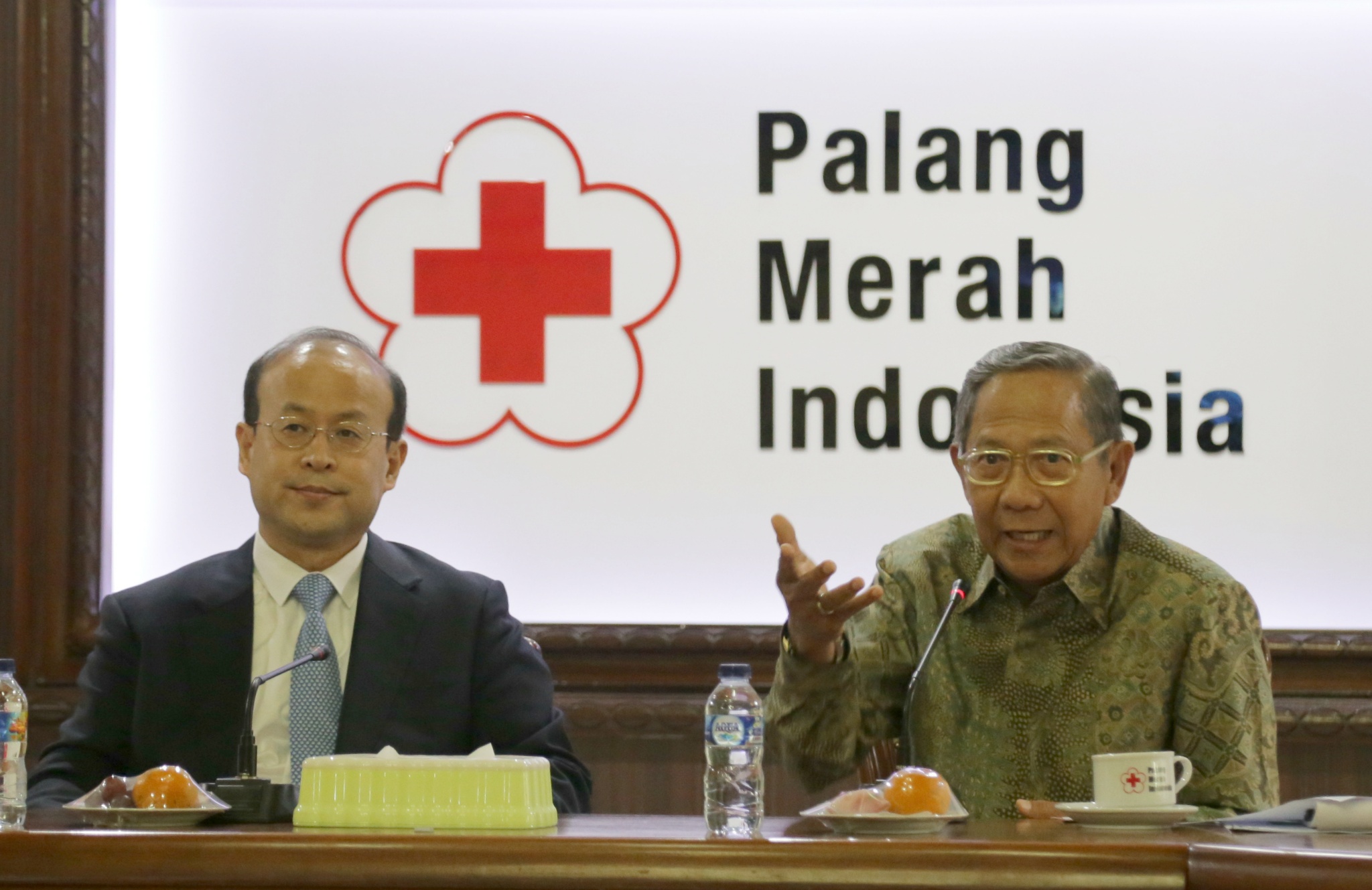 Pelaksana Harian Ketua Umum Palang Merah Indonesia Ginandjar Kartasasmita (kanan) berbincang dengan Duta Besar China untuk Indonesia Xiao Qian (kiri) saat acara pemberian donasi dari China Embassy untuk korban gempa Lombok di Jakarta, Rabu (8/8/2018). Palang Merah Tiongkok memberikan donasi tunai manusiawi sebesar 100.000 USD kepada Palang Merah Indonesia untuk meringankan korban gempa Lombok. AKTUAL/Tino Oktaviano