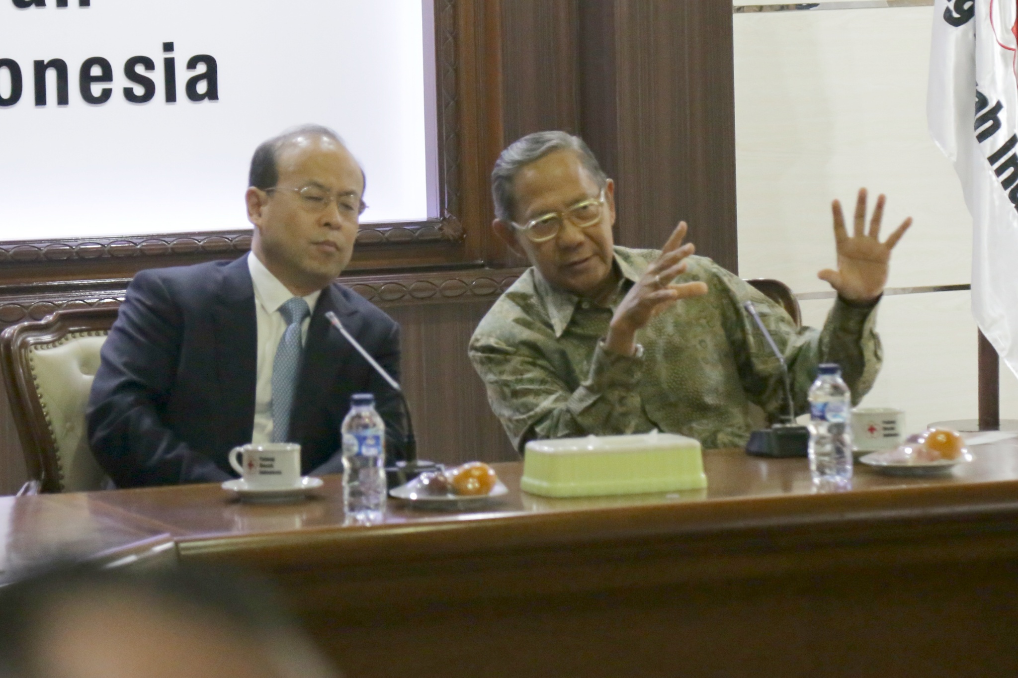Pelaksana Harian Ketua Umum Palang Merah Indonesia Ginandjar Kartasasmita (kanan) berbincang dengan Duta Besar China untuk Indonesia Xiao Qian (kiri) saat menjawab pertanyaan wartawan saat acara pemberian donasi dari China Embassy untuk korban gempa Lombok di Jakarta, Rabu (8/8/2018). Palang Merah Tiongkok memberikan donasi tunai manusiawi sebesar 100.000 USD kepada Palang Merah Indonesia untuk meringankan korban gempa Lombok. AKTUAL/Tino Oktaviano