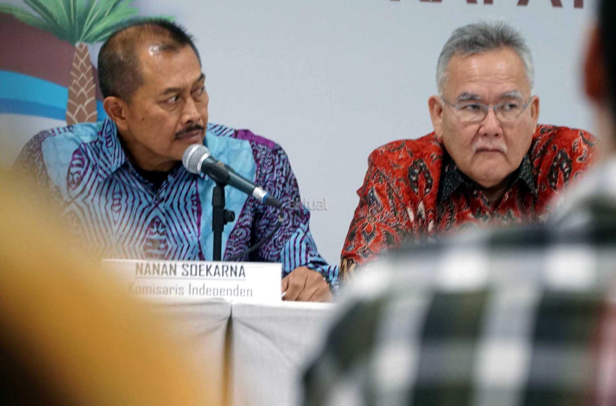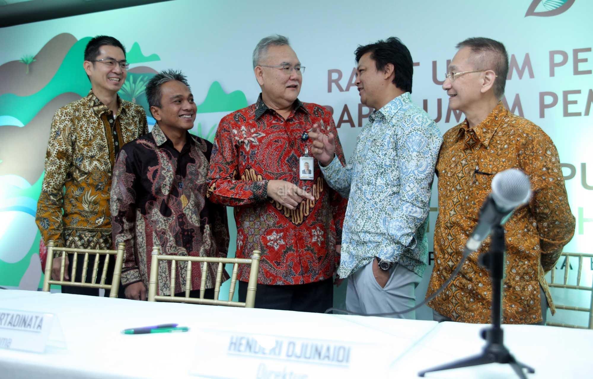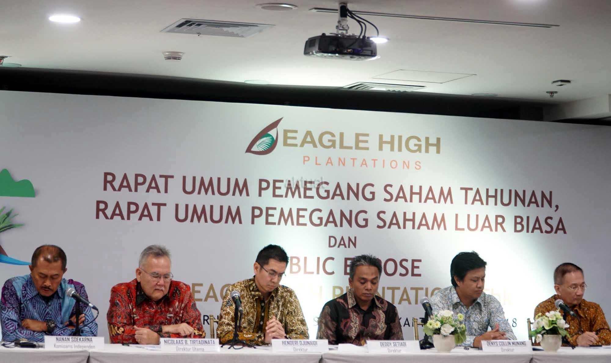 Dari kiri ke kanan, Direktur PT Eagle High Plantations Tbk (BWPT) Henderi Djunaidi, Direktur Deddy Setiadi, Dirut Nicolaas B. Tirtadinata Direktur Denys Collin Munang dan Direktur Independen Yap Tjay Soen saat penyelenggaraan Rapat Umum Pemegang Saham Tahunan di Sampoerna Startegic, Jakarta, Kamis (31/5). PT Eagle High Plantations Tbk (BWPT) berencana membangun pabrik kelapa sawit (PKS) baru di Kalimantan Timur. Pabrik ke-10 ini bakal memiliki kapasitas olah 60 ton per jam dan akan mulai dibangun pada kuartal IV-2018. Disamping membangun pabrik baru, BWPT juga berencana membangun bulking station di Kalimantan Timur. Bulking station ini rencananya memiliki kapasitas simpan sebesar 4.000 metrik ton. AKTUAL/Eko S Hilman