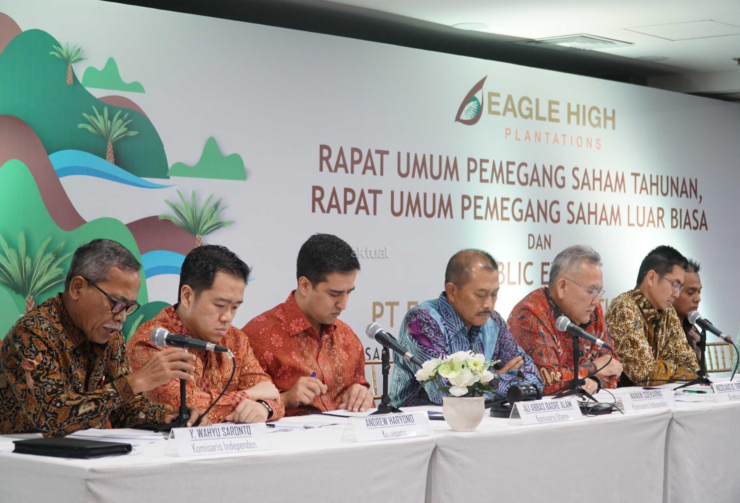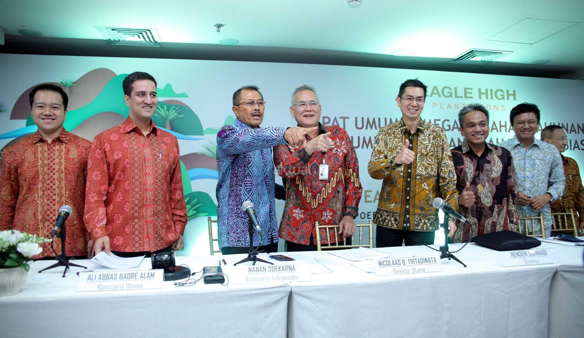 Komisaris PT Eagle High Plantations Tbk (BWPT) Andrew Haryono, Komisaris Utama Ali Abbas Alam, Komisaris Independen Nanan Soekarna, Direktur Utama Nicolaas B. Tirtadinata, Direktur Henderi Djunaidi, Direktur Deddy Setiadi, Direktur Denys Collin Munang dan Direktur Independen Yap Tjay Soen saat penyelenggaraan Rapat Umum Pemegang Saham Tahunan di Sampoerna Startegic, Jakarta, Kamis (31/5). PT Eagle High Plantations Tbk (BWPT) berencana membangun pabrik kelapa sawit (PKS) baru di Kalimantan Timur. Pabrik ke-10 ini bakal memiliki kapasitas olah 60 ton per jam dan akan mulai dibangun pada kuartal IV-2018. Disamping membangun pabrik baru, BWPT juga berencana membangun bulking station di Kalimantan Timur. Bulking station ini rencananya memiliki kapasitas simpan sebesar 4.000 metrik ton. AKTUAL/Eko S Hilman