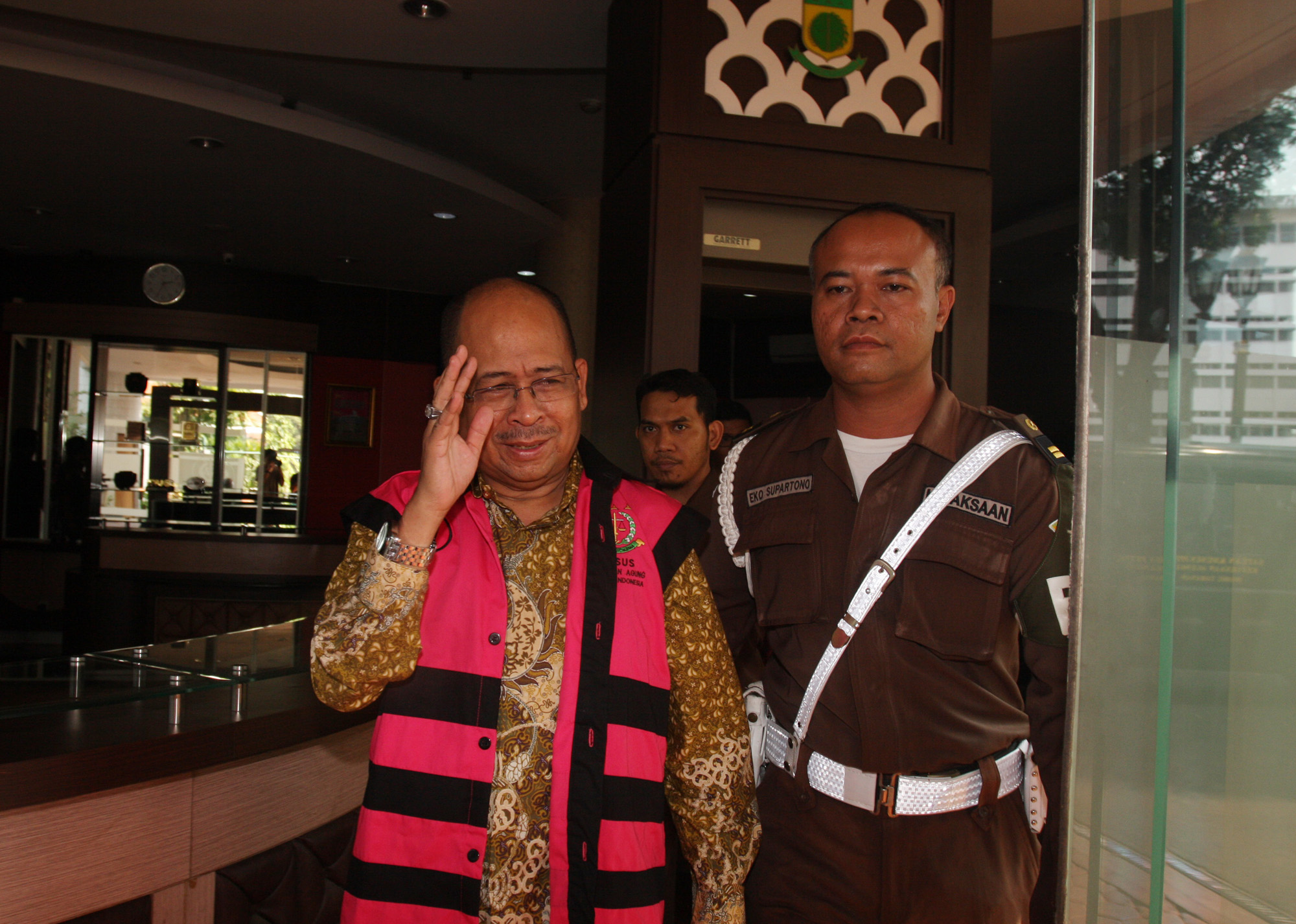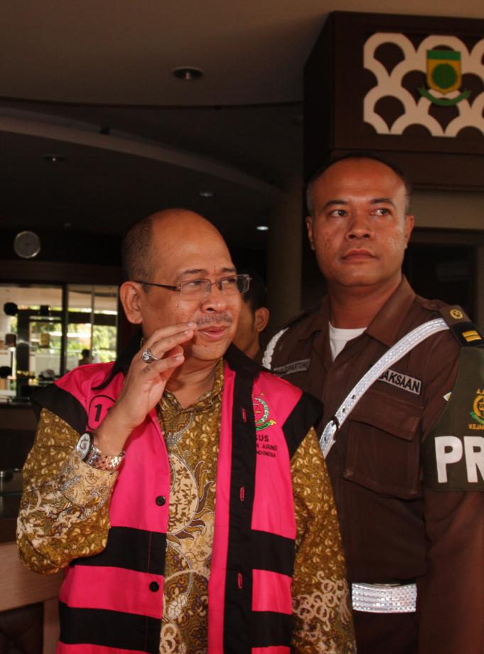 Mantan Direktur Keuangan Lembaga Penyiaran Publik TVRI Eddy Machmudi Efendi (kiri) mengenakan baju tahanan ketika keluar usai menjalani pemeriksaan di Gedung Bundar, Kejaksaan Agung, Jakarta Selatan, Rabu (5/8). Kejaksaan Agung menahan Eddy Machmudi Efendi terkait kasus dugaan korupsi pengadaan Acara Siap Siar TVRI tahun anggaran 2012, yang diduga merugikan negara sekitar Rp 3,7 miliar.ANTARA FOTO/Reno Esnir/pd/15.