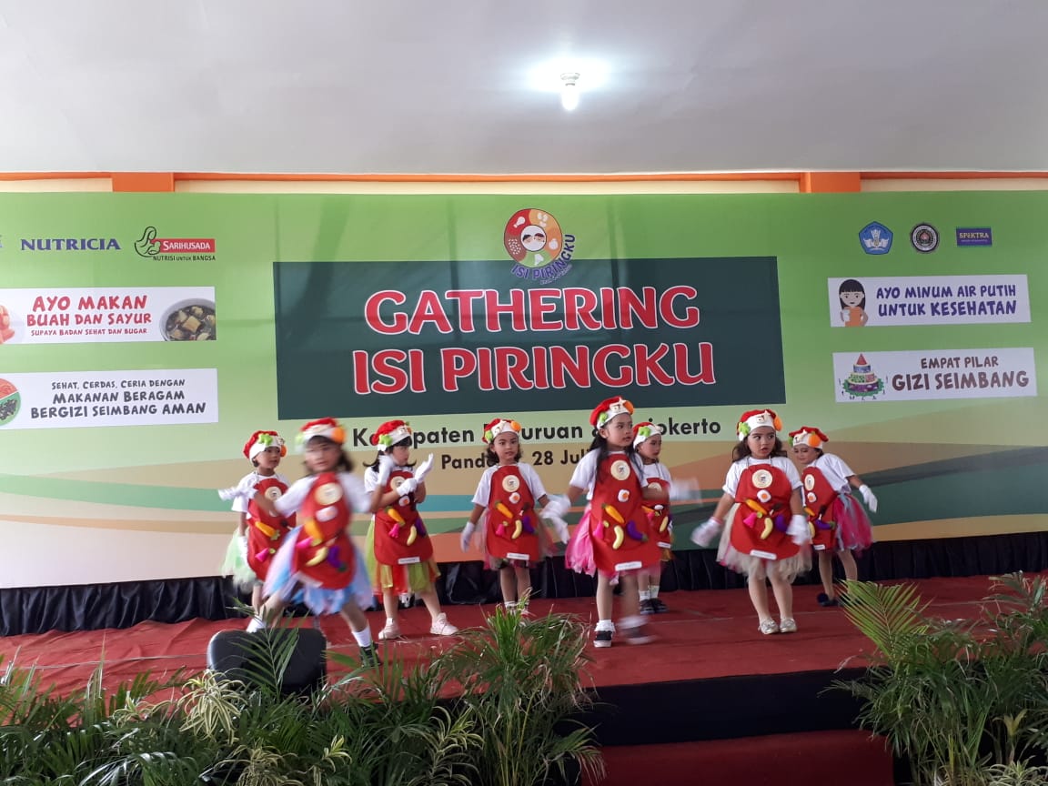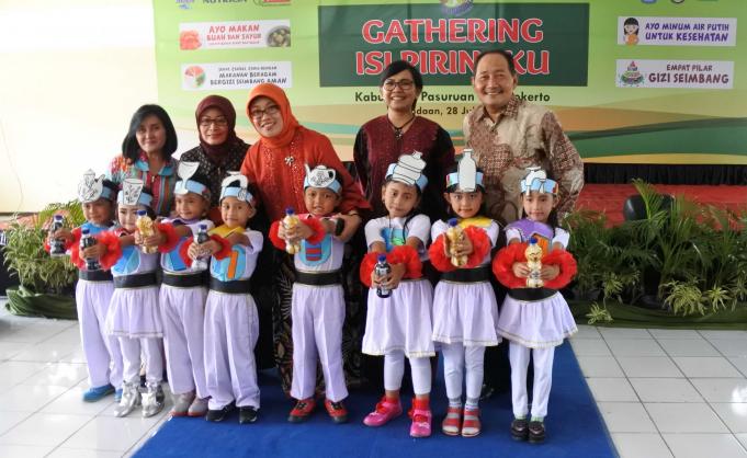 Wailayati Ningsih dari Danone Indonesia (dua dari kanan) didampingi oleh Ibu Bupati Pasuruan Hj. Lulis Irsyad Yusuf (tengah), Istri Camat Pandaan (dua dari kiri) serta Direktur Spektra Roni Syahroni dalam Gathering PAUD Program Isi Piringku di Pandaan Pasuruan, Jawa Timur, Sabtu (28/7/2018). Danone Indonesia dalam kegiatan ini mengapresiasi sekolah terbaik, guru terbaik dan orang tua terbaik dari 30 sekolah di Kota Mojokerto dan 10 sekolah di Kabupaten Pasuruan yang terlibat dalam kampanye edukasi “Isi Piringku - Panduan Makan Bergizi Seimbang Anak PAUD/TK usia 4 - 6 tahun”. Selain pola makan bergizi seimbang termasuk di dalamnya minum susu 2 gelas sehari, pola asuh yang baik juga bisa mendorong praktik yang konsisten. AKTUAL/HO