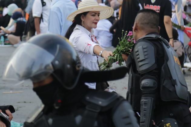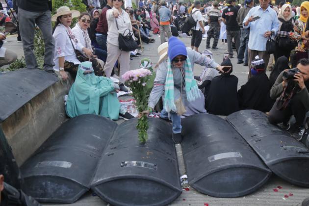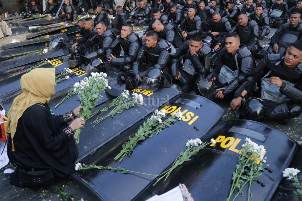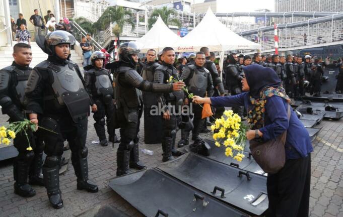 Sejumlah emak-emak membagikan bunga di depan Bawaslu, Jakarta, Selasa (21/5/2019). Mereka membagikan bunga kepada polisi yang tengah bertugas. AKTUAL/Tino Oktaviano