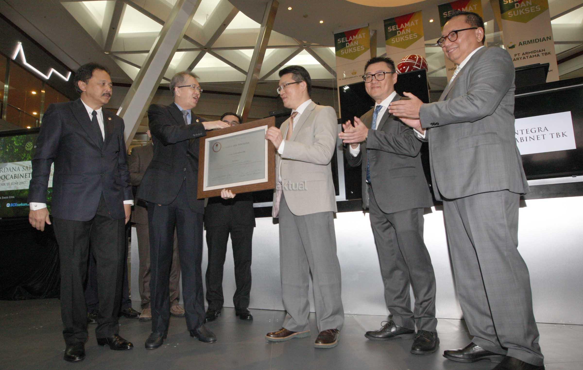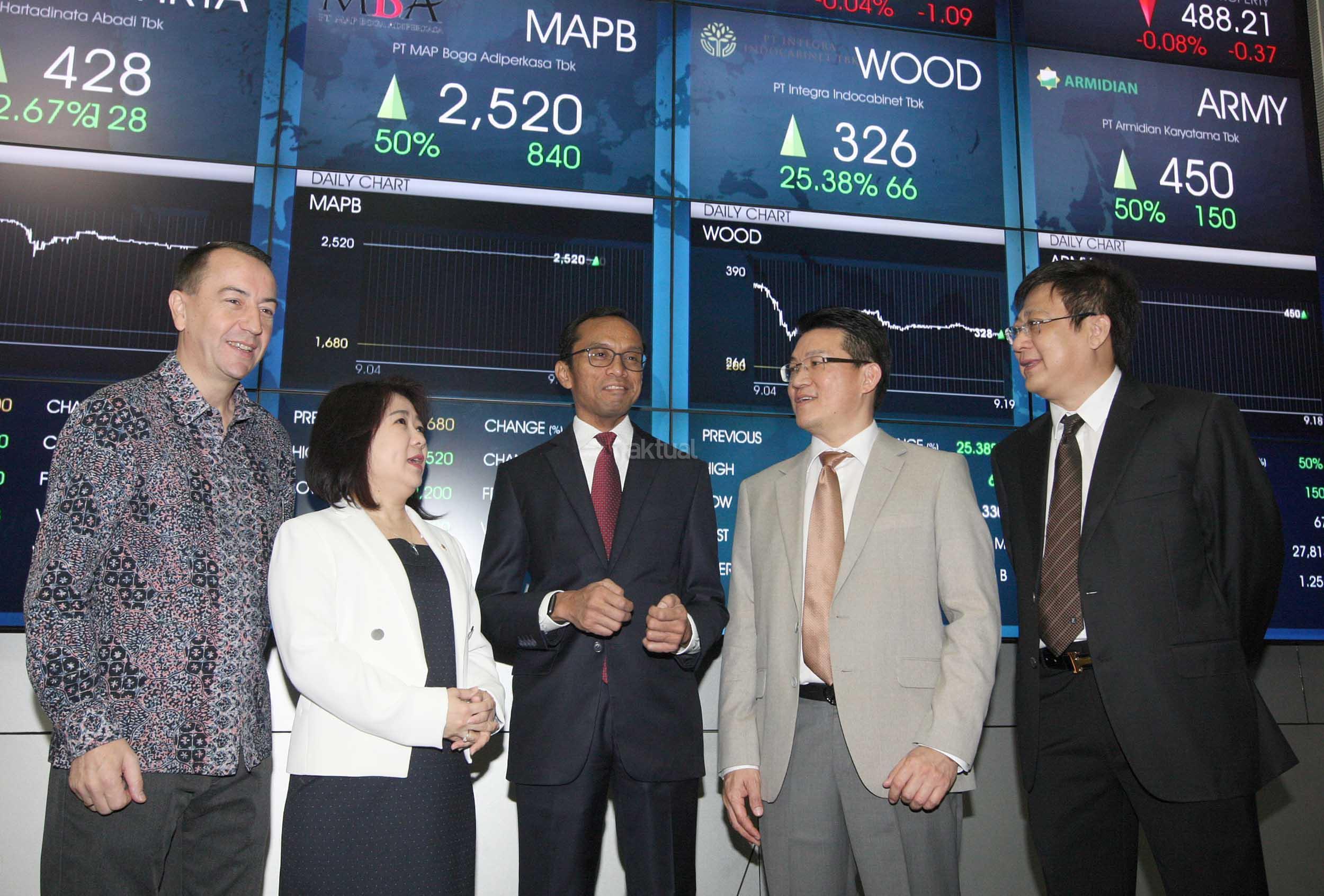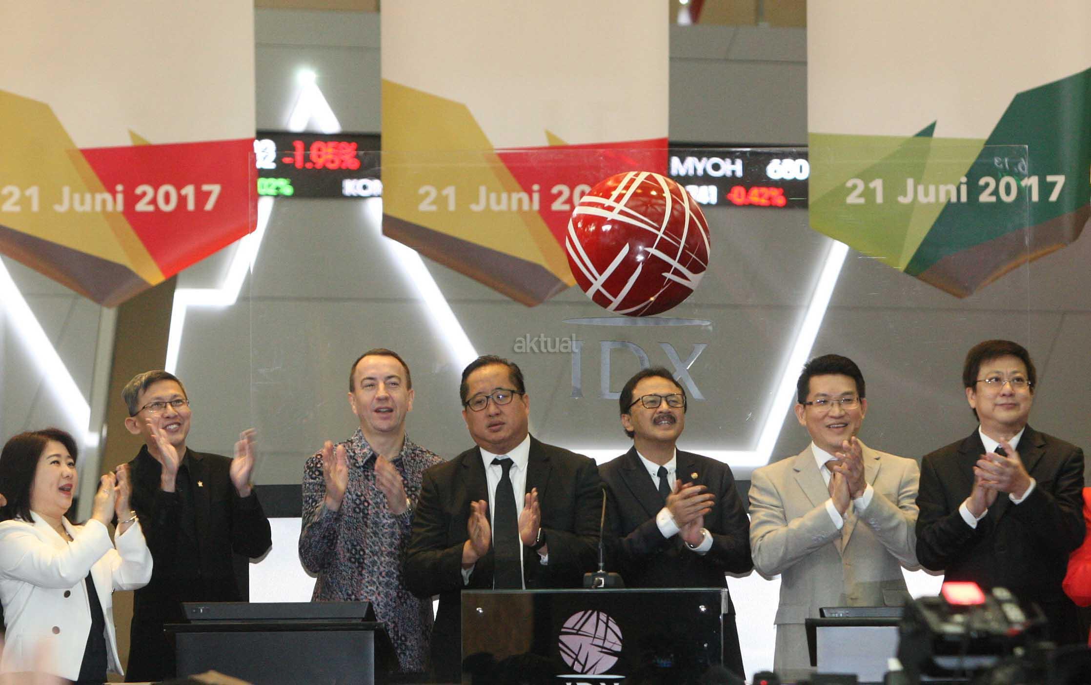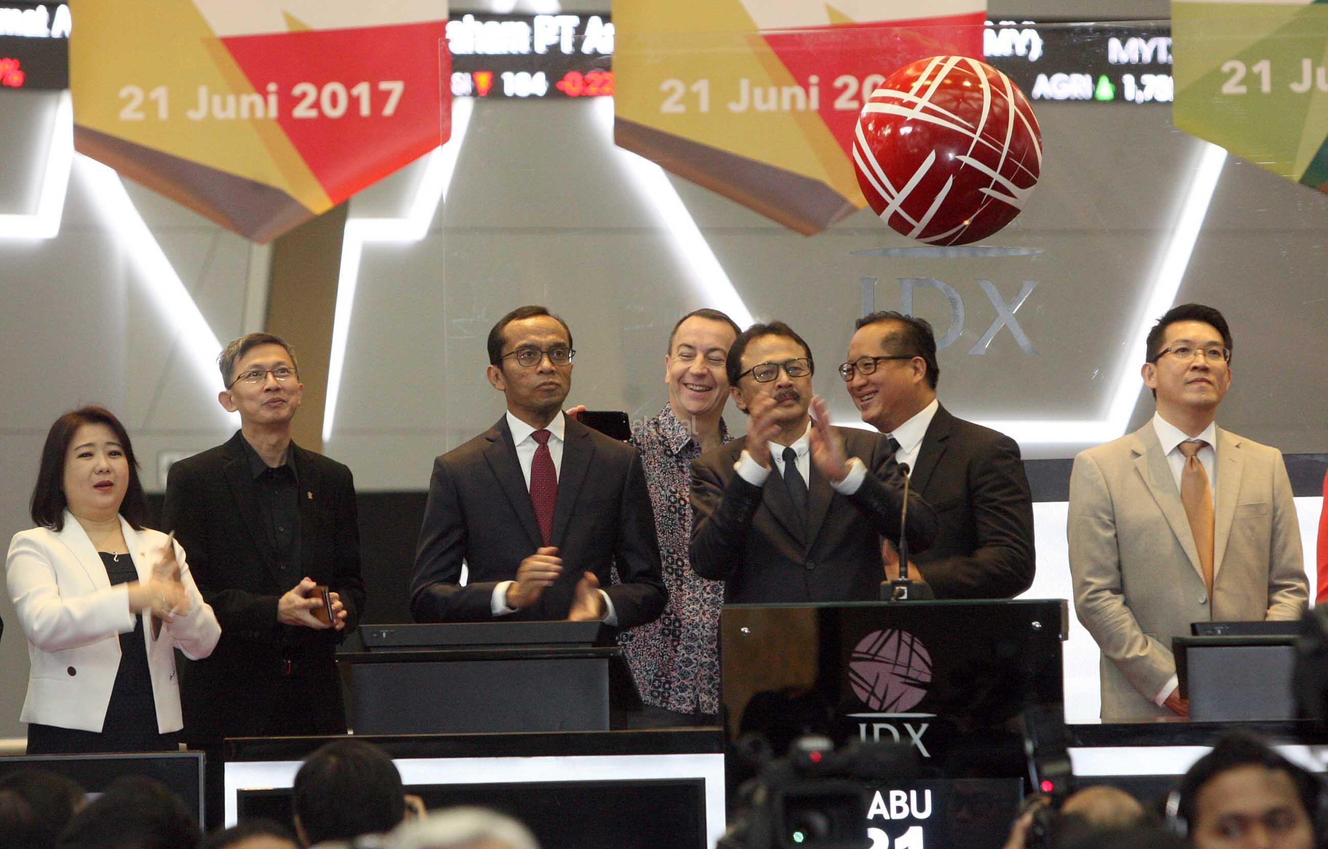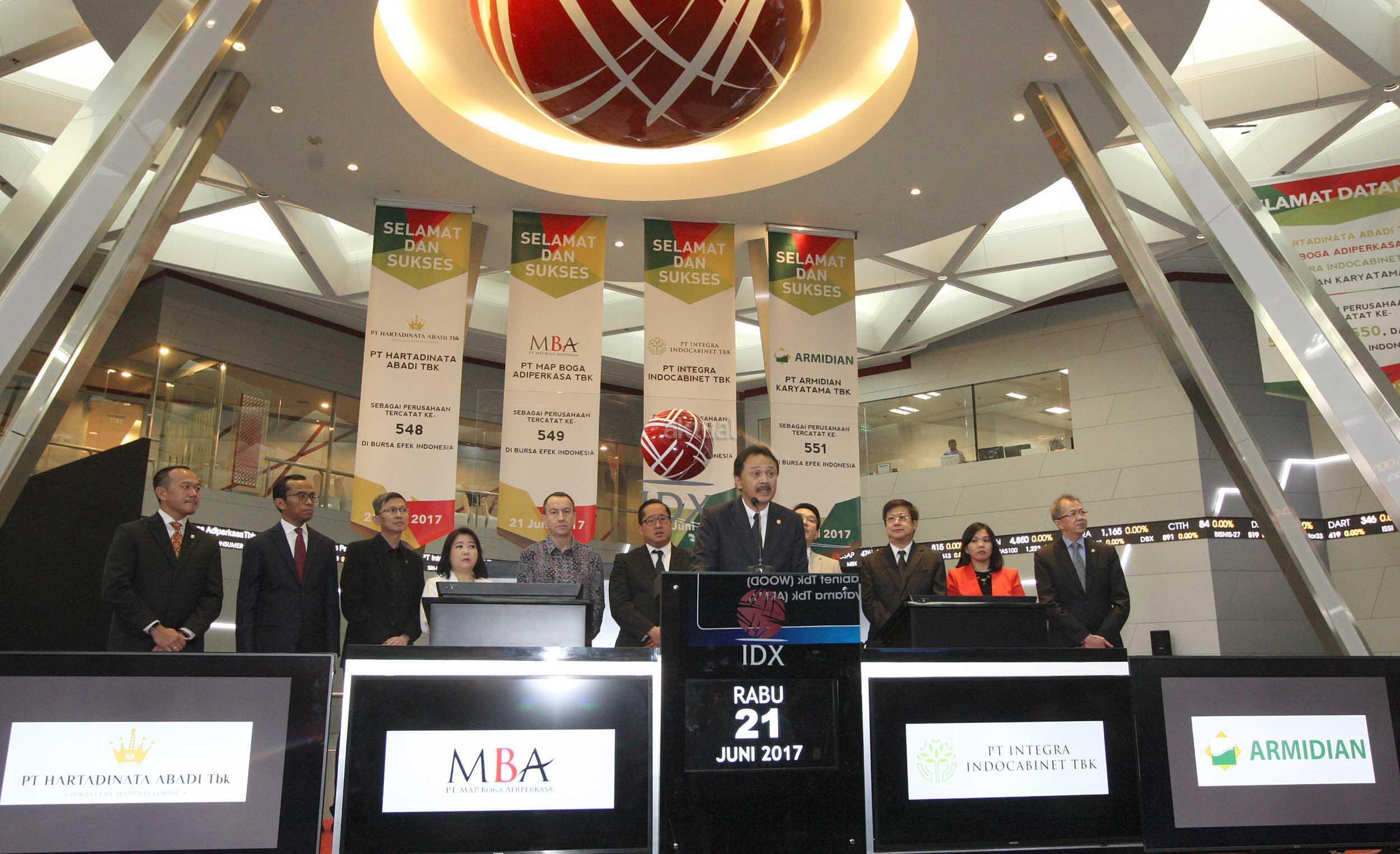 Direktur Utama BEI Tito Sulistio (ketiga dari kanan) bersama para jajaran direksi emiten empat perusahaan melihat papan perdagangan usai pencatatan saham perdana di Bursa Efek Indonesia di Jakarta, Rabu (21/6/2017). Bursa mencatatkan perdagangan perdana empat emiten sekaligus masing masing PT Integra Indocabinet Tbk, PT Hartadinata Abadi Tbk, PT MAP Boga Adiperkasa Tbk, dan PT Armidian Karyatama Tbk. Listing empat perusahaan terbuka tersebut menjadi catatan sendiri bagi sejarah bursa di Indonesia karena baru kali pertama mencatat sekaligus empat emiten. AKTUAL/Eko S Hilman