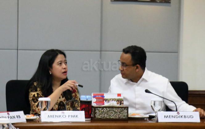 Menteri Kordinator Pembangunan Manusia Dan Kebudayaan Puan Maharani (kiri) berbincang dengan Menteri Pendidikan Dan Kebudayaan Anis Baswedan saat hadir dalam acara Rapat Koordinasi Implementasi UU No. 23 Tahun 2014 di Jakarta, Kamis (14/4/2016). Dalam rakor tersebut dibahas tentang kesiapan pengalihan wewenang pengelolaan pendidikan dari tingkat kabupaten hingga provinsi yang akan dilaksanakan 1 Oktober 2016 - 1 Januari 2017.