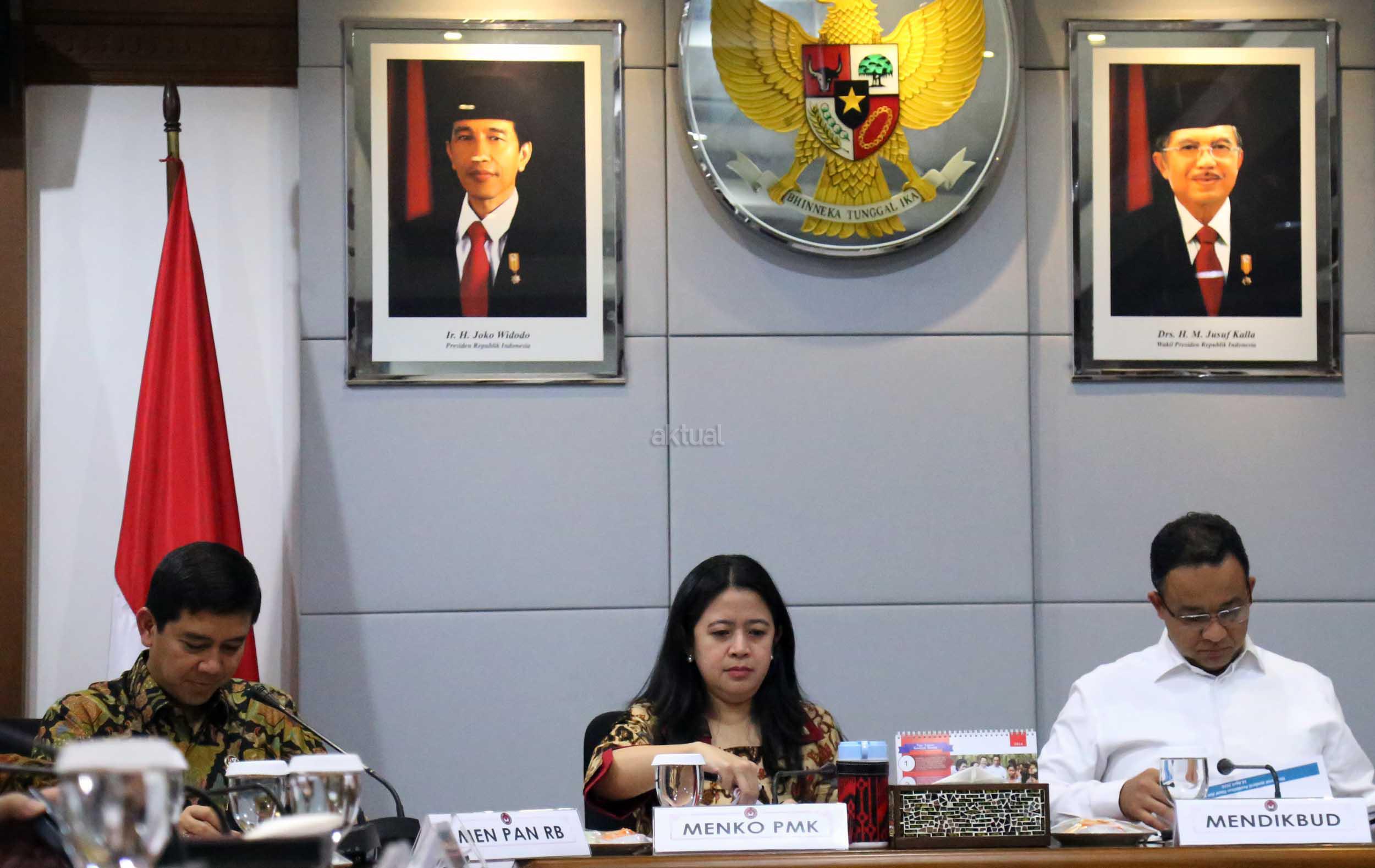 Menteri Pendayagunaan Aparatur Negara Dan Reformasi Birokrasi Yuddy Chrisnandi (kiri), Menteri Kordinator Pembangunan Manusia Dan Kebudayaan Puan Maharani (tengah) Menteri Pendidikan Dan Kebudayaan Anis Baswedan menghadiri Rapat Koordinasi Implementasi UU No. 23 Tahun 2014 di Jakarta, Kamis (14/4/2016). Dalam rakor tersebut dibahas tentang kesiapan pengalihan wewenang pengelolaan pendidikan dari tingkat kabupaten hingga provinsi yang akan dilaksanakan1 Oktober 2016-1Januari 2017.