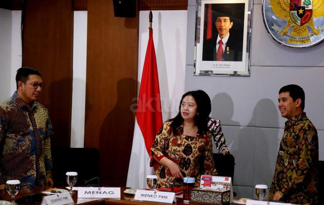 Menag Lukman Hakim (kiri), Menko PMK Puan Maharani (tengah), Menpan RB Yuddy Chrisnandi (kiri) saat menghadiri rapat penetapan Libur Nasional dan Cuti Bersama tahun 2017,di kantor Menko PMK, Jakarta, Kamis (14/4/2016). Hasil petetapan SKB tiga Menteri bahawa Hari Libur Nasional sebanyak 15 hari dan cuti bersama sebanyak 4 hari untuk Hari Raya Idul Fitri 1438 dan Natal.