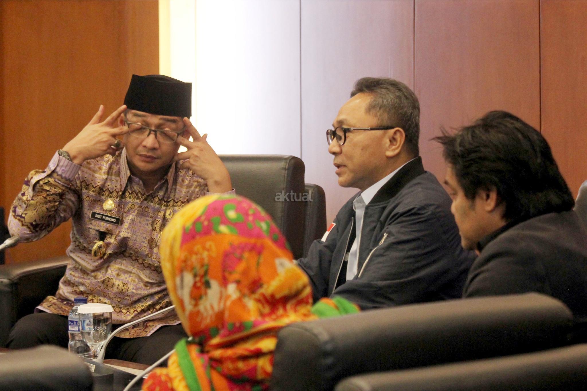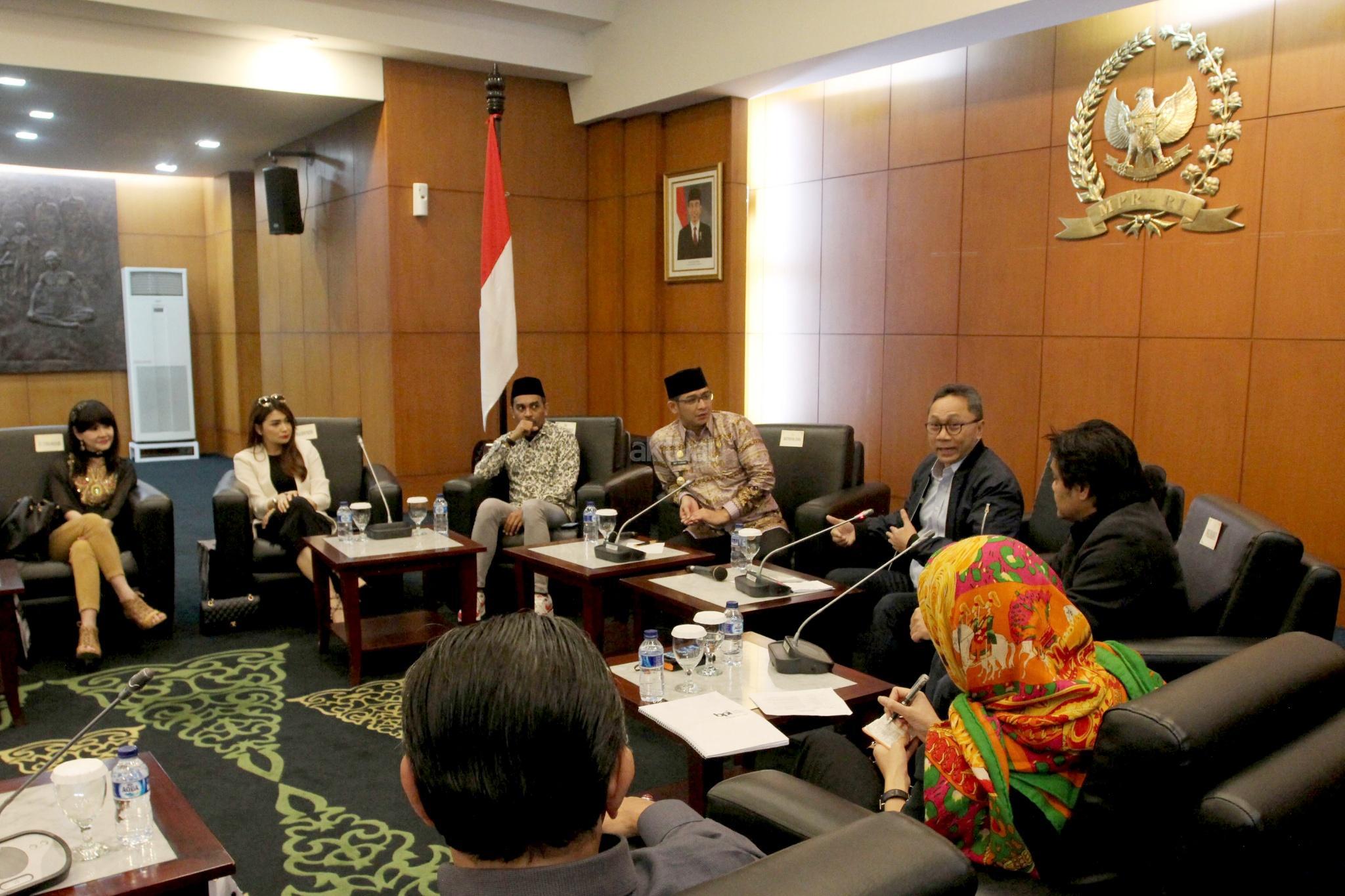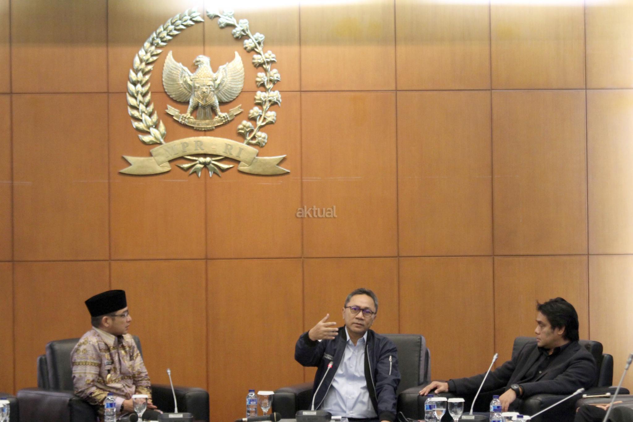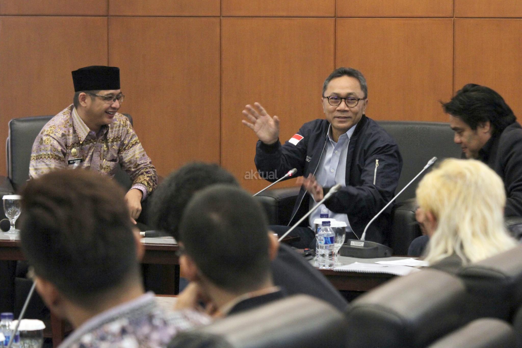Ketua MPR Zulkifli Hasan (tengah) menerima kunjungan Musisi Dwiki Darmawan (kanan) dan Wakil Walikota Palu Pasha Ungu (kiri) bersama sejumlah Musisi dan Bintang Film lintas generasi diantaranya Musisi Dwiki Darmawan, Ita Purnamasari, Pasha Ungu, Glenn Fredly, Aaliya Ajie Massaid, Indah Dewi Pertiwi, Bintang Film Ray Sahetapy, Marcella Zalianty Ramzi dan Chacha Frederica, di ruang Delegasi Gedung Nusnatara V, Kompleks Parlemen Senayan, Jakarta, Rabu (21/2). Selain membicarakan soal perkembangan Film Nasional dan Perayaan Hari Musik Nasional yang akan dilaksanakan di Ambon pada 9 Maret 2018 mendatang, Zulkifli meminta Musisi dan Artis untuk selalu menyampaikan pentingnya nilai-nilai empat Pilar Pancasila, UUD 1945, Bhineka Tunggal Ika dan NKRI, dalam dunia musik, film dan hiburan karena musik, film dan hiburan merupakan saluran yang paling fleksibel dan bisa masuk kesemua kalangan dalam sendi kehidupan masyarakat. AKTUAL/Tino Oktaviano