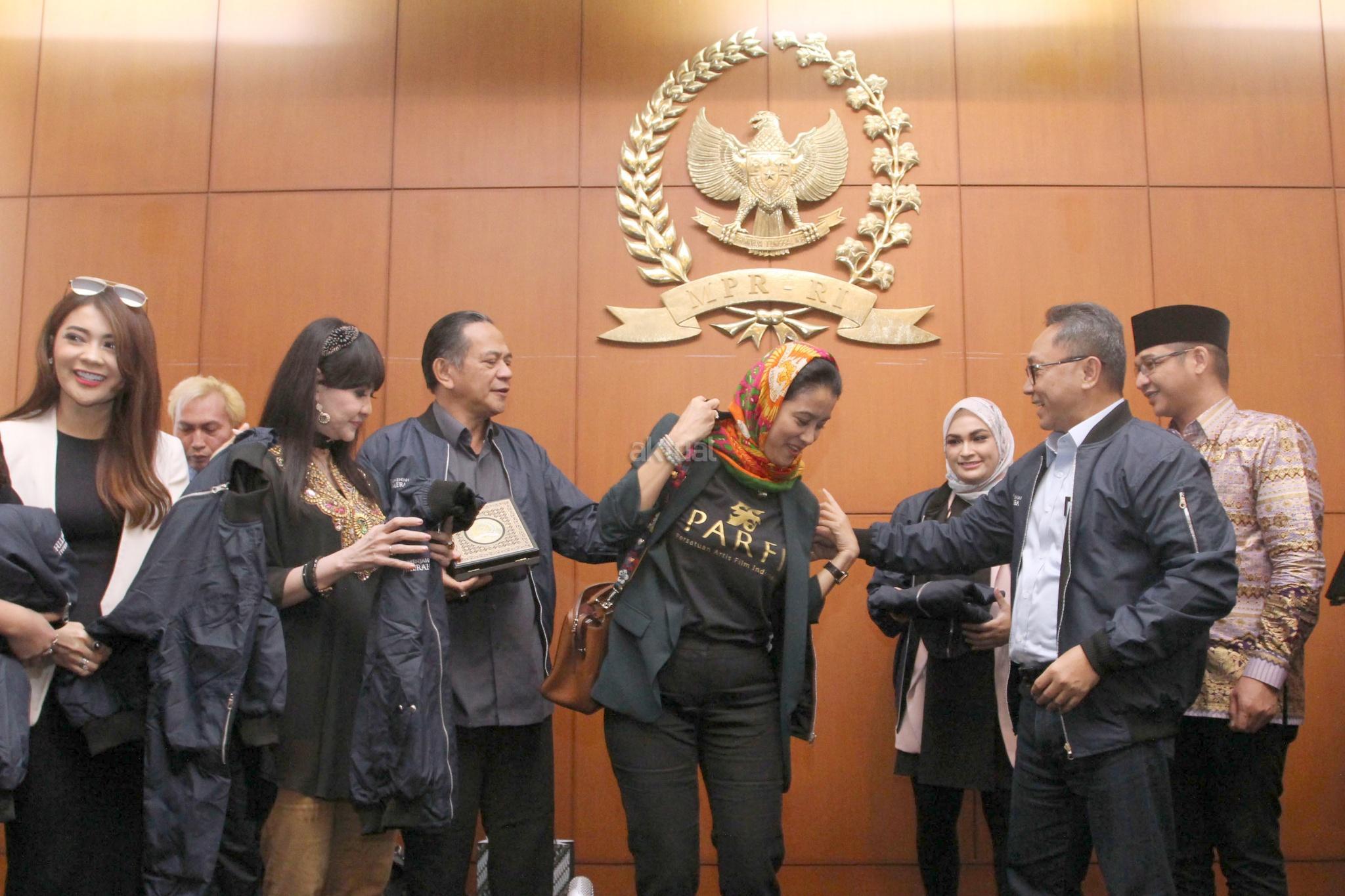 Ketua MPR Zulkifli Hasan (kedua dari kanan) memakaikan Jaket Merajut Kembali Merah Putih kepada Artis Marcella Zalianty (tengah) dan sejumlah Musisi dan Bintang Film lintas generasi diantaranya Musisi Dwiki Darmawan, Ita Purnamasari, Pasha Ungu, Aaliya Ajie Massaid, Indah Dewi Pertiwi, Bintang Film Ray Sahetapy, Marcella Zalianty Ramzi dan Chacha Frederica, usai melakukan pertemuan di ruang Delegasi Gedung Nusnatara V, Kompleks Parlemen Senayan, Jakarta, Rabu (21/2). Selain membicarakan soal perkembangan Film Nasional dan Perayaan Hari Musik Nasional yang akan dilaksanakan di Ambon pada 9 Maret 2018 mendatang, Zulkifli meminta Musisi dan Artis untuk selalu menyampaikan pentingnya nilai-nilai empat Pilar Pancasila, UUD 1945, Bhineka Tunggal Ika dan NKRI, dalam dunia musik, film dan hiburan karena musik, film dan hiburan merupakan saluran yang paling fleksibel dan bisa masuk kesemua kalangan dalam sendi kehidupan masyarakat. AKTUAL/Tino Oktaviano