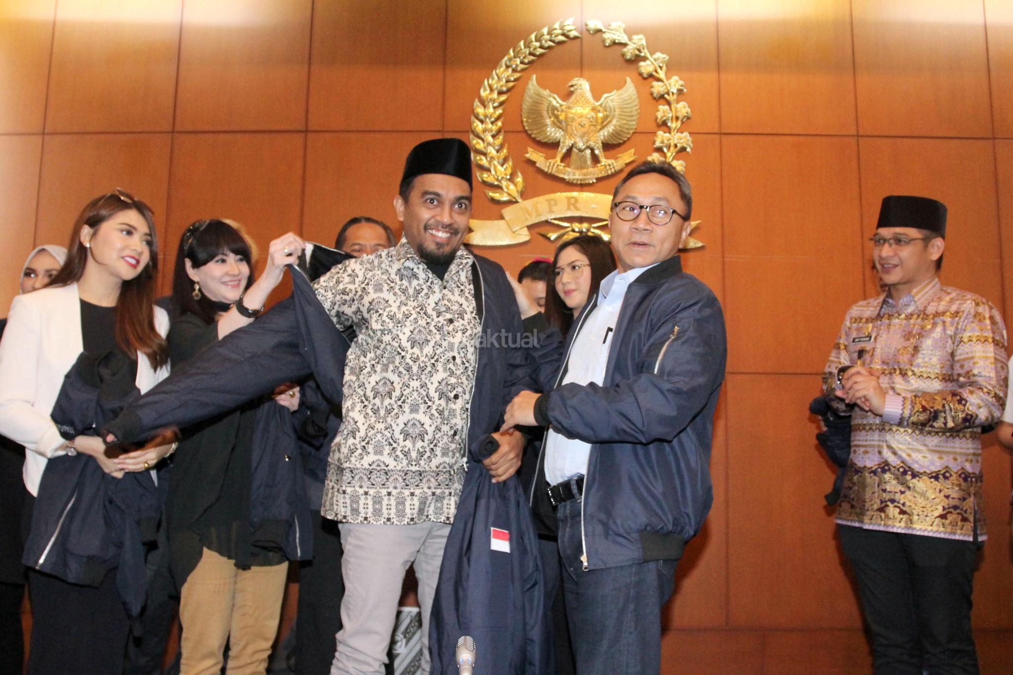 Ketua MPR Zulkifli Hasan (kedua dari kanan) memakaikan Jaket Merajut Kembali Merah Putih kepada Musisi Glenn Fredly (tengah) dan sejumlah Musisi dan Bintang Film lintas generasi diantaranya Musisi Dwiki Darmawan, Ita Purnamasari, Pasha Ungu, Aaliya Ajie Massaid, Indah Dewi Pertiwi, Bintang Film Ray Sahetapy, Marcella Zalianty Ramzi dan Chacha Frederica, usai melakukan pertemuan di ruang Delegasi Gedung Nusnatara V, Kompleks Parlemen Senayan, Jakarta, Rabu (21/2). Selain membicarakan soal perkembangan Film Nasional dan Perayaan Hari Musik Nasional yang akan dilaksanakan di Ambon pada 9 Maret 2018 mendatang, Zulkifli meminta Musisi dan Artis untuk selalu menyampaikan pentingnya nilai-nilai empat Pilar Pancasila, UUD 1945, Bhineka Tunggal Ika dan NKRI, dalam dunia musik, film dan hiburan karena musik, film dan hiburan merupakan saluran yang paling fleksibel dan bisa masuk kesemua kalangan dalam sendi kehidupan masyarakat. AKTUAL/Tino Oktaviano