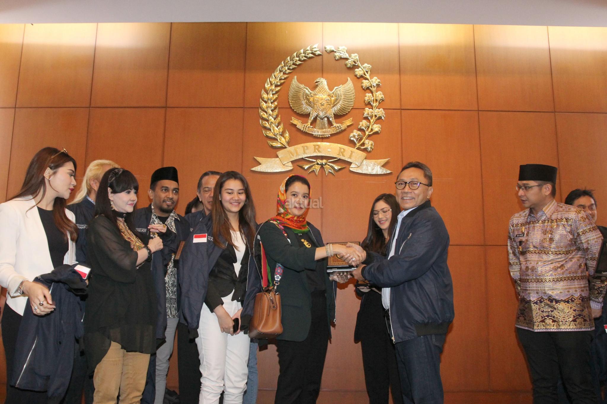 Ketua MPR Zulkifli Hasan (tengah) menerima sejumlah Musisi dan Bintang Film lintas generasi diantaranya Musisi Dwiki Darmawan, Ita Purnamasari, Pasha Ungu, Glenn Fredly, Aaliya Ajie Massaid, Indah Dewi Pertiwi, Bintang Film Ray Sahetapy, Marcella Zalianty Ramzi dan Chacha Frederica, usai melakukan pertemuan di ruang Delegasi Gedung Nusnatara V, Kompleks Parlemen Senayan, Jakarta, Rabu (21/2). Selain membicarakan soal perkembangan Film Nasional dan Perayaan Hari Musik Nasional yang akan dilaksanakan di Ambon pada 9 Maret 2018 mendatang, Zulkifli meminta Musisi dan Artis untuk selalu menyampaikan pentingnya nilai-nilai empat Pilar Pancasila, UUD 1945, Bhineka Tunggal Ika dan NKRI, dalam dunia musik, film dan hiburan karena musik, film dan hiburan merupakan saluran yang paling fleksibel dan bisa masuk kesemua kalangan dalam sendi kehidupan masyarakat. AKTUAL/Tino Oktaviano