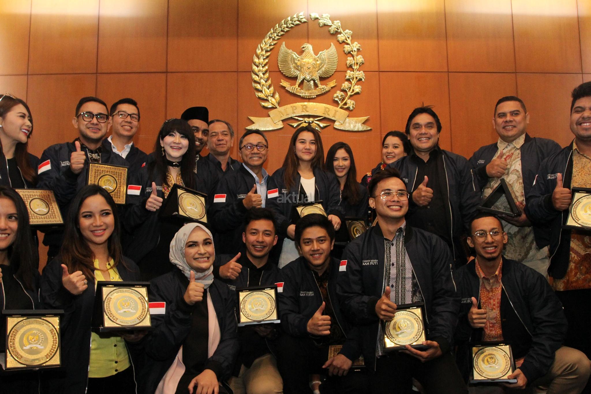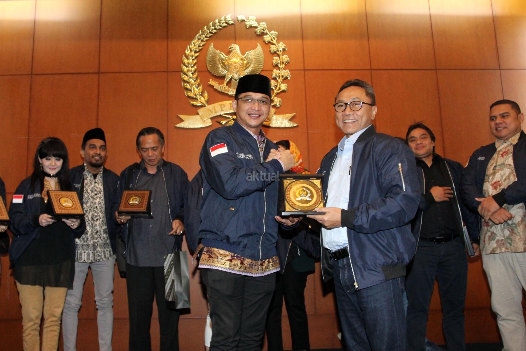 Ketua MPR Zulkifli Hasan (kanan depan) menyerahkan plakat kepada Wakil Walikota Palu yang juga Musisi Pasha Ungu (kiri depan) dan sejumlah Musisi dan Bintang Film lintas generasi diantaranya Musisi Dwiki Darmawan, Ita Purnamasari, Glenn Fredly, Aaliya Ajie Massaid, Indah Dewi Pertiwi, Bintang Film Ray Sahetapy, Marcella Zalianty Ramzi dan Chacha Frederica, usai melakukan pertemuan di ruang Delegasi Gedung Nusnatara V, Kompleks Parlemen Senayan, Jakarta, Rabu (21/2). Selain membicarakan soal perkembangan Film Nasional dan Perayaan Hari Musik Nasional yang akan dilaksanakan di Ambon pada 9 Maret 2018 mendatang, Zulkifli meminta Musisi dan Artis untuk selalu menyampaikan pentingnya nilai-nilai empat Pilar Pancasila, UUD 1945, Bhineka Tunggal Ika dan NKRI, dalam dunia musik, film dan hiburan karena musik, film dan hiburan merupakan saluran yang paling fleksibel dan bisa masuk kesemua kalangan dalam sendi kehidupan masyarakat. AKTUAL/Tino Oktaviano