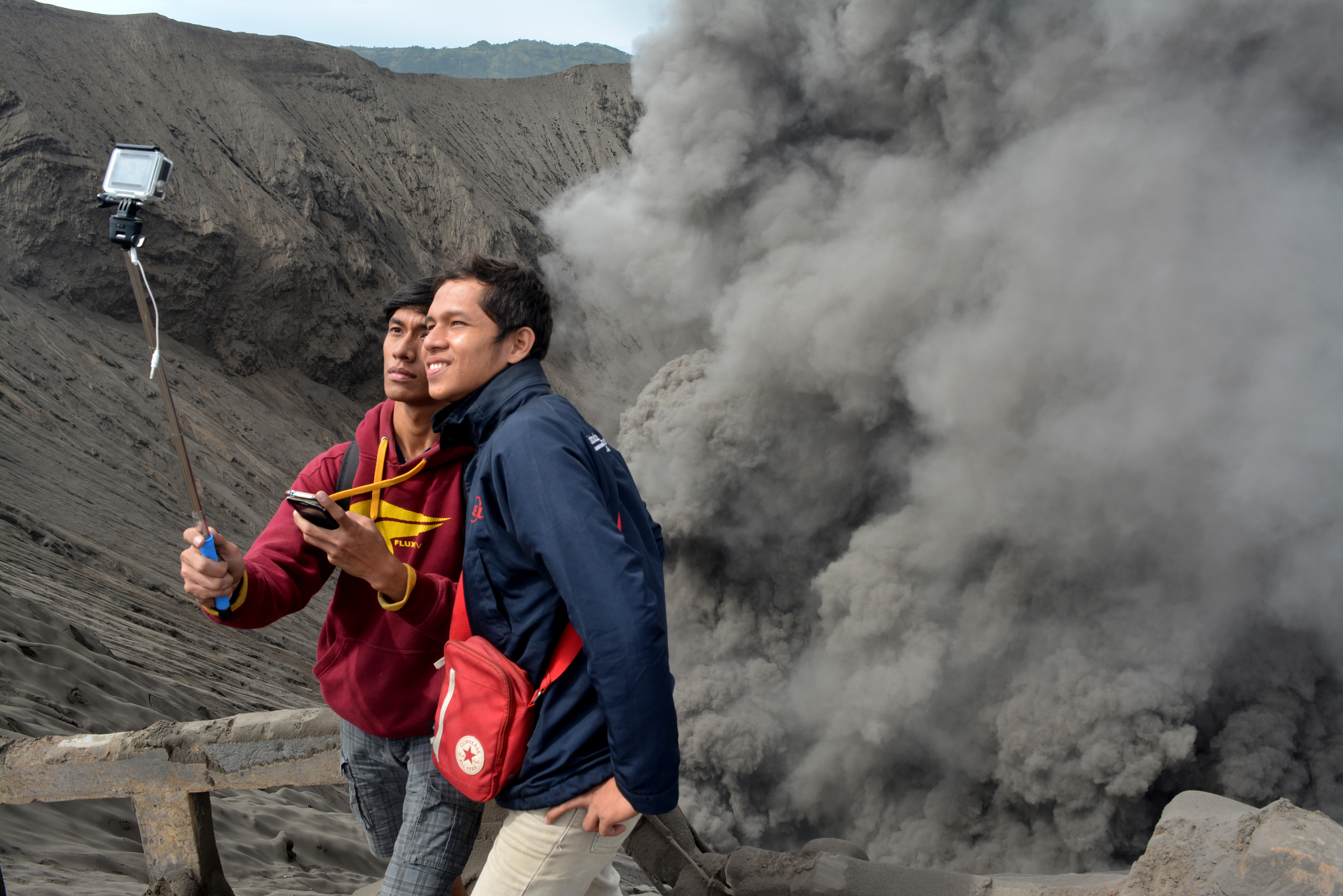 Sejumlah wisatawan berfoto di bibir kawah Gunung Bromo, Probolinggo, Jawa Timur, Selasa (12/7). Aktivitas Gunung Bromo mengalami peningkatan dengan gempa tremor amplitudo maksimal 3-21 milimeter dan tinggi asap abu vulkanis 300-800 meter dari puncak kawah. ANTARA FOTO/Umarul Faruq/aww/16.