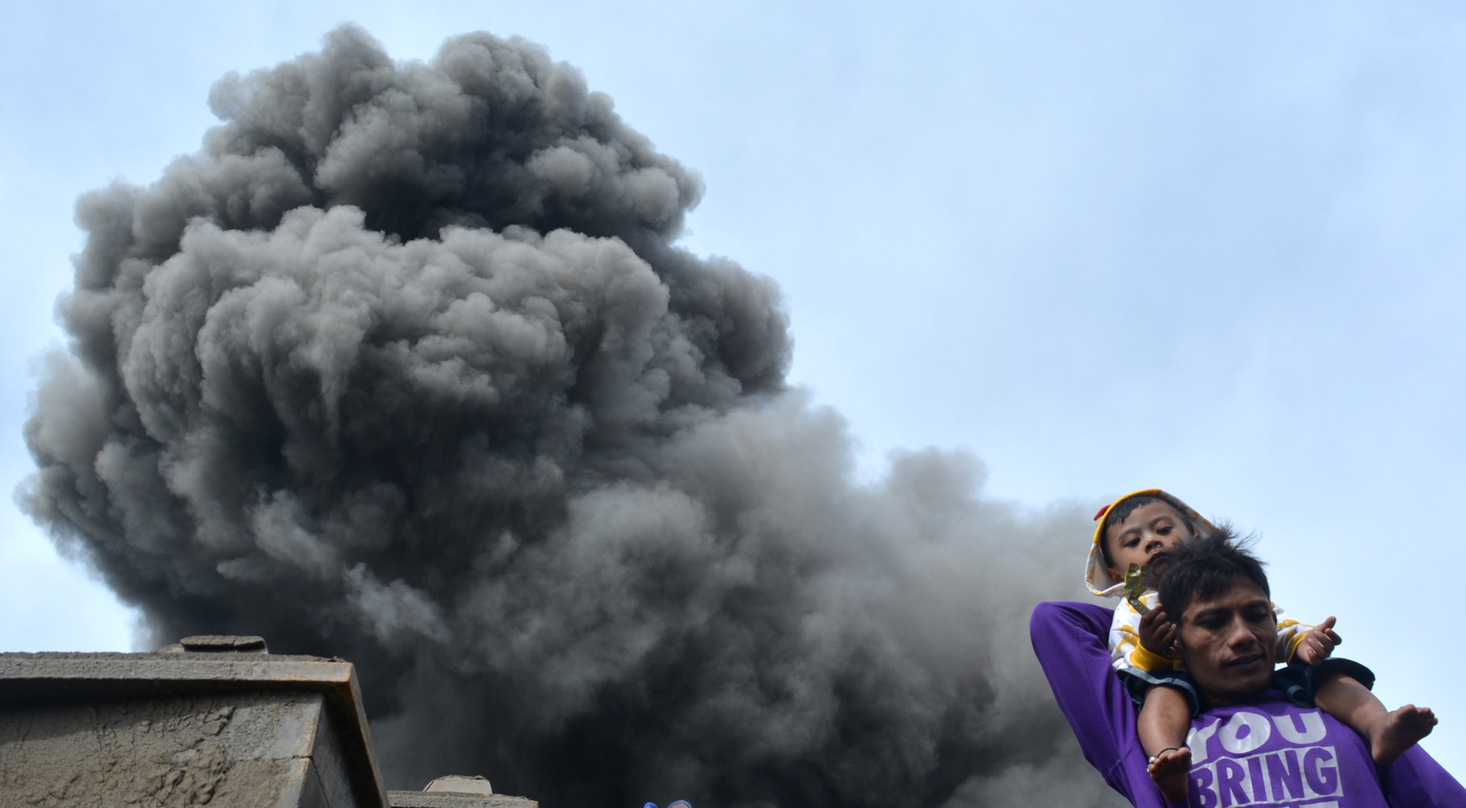 Seorang pria menggendong balita dengan latar belakang semburan abu vulkanis keluar dari kawah Gunung Bromo, Probolinggo, Jawa Timur, Selasa (12/7). Aktivitas Gunung Bromo mengalami peningkatan dengan gempa tremor amplitudo maksimal 3-21 milimeter dan tinggi asap abu vulkanis 300-800 meter dari puncak kawah. ANTARA FOTO/Umarul Faruq/aww/16.