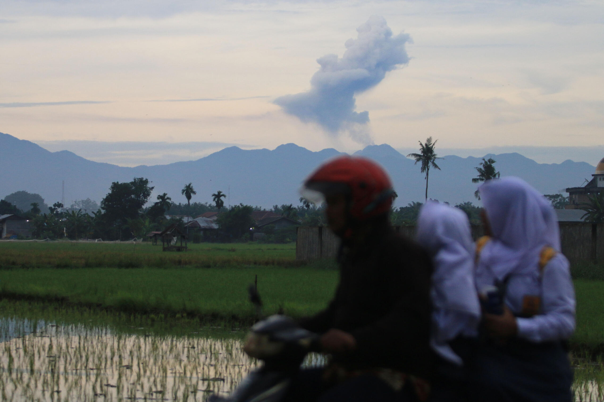 Pengendara sepeda motor melintas dengan latar belakang Gunung Sinabung menyemburkan material vulkanik tampak dari kawasan Sunggal (70 km dari Sinabung), Deli Serdang, Sumatera Utara, Selasa, (19/7). Aktifitas Gunung Sinabung berstatus Awas (level IV) masih meningkat ditandai dengan erupsi dan luncuran lava pijar. ANTARA FOTO/Irsan Mulyadi/foc/16.