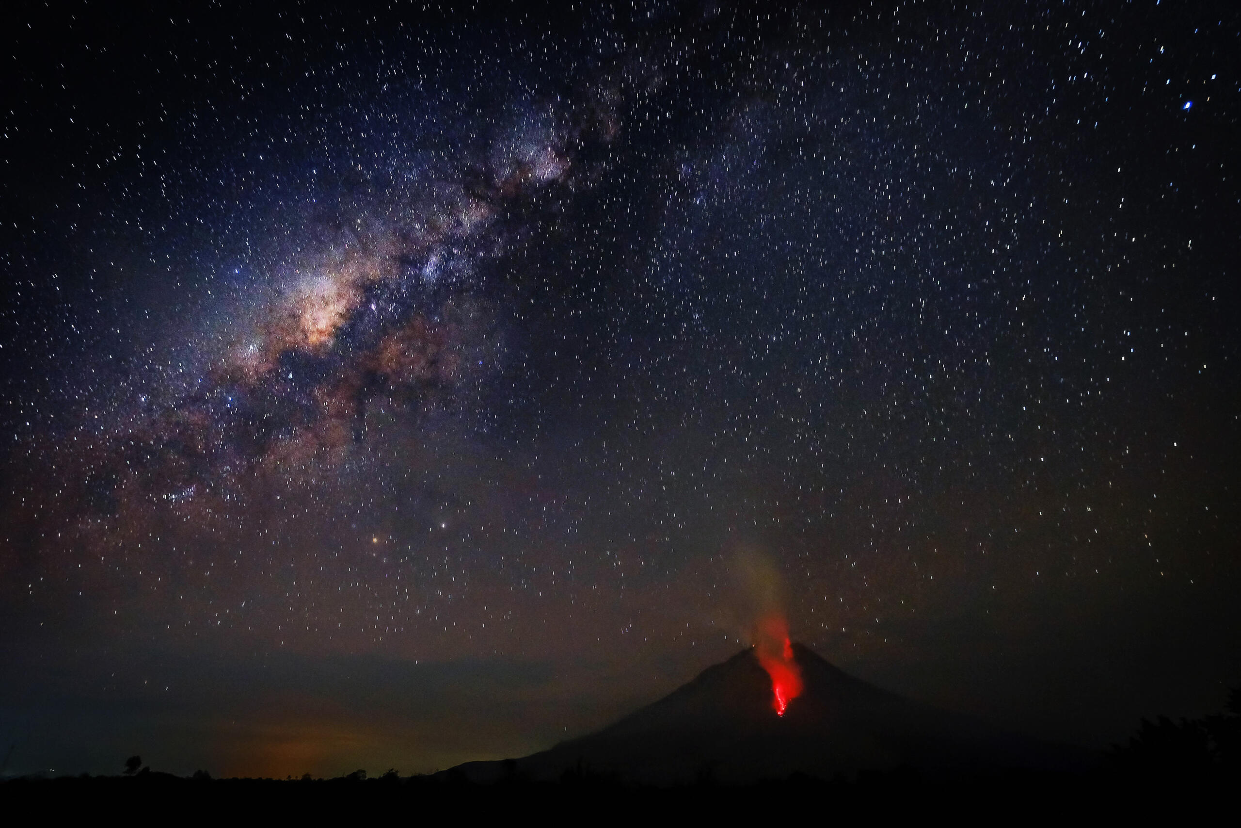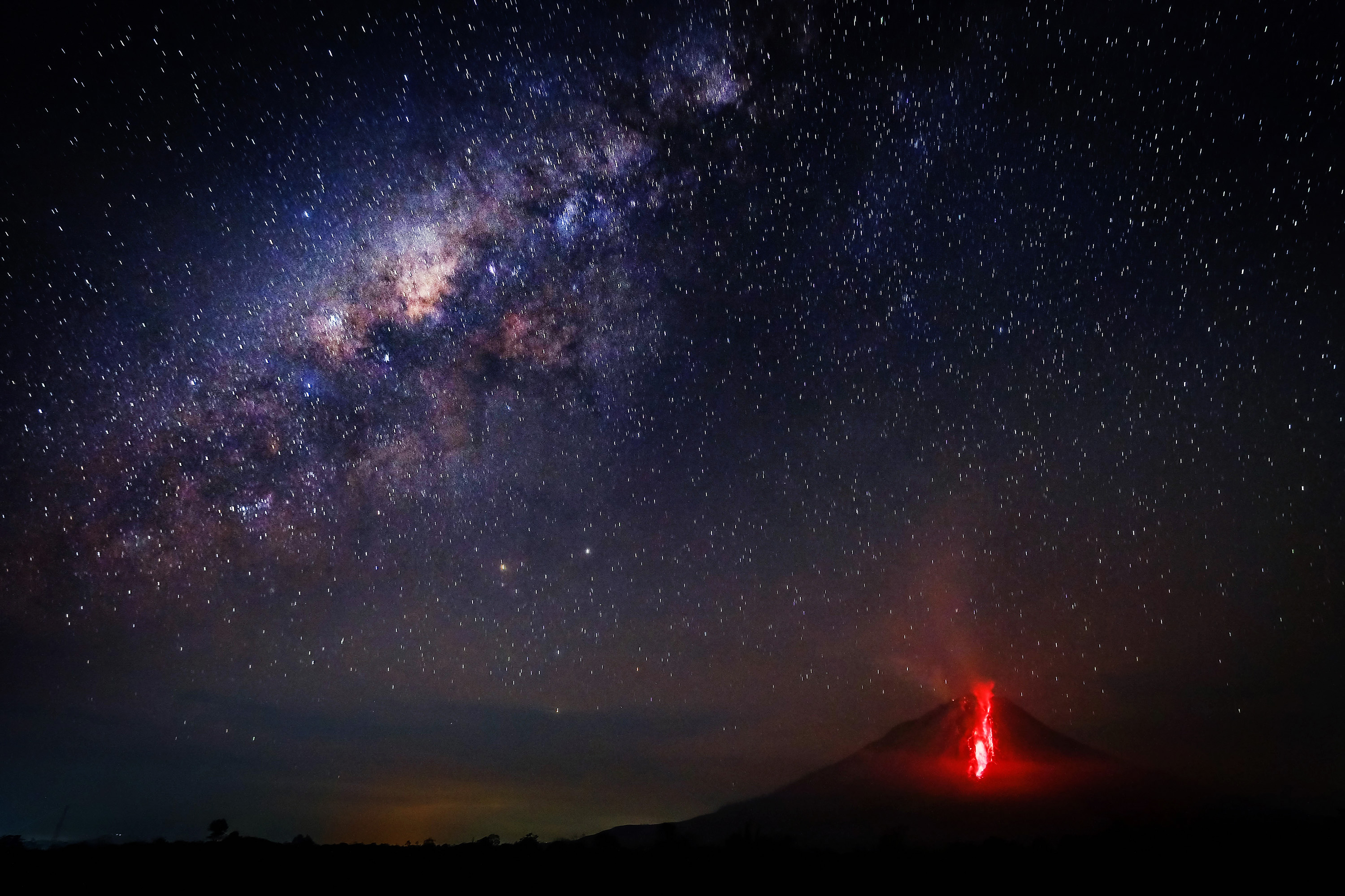 Lava pijar mengalir di lereng Gunung Sinabung, terlihat dari Desa Suka Ndebi, Karo, Sumatera Utara, Sabtu (30/7) dini hari. Aktifitas Gunung Sinabung berstatus Awas (level IV) masih meningkat ditandai dengan erupsi dan lava pijar yang mengalir di Gunung Sinabung. ANTARA FOTO/Tibta Perangin angin/im/nz/16
