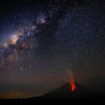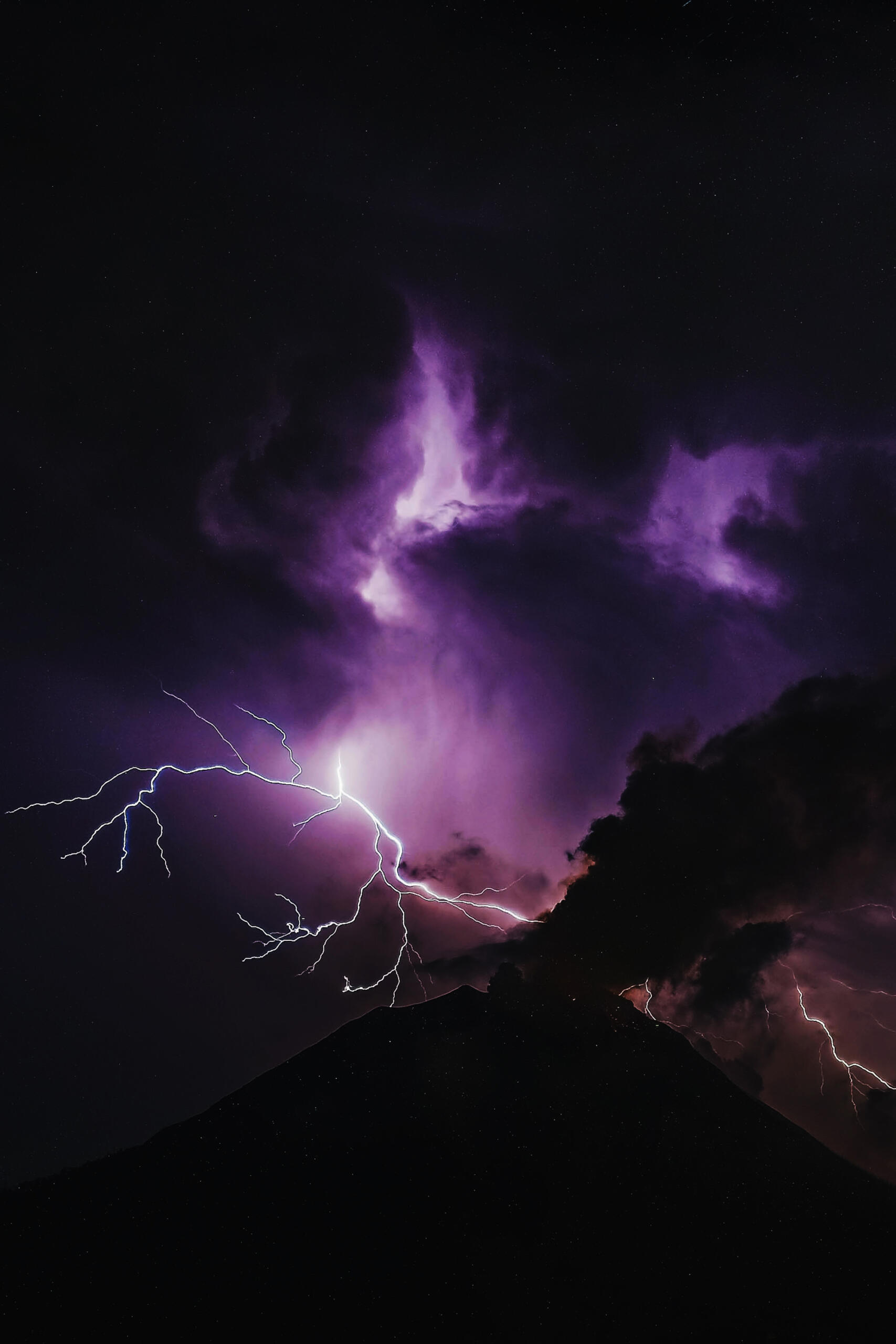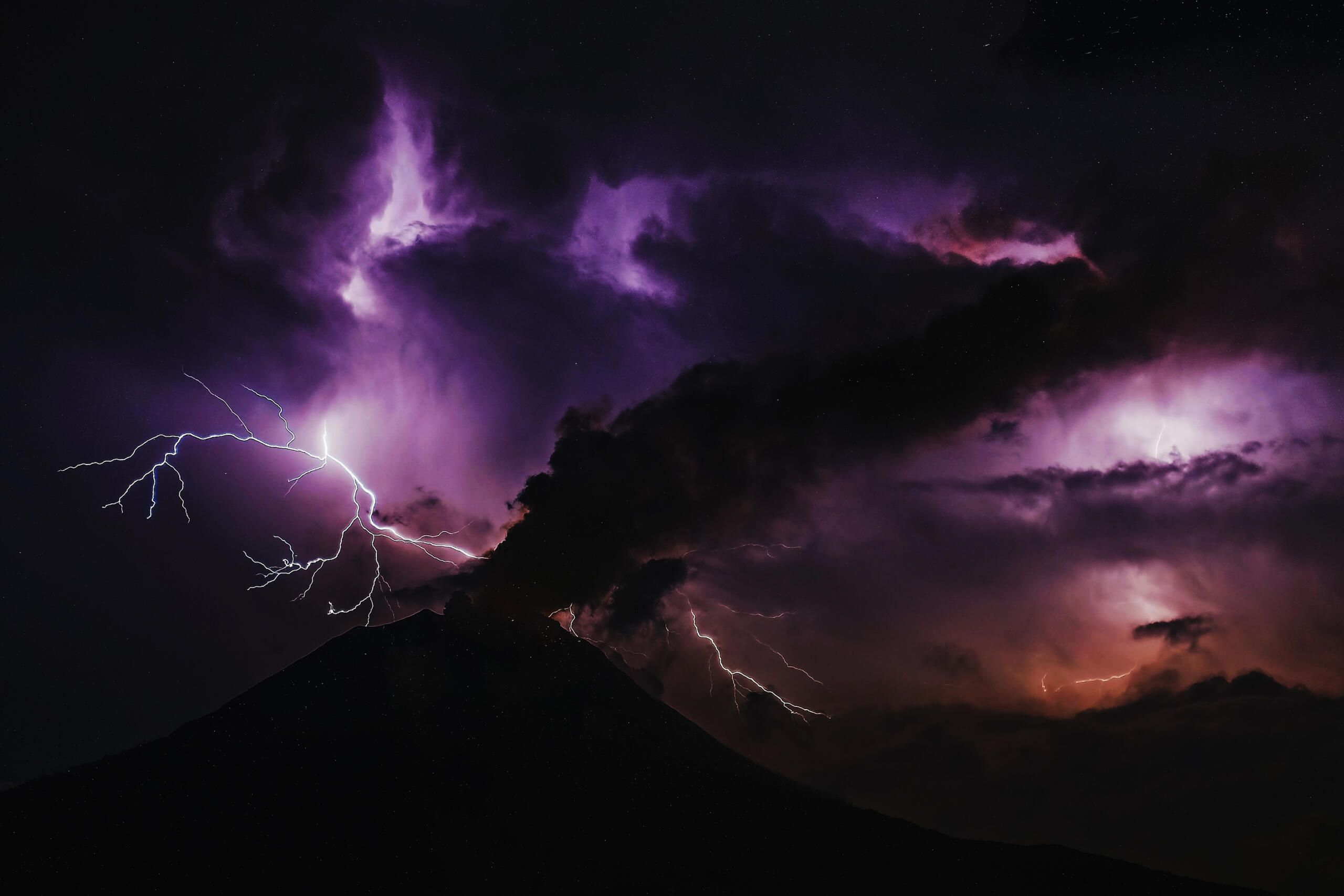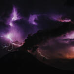 Petir menyambar ketika Gunung Sinabung erupsi, tampak dari Desa Tiga Pancur, Karo, Sumatera Utara, Kamis (28/7) malam. Aktifitas Gunung Sinabung berstatus Awas (level IV) masih meningkat ditandai dengan erupsi dan lava pijar yang mengalir di Gunung Sinabung. ANTARA FOTO/Tibta Perangin angin/im/pd/16