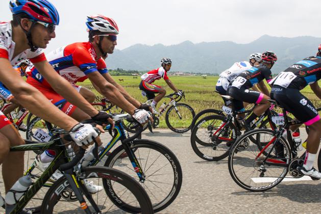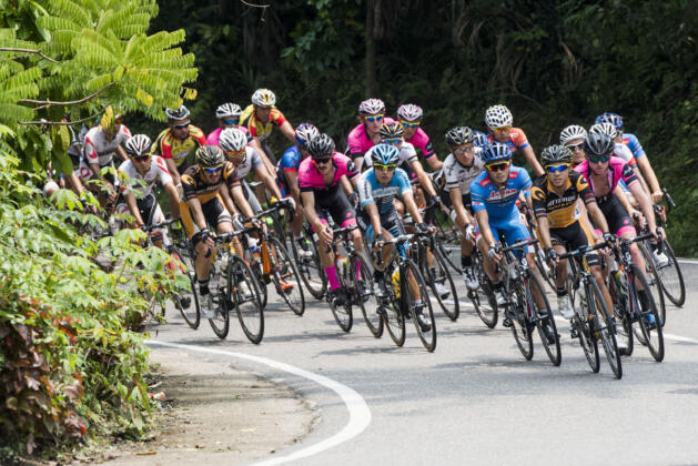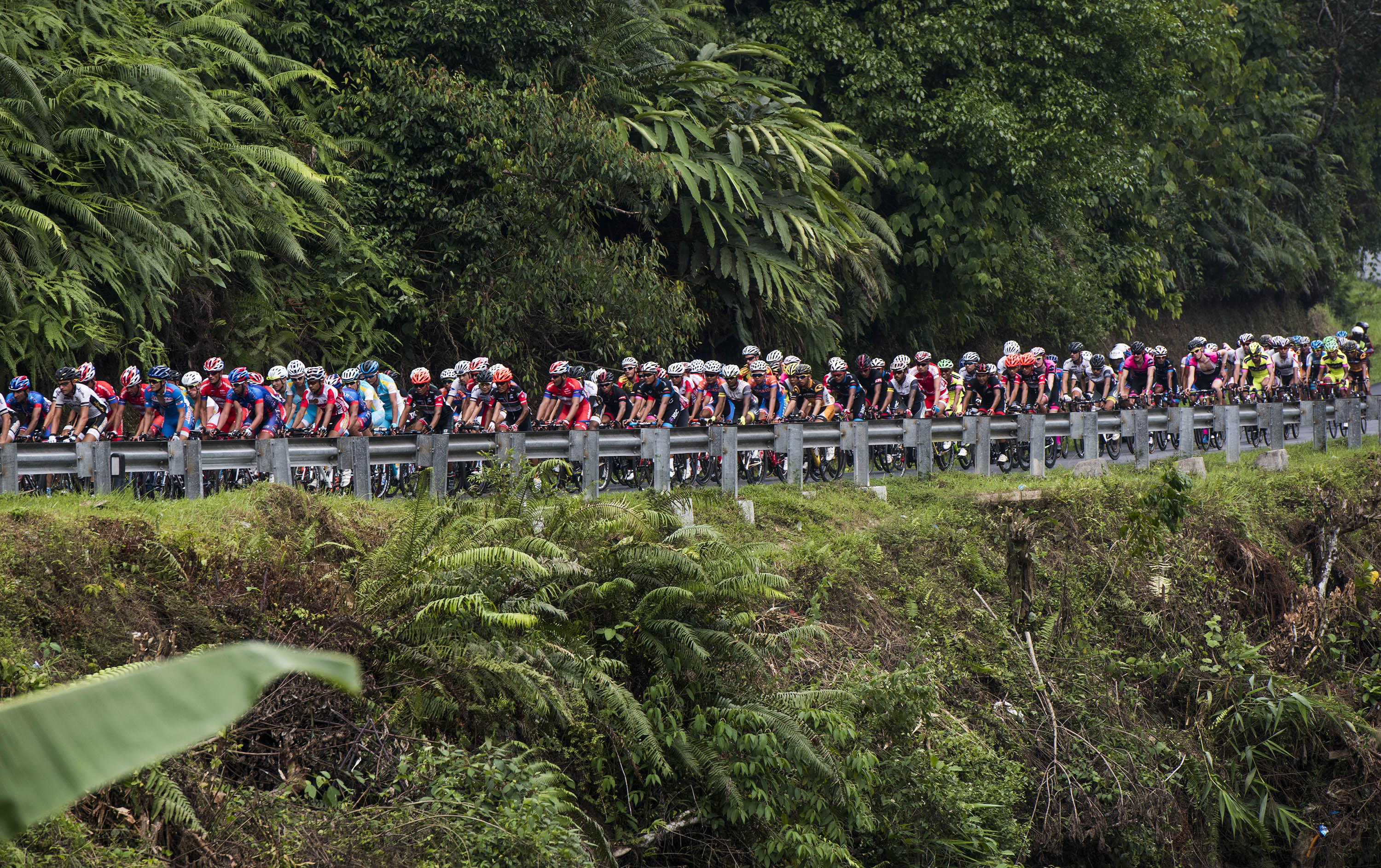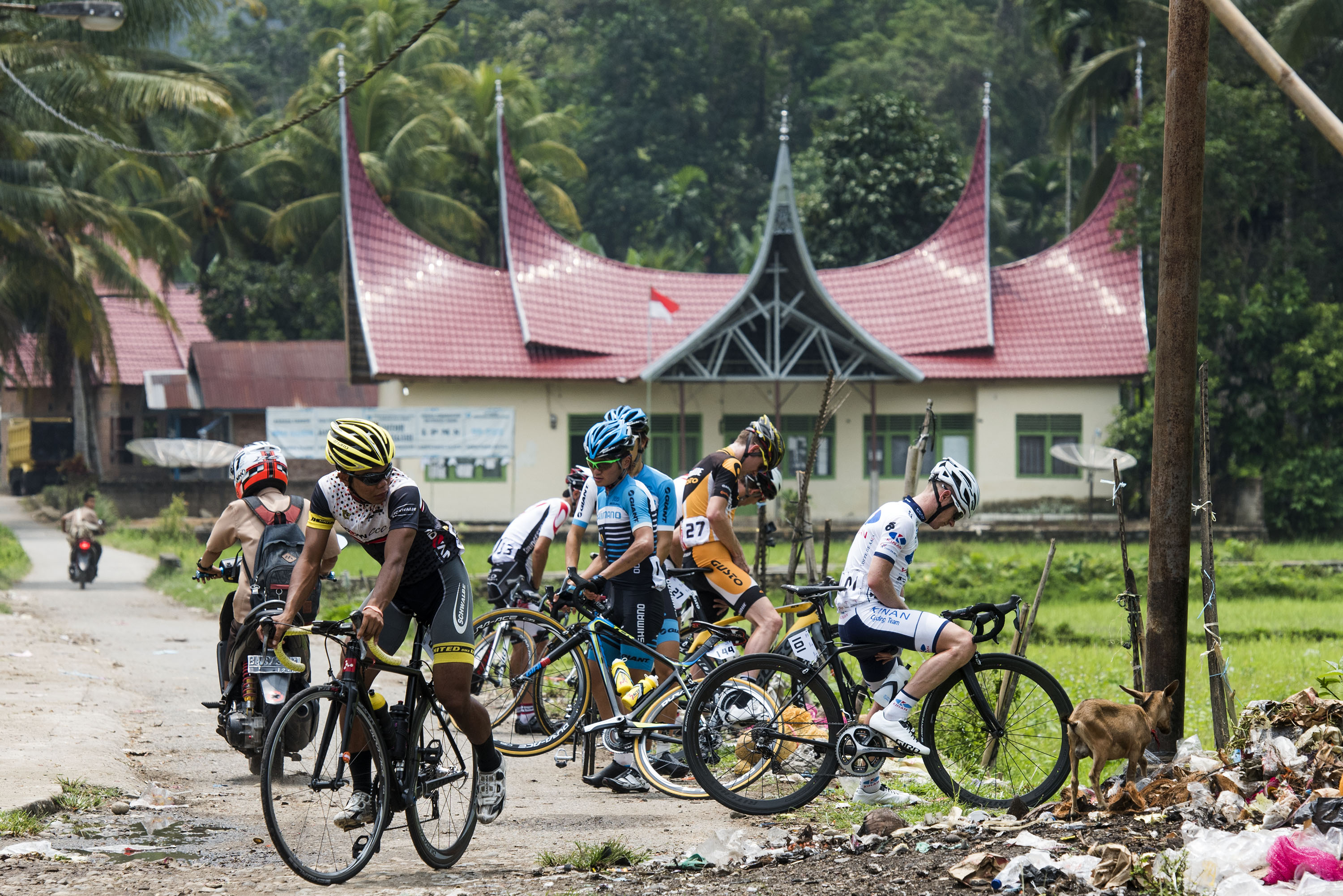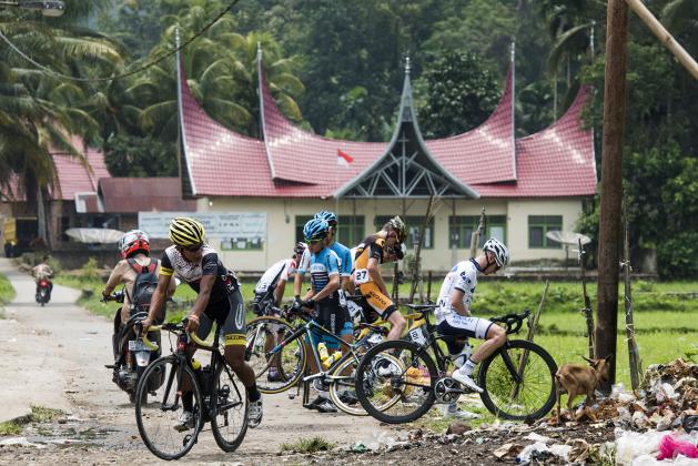 Pembalap sepeda melakukan aktivitas buang air kecil saat beristirahat pada Etape Pertama Tour De Singkarak 2015 di Barung-Barung Belantai, Pesisir Selatan, Sumatera Barat, Sabtu (3/10). Etape Pertama Tour De Singkarak 2015 yang diikuti 131 pembalap ini mengalami pengulangan start hingga dua kali di lokasi simpang tiga Carocok dan di Barung-Barung Belantai. ANTARA FOTO/M Agung Rajasa/foc/15.