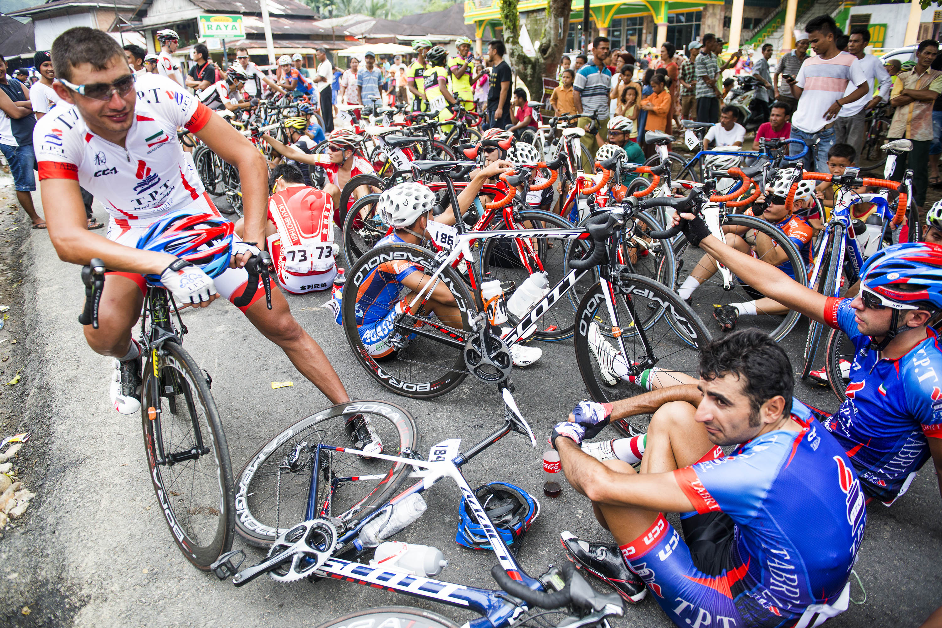 Pembalap sepeda beristirahat di tengah jalan saat Etape Pertama Tour De Singkarak 2015 di Barung-Barung Belantai, Pesisir Selatan, Sumatera Barat, Sabtu (3/10). Etape Pertama Tour De Singkarak 2015 yang diikuti 131 pembalap ini mengalami pengulangan start hingga dua kali di lokasi simpang tiga Carocok dan di Barung-Barung Belantai. ANTARA FOTO/M Agung Rajasa/foc/15.
