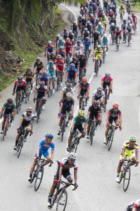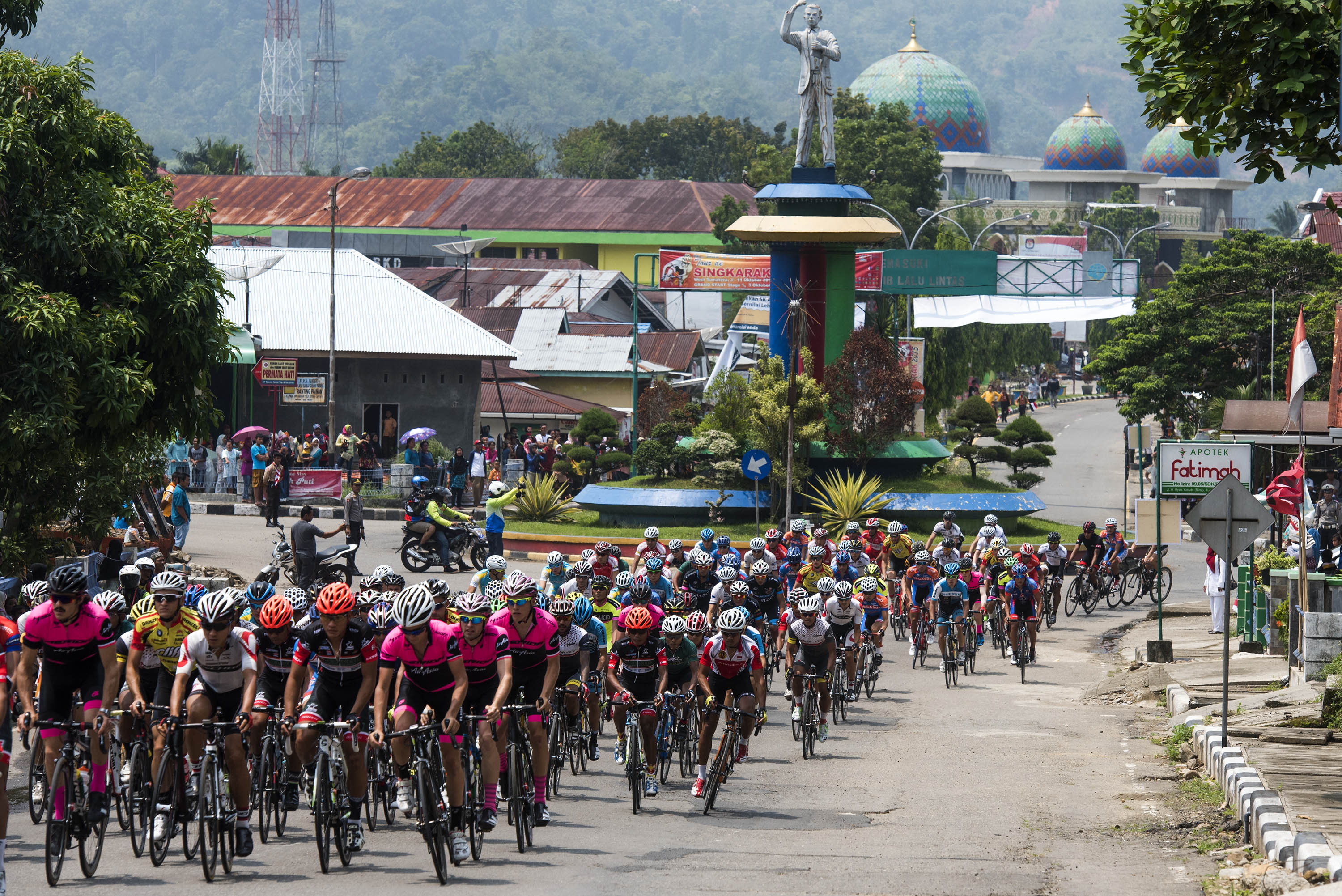 Pembalap sepeda beradu kecepatan dalam etape pertama Tour De Singkarak 2015 di Padang, Sumatera Barat, Sabtu (3/10). Etape Pertama Tour De Singkarak 2015 diikuti 131 pembalap yang menempuh jarak 163 kilometer dari Pantai Carocok, Kabupaten Pesisir Selatan, menuju Pantai Gondoria, Kota Pariaman. ANTARA FOTO/M Agung Rajasa/15.