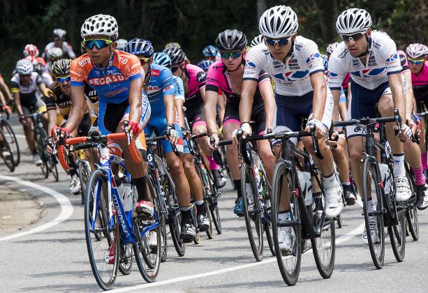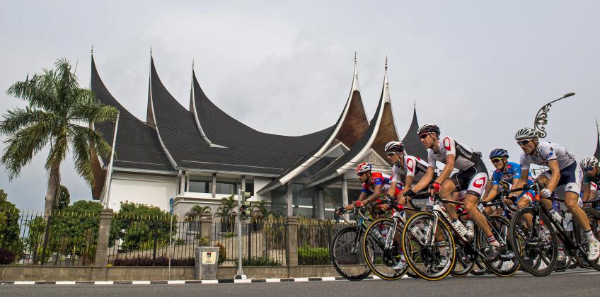Pembalap sepeda dalam etape pertama Tour De Singkarak 2015 beradu kecepatan saat melintas di depan gedung Bank Indonesia di kota Padang, Sumatera Barat, Sabtu (3/10). Etape Pertama Tour De Singkarak 2015 diikuti 131 pembalap yang menempuh jarak 163 kilometer dari Pantai Carocok, Kabupaten Pesisir Selatan, menuju Pantai Gondoria, Kota Pariaman. ANTARA FOTO/M Agung Rajasa/foc/15.
