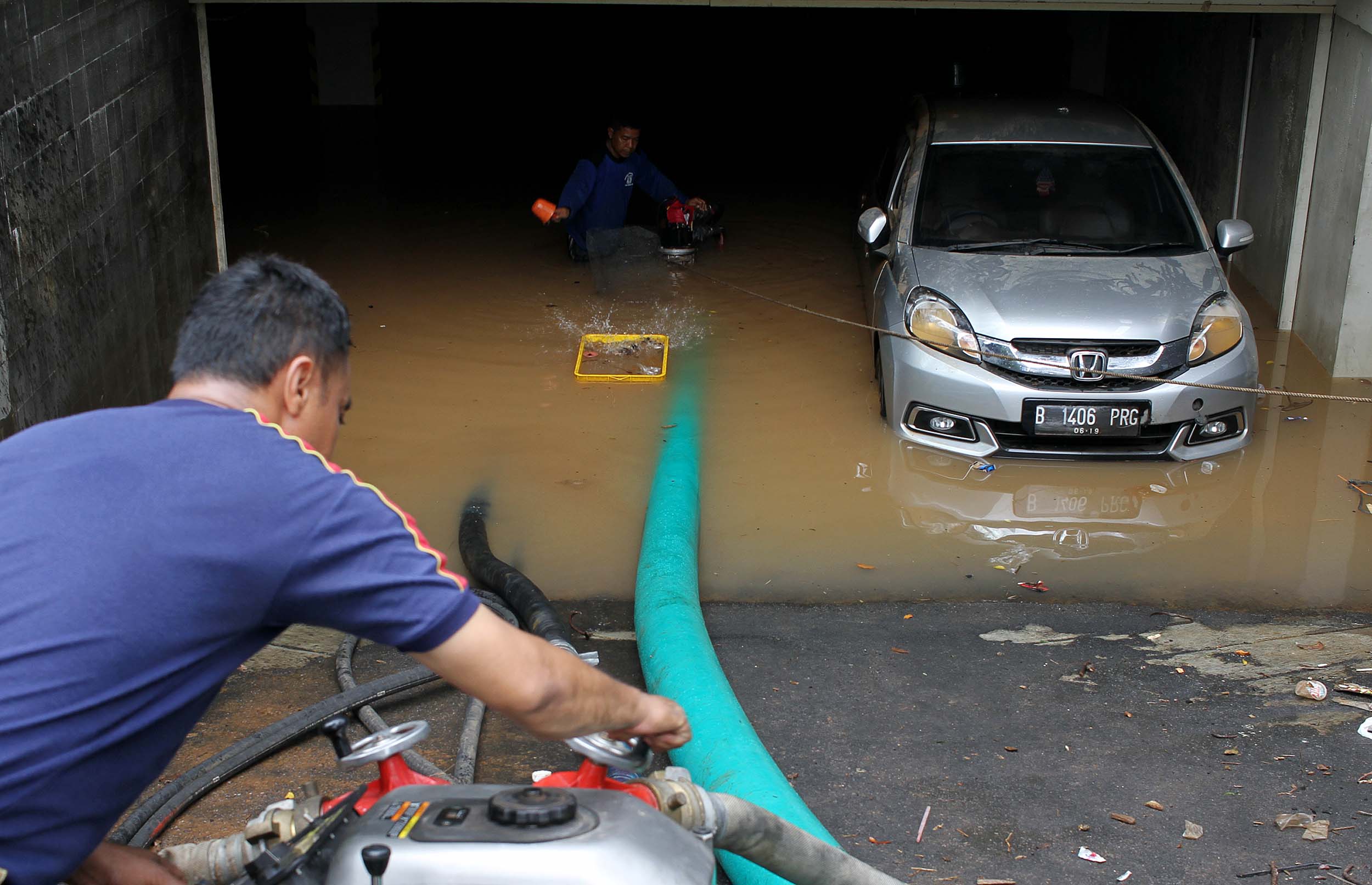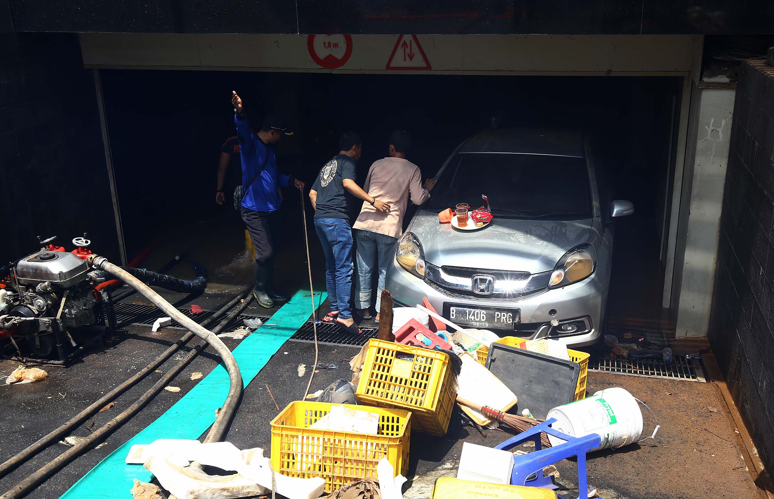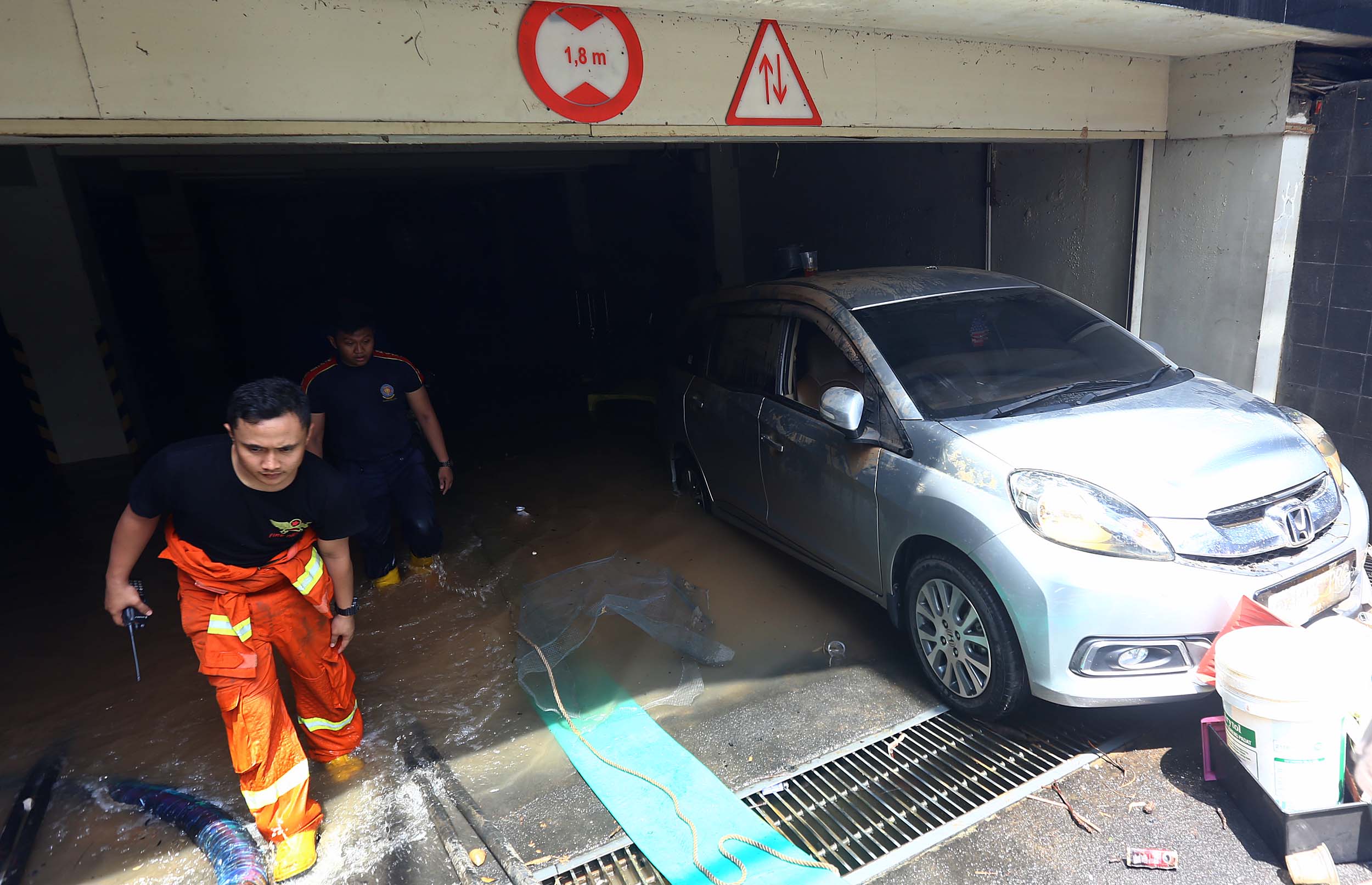 Petugas berusaha mengevakuasi mobil yang terendam di basement Kemang Square, Jakarta, (28/8/2016). Buruknya drainase ditambah curah hujan tinggi yang mengguyur Jakarta hingga hingga dini hari, menyebabkan sejumlah wilayah hingga basement gedung terendam air.