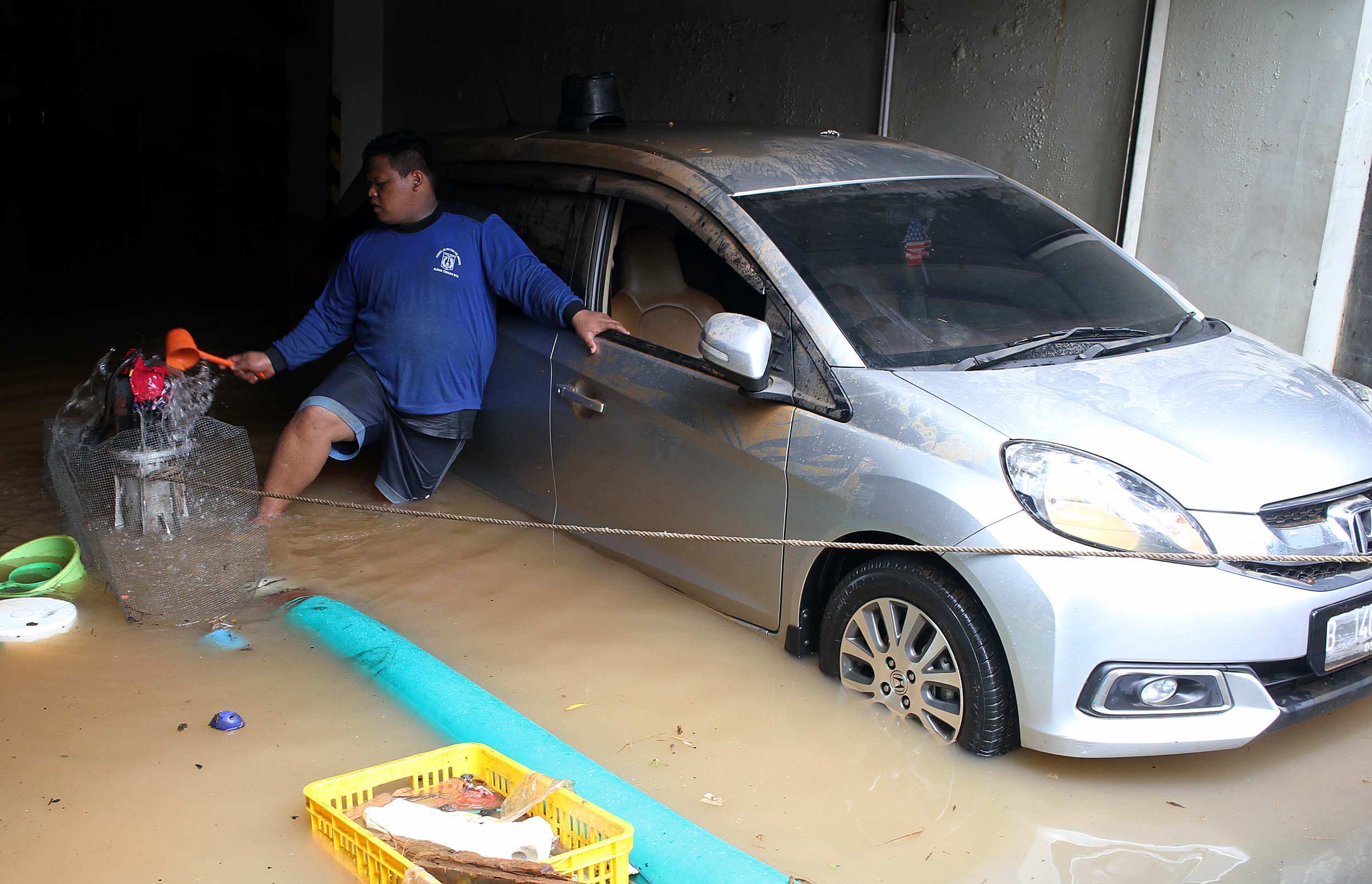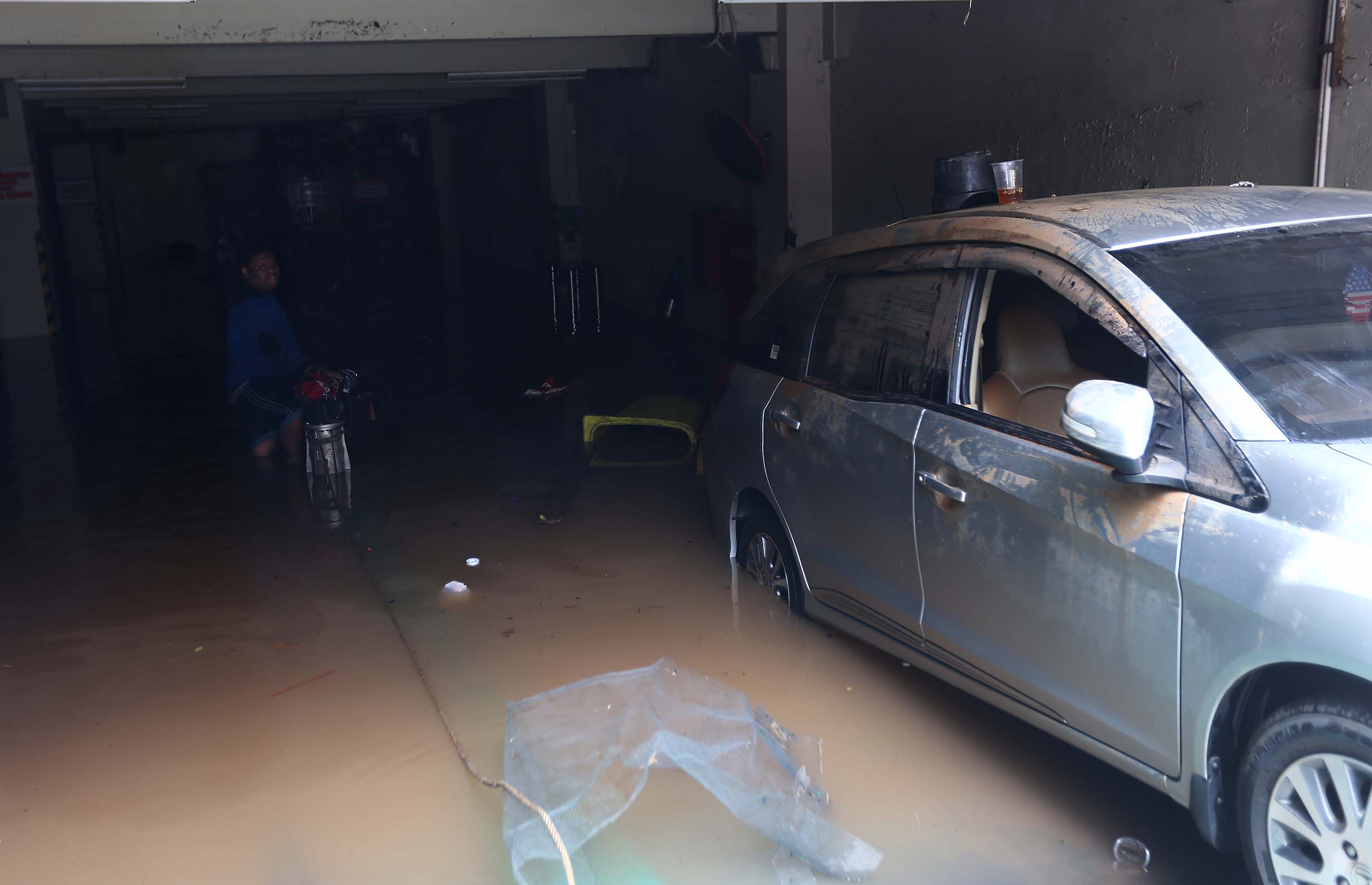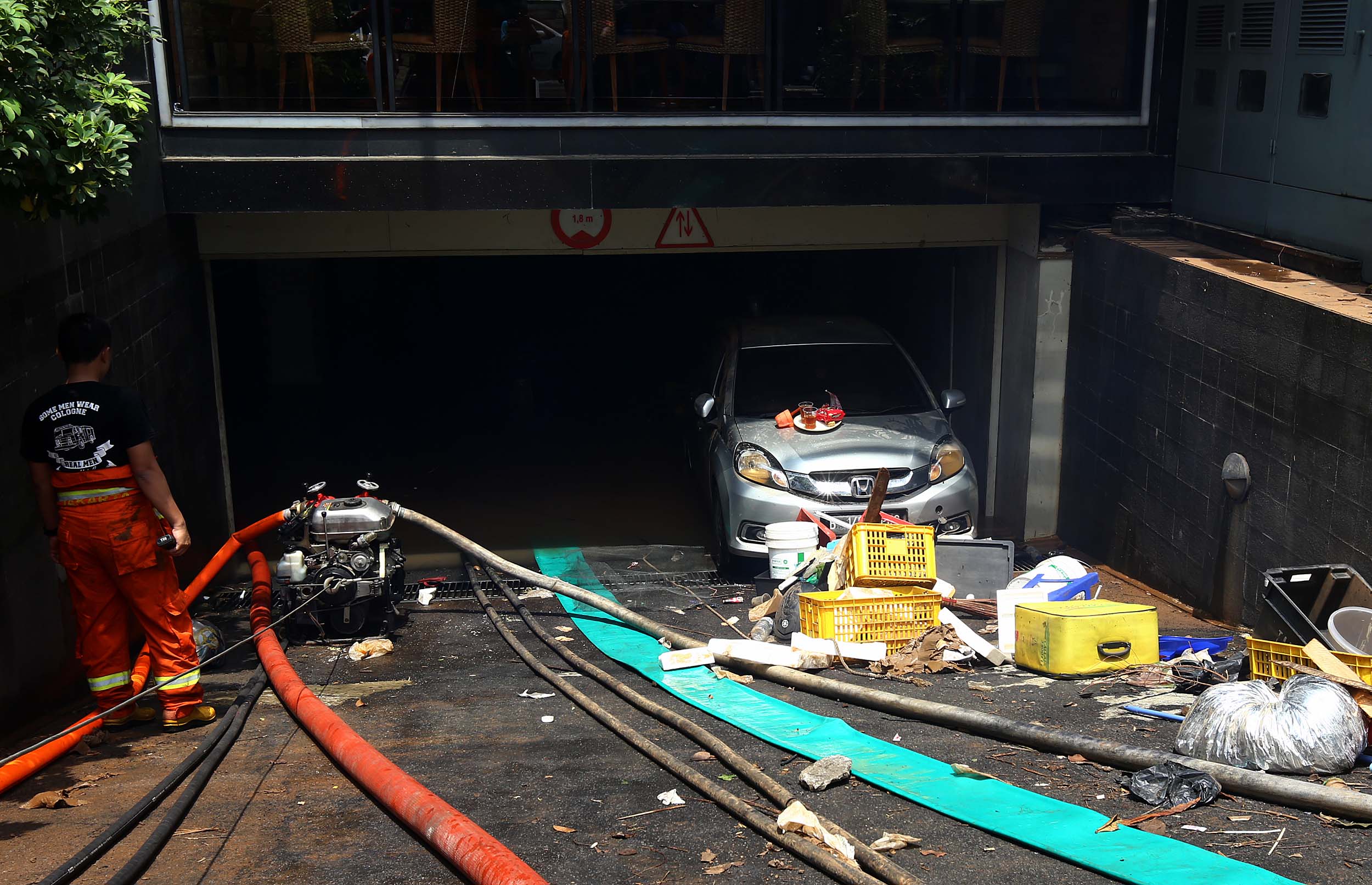 Petugas berusaha mengevakuasi mobil yang terendam di basement Kemang Square, Jakarta, (28/8/2016). Buruknya drainase ditambah curah hujan tinggi yang mengguyur Jakarta hingga hingga dini hari, menyebabkan sejumlah wilayah hingga basement gedung terendam air.