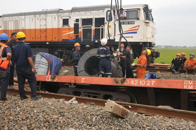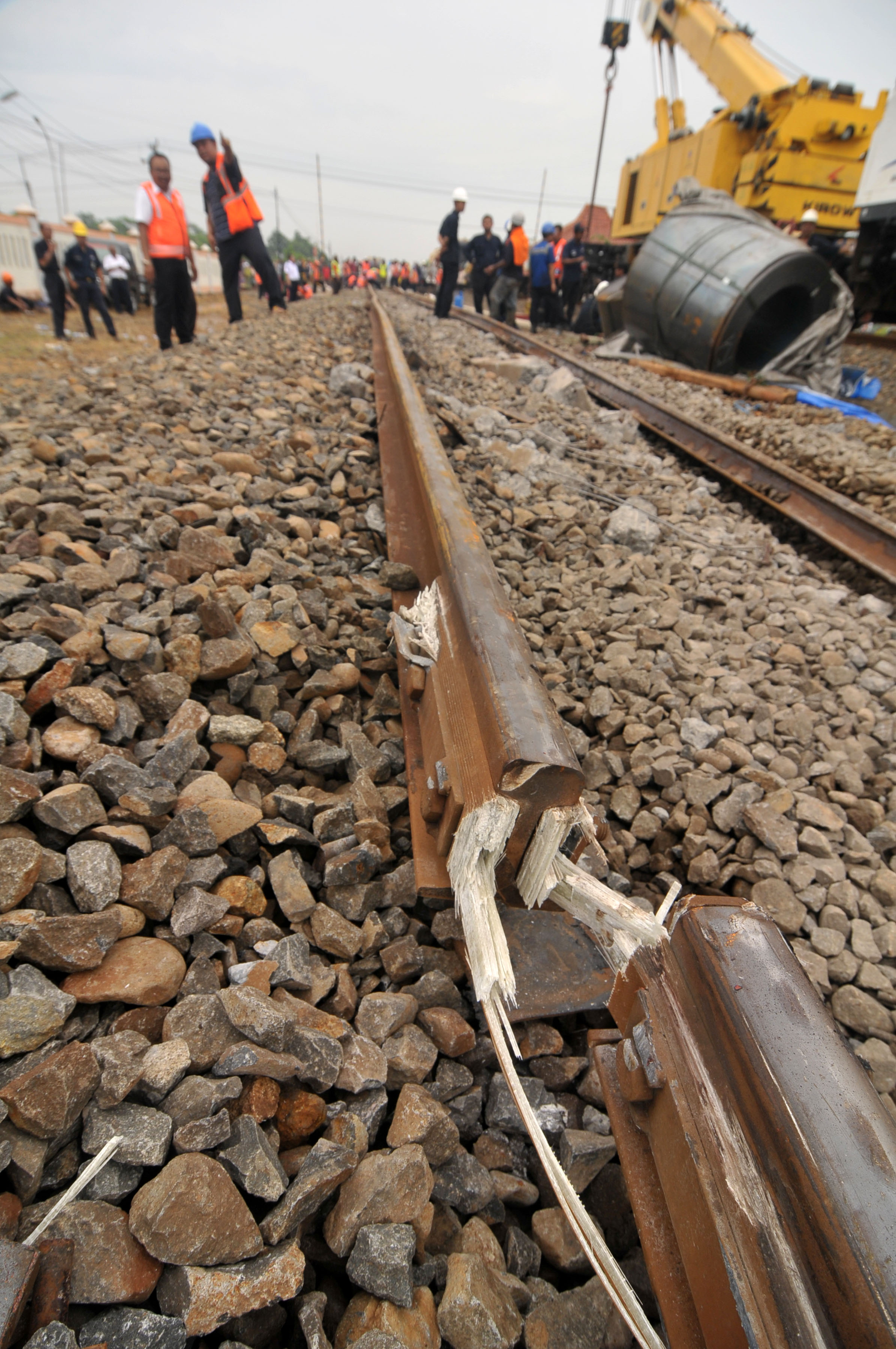 Petugas memperhatikan rel yang patah akibat peristiwa tergulingnya Kereta Api barang di Batang, Jawa Tengah, Selasa (26/4). Berdasarkan keterangan PT KAI Daop IV Semarang peristiwa tergulingnya KA barang pada Senin (25/4) mengakibatkan rel sepanjang tiga kilometer rusak, 1,5 kilometer di antaranya rusak parah dan patah. ANTARA FOTO/Oky Lukmansyah/kye/16