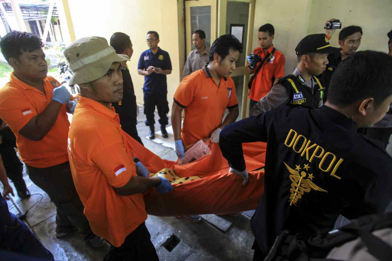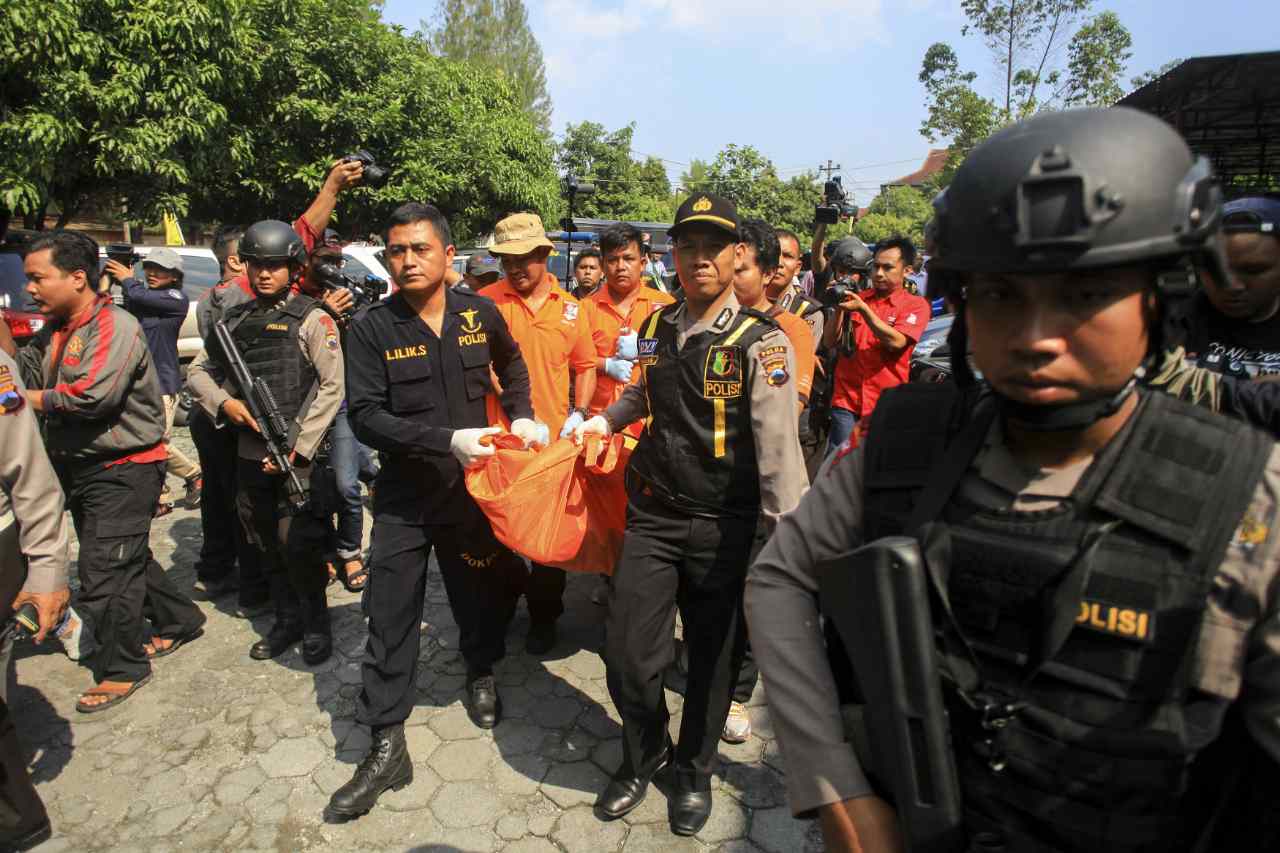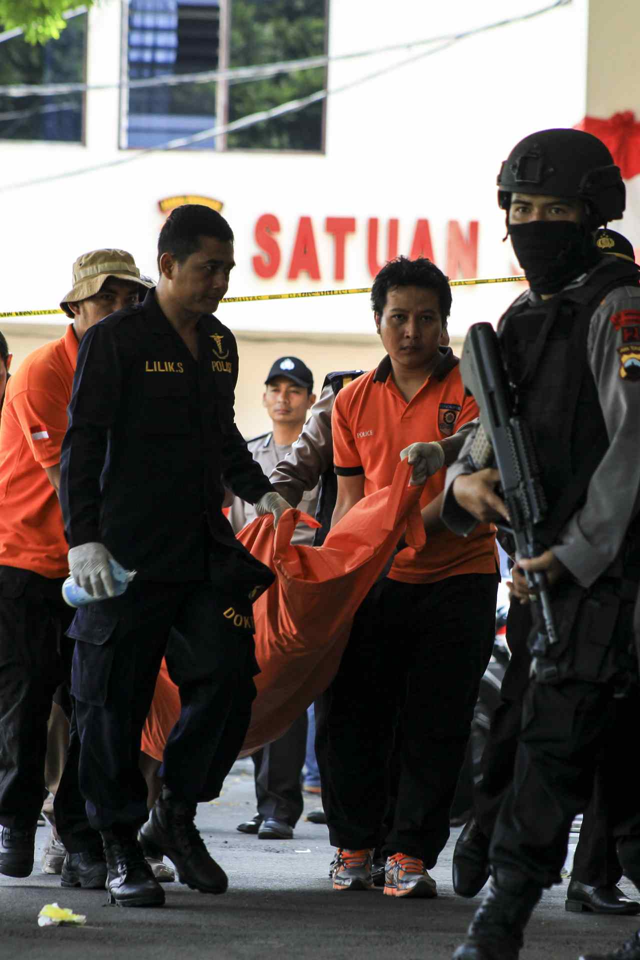 Polisi membawa kantong berisi jenazah Nur Rohman, pelaku bom bunuh diri di Mapolresta Solo, Jawa Tengah, Selasa (5/7). Selanjutnya, jenazah pelaku bom bunuh tersebut dibawa ke RS Bhayangkara Semarang untuk diidentifikasi. ANTARA FOTO/Maulana Surya/ama/16.