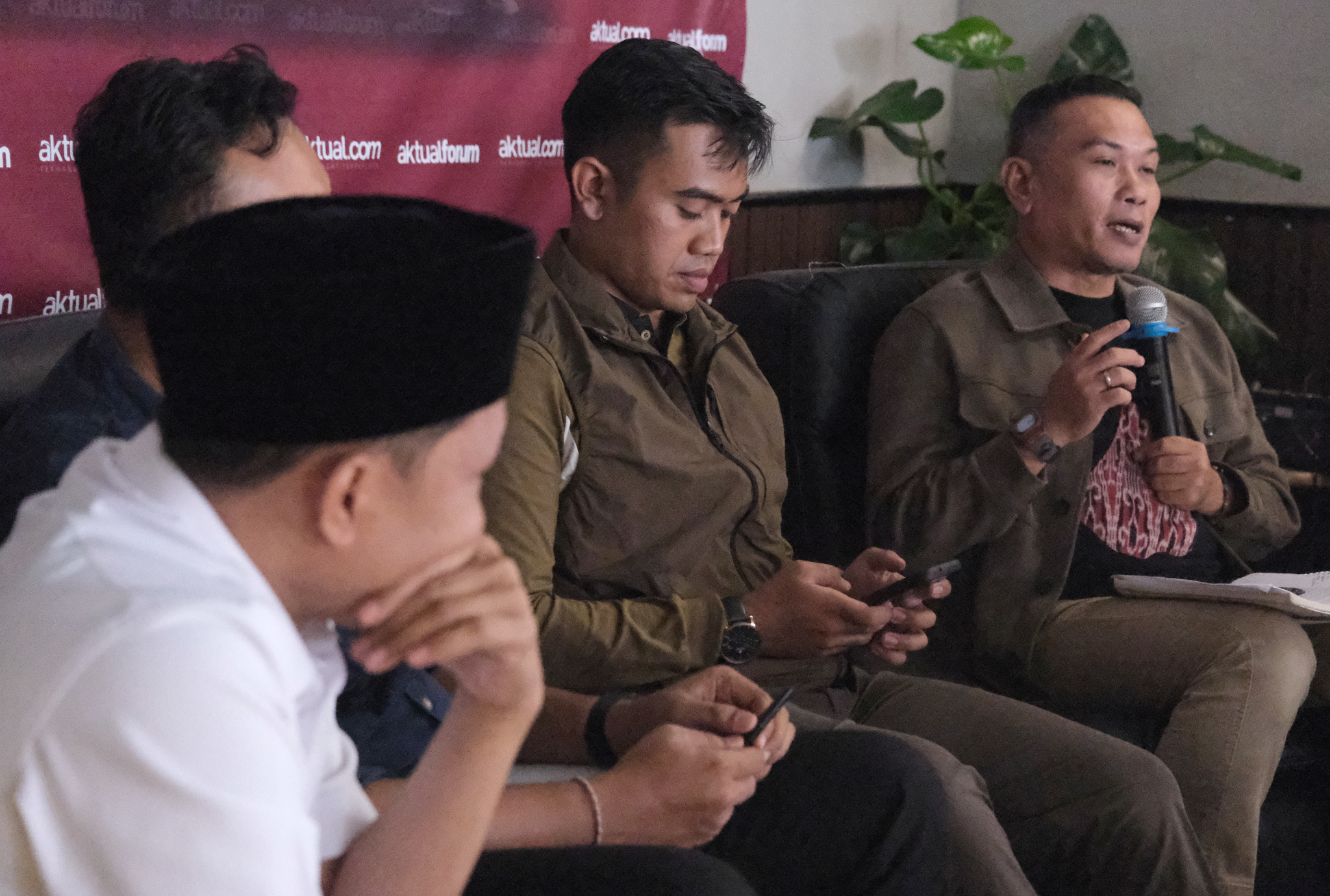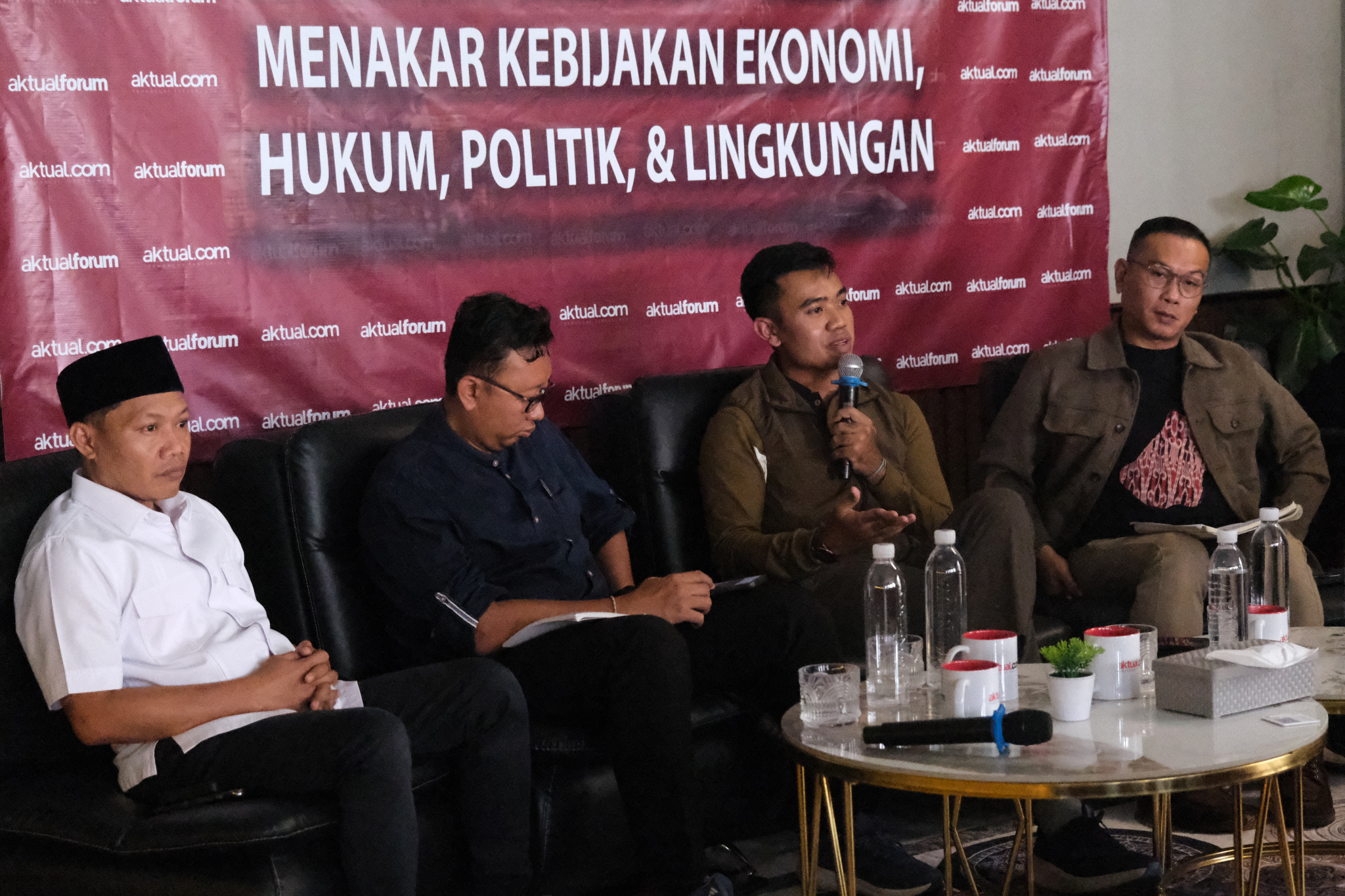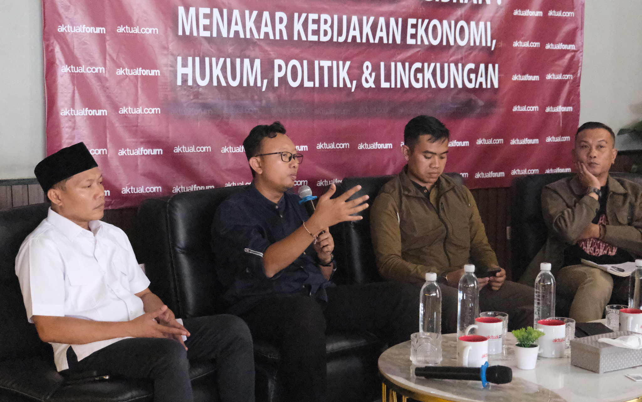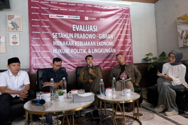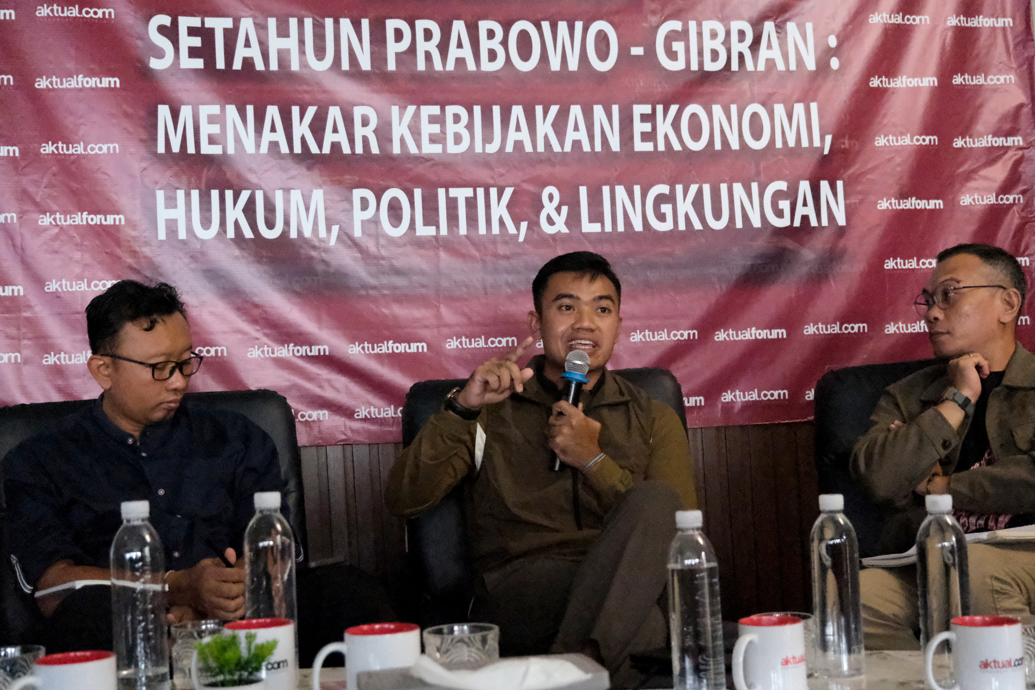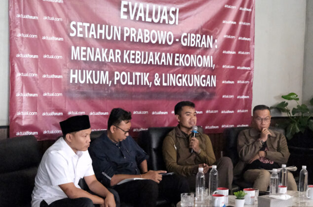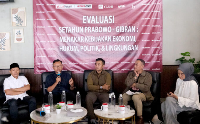 Ketua Dewan Pembina Cakrawala Negarawan Cak Nanto (kiri), Ketua Umum Yayasan Lembaga Bantuan Hukum Indonesia (YLBHI), Muhammad Isnur (kedua kiri), Peneliti Center of Economic and Law Studies (Celios), Galau D. Muhammad (ketiga kanan), Kepala Perencanaan Wahana Lingkungan Hidup Indonesia (WALHI), Tubagus Soleh Ahmad (kedua kanan) dan Moderator Rima saat diskusi aktual forum bertajuk “Evaluasi Setahun Prabowo-Gibran: Menakar Kebijakan Ekonomi, Hukum, Politik, dan Lingkungan” yang diselenggarakan oleh aktual.com, di Café Hartaka, Tebet, Jakarta Selatan, Sabtu (25/10). YLBHI menilai bahwa selama satu tahun pemerintahan Prabowo Subianto–Gibran Rakabuming Raka belum menunjukkan arah pembenahan hukum yang jelas dan konkret. Kita tidak melihat konsep yang jelas paradigma yang konkret atau langkah yang serius dalam pembenahan hukum. Yang ada adalah arus untuk menggelontorkan militer di mana-mana, dengan pembentukan Kodam baru, batalyon pembangunan, atau pelibatan tentara dalam aspek-aspek Pembangunan. Aktual/TINO OKTAVIANO