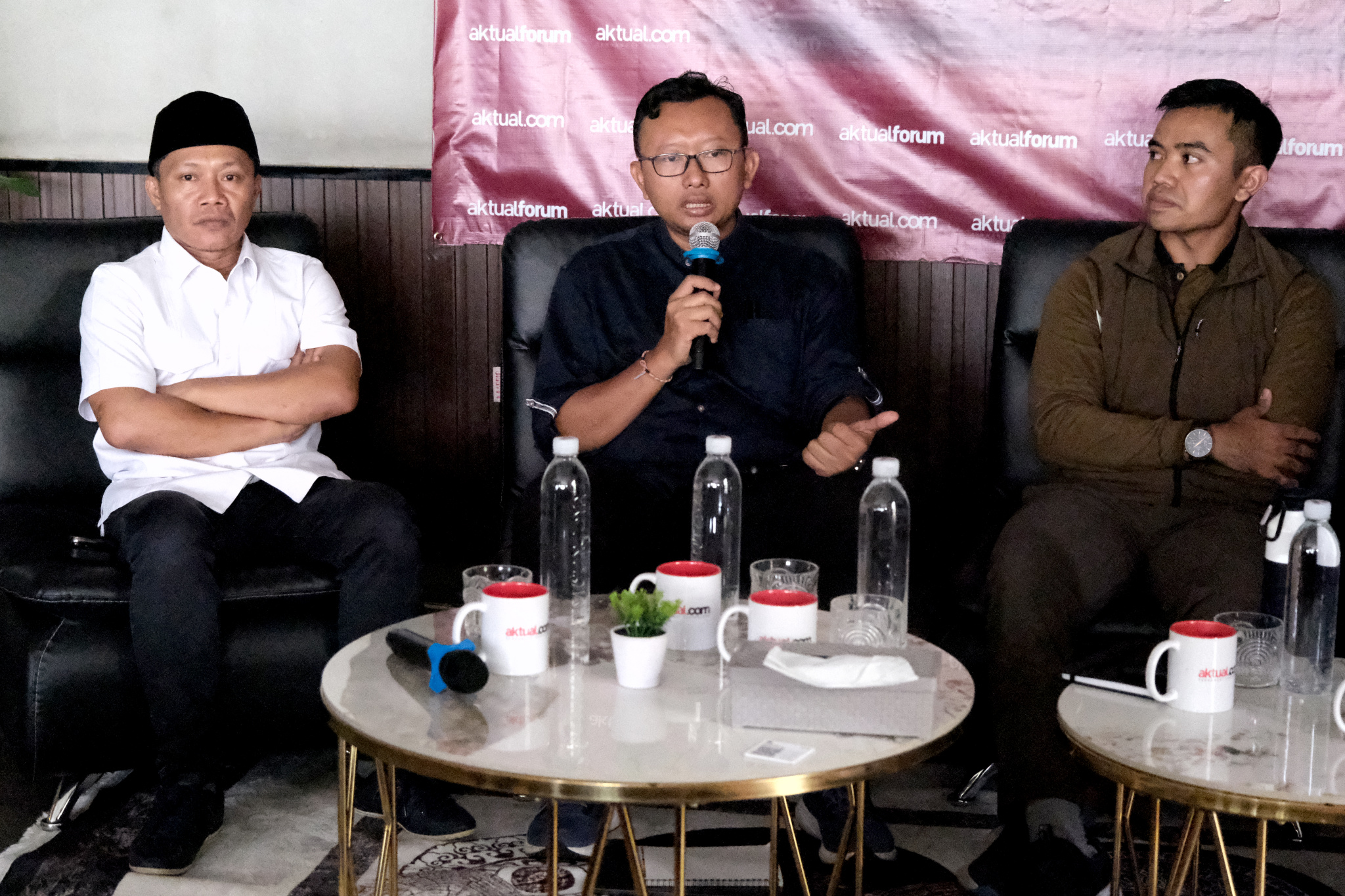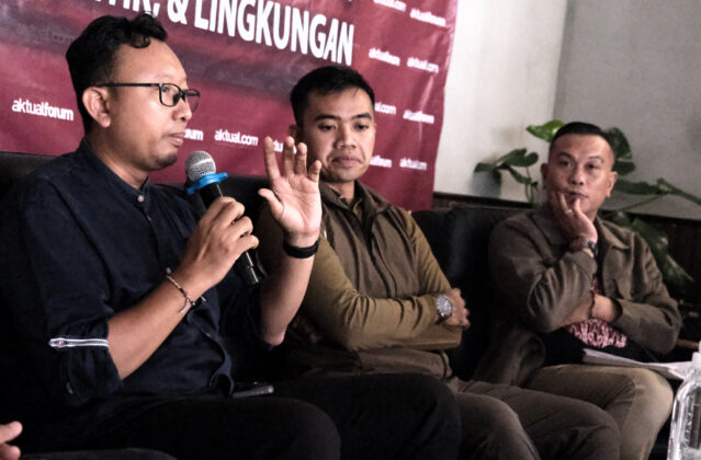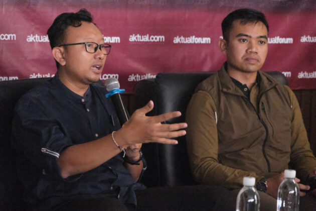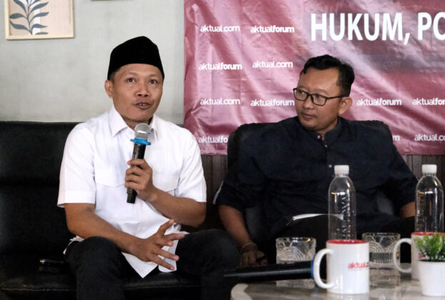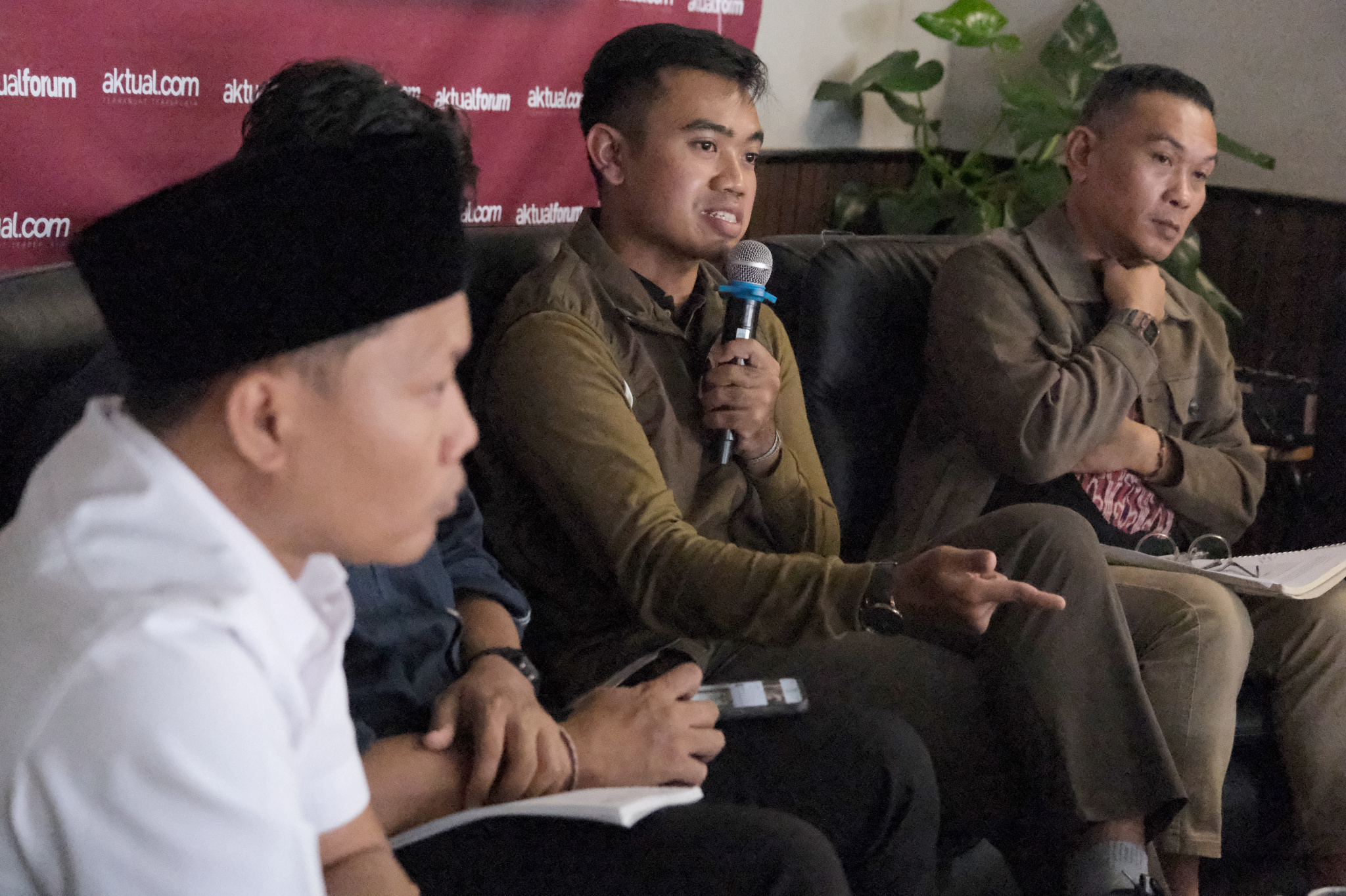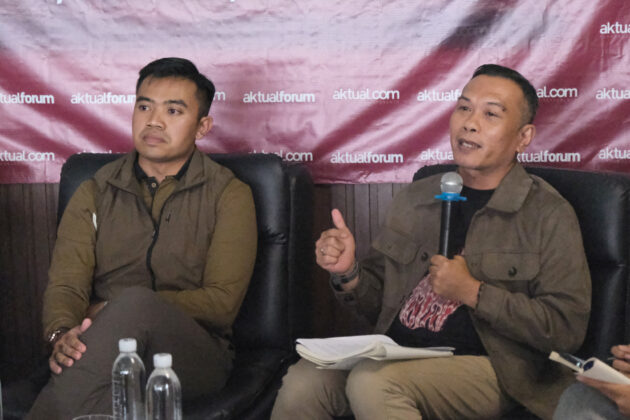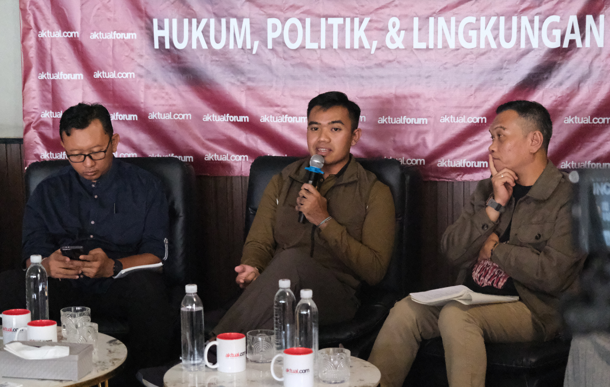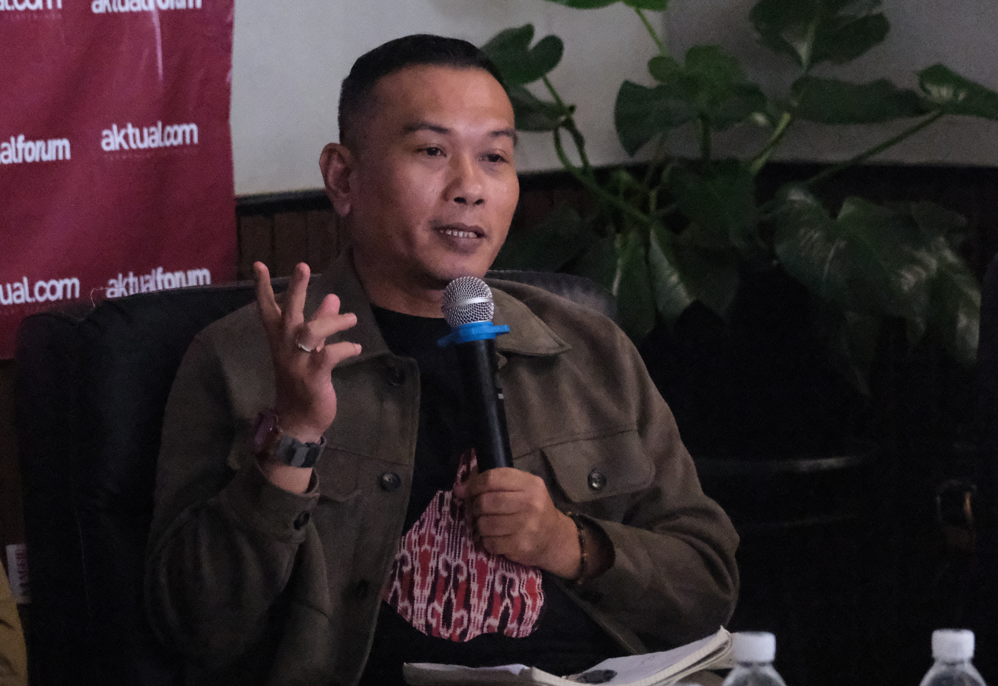 Ketua Dewan Pembina Cakrawala Negarawan Cak Nanto (kiri), Ketua Umum Yayasan Lembaga Bantuan Hukum Indonesia (YLBHI), Muhammad Isnur (kedua kiri), Peneliti Center of Economic and Law Studies (Celios), Galau D. Muhammad (ketiga kanan), Kepala Perencanaan Wahana Lingkungan Hidup Indonesia (WALHI), Tubagus Soleh Ahmad (kedua kanan) dan Moderator Rima saat diskusi aktual forum bertajuk “Evaluasi Setahun Prabowo-Gibran: Menakar Kebijakan Ekonomi, Hukum, Politik, dan Lingkungan” yang diselenggarakan oleh aktual.com, di Café Hartaka, Tebet, Jakarta Selatan, Sabtu (25/10). YLBHI menilai bahwa selama satu tahun pemerintahan Prabowo Subianto–Gibran Rakabuming Raka belum menunjukkan arah pembenahan hukum yang jelas dan konkret. Kita tidak melihat konsep yang jelas paradigma yang konkret atau langkah yang serius dalam pembenahan hukum. Yang ada adalah arus untuk menggelontorkan militer di mana-mana, dengan pembentukan Kodam baru, batalyon pembangunan, atau pelibatan tentara dalam aspek-aspek Pembangunan. Aktual/TINO OKTAVIANO
