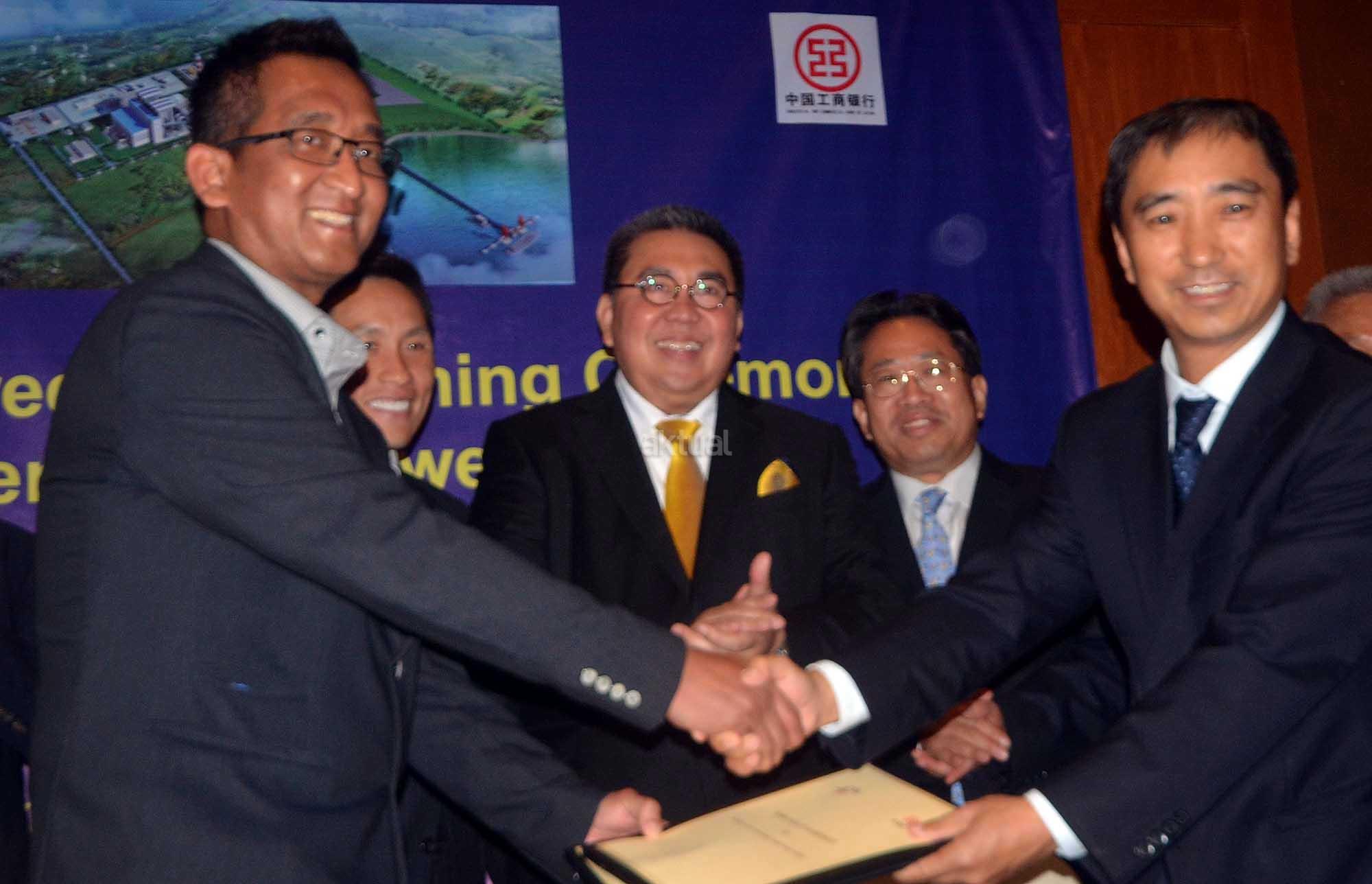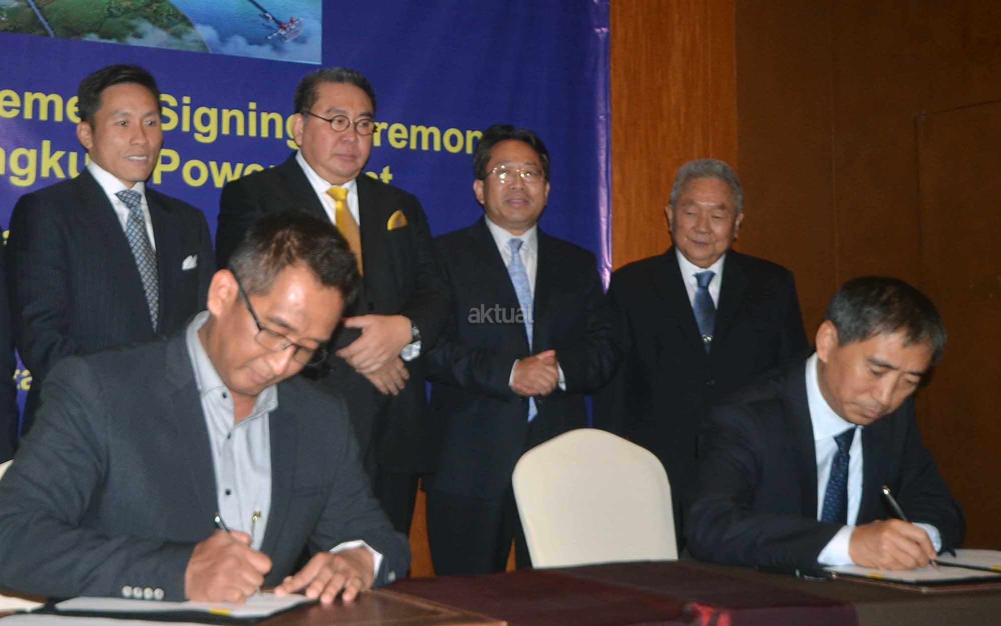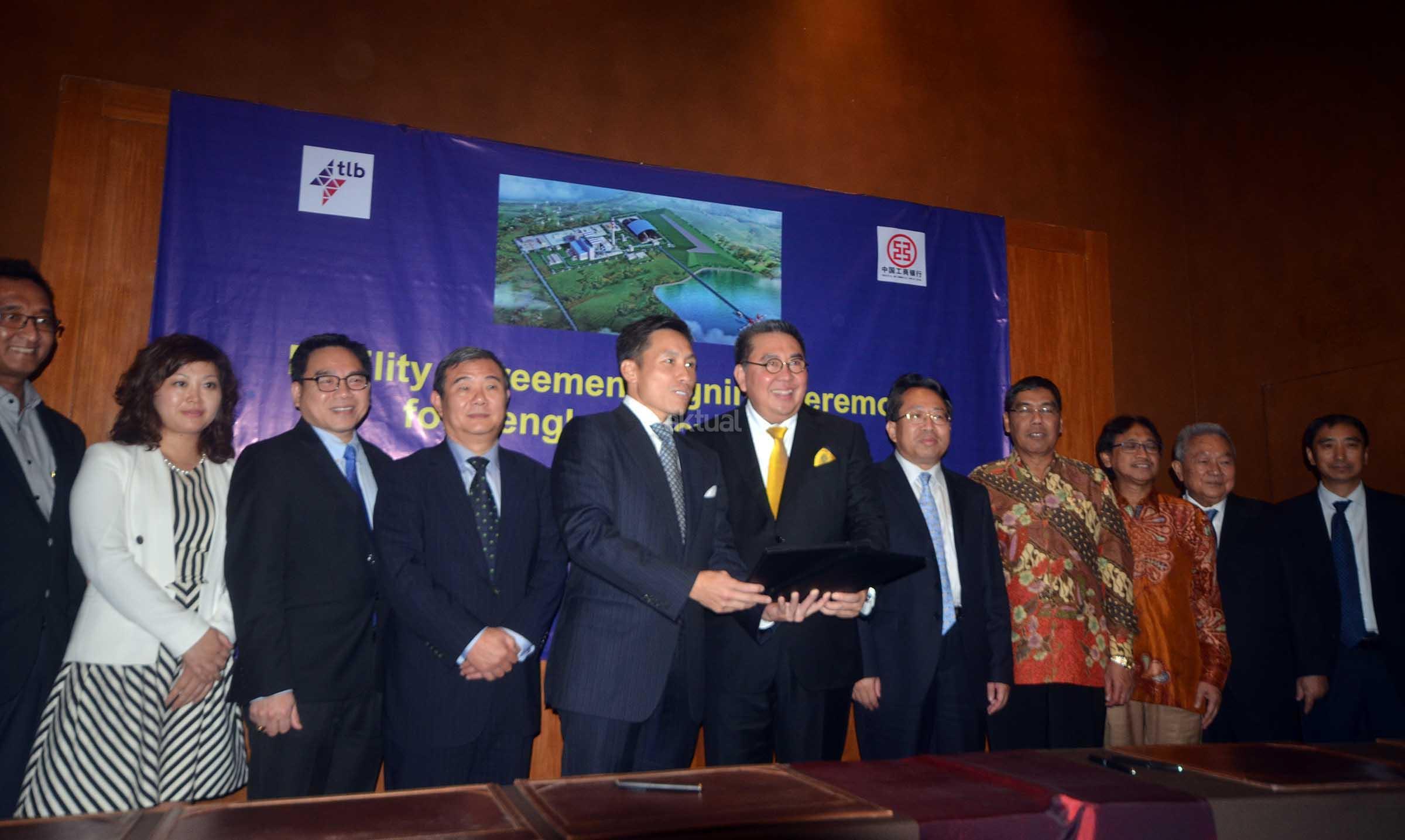 Presiden Direktur PT Tenaga Listrik Bengkulu (TLB), Cao Yueshen (kanan) dan Head Credit Support & Admin Department Industrial and Commercial Bank of China (ICBC), Adi Permana disaksikan President Komisaris TLB, Petrus Halim, Gubernur Bengkulu, H.Ridwan Mukti, serta Chairman of Power China Resources co.LTD, Sheng Yuming saat penandatangan perjanjian kredit (Loan Agreement) dengan Bank dari Tiongkok untuk proyek PLTU Bengkulu di Jakarta,Kamis (26/10). Pinjaman yang akan disalurkan kepada INTA Group adalah sebesar USD 270 juta, dimana seluruhnya akan digunakan untuk membiayai pembangunan proyek PLTU berkapasitas 2×100 MW berbahan bakar batubara yang merupakan PLTU pertama di Bengkulu berlokasi di lahan milik PT Pelindo II di Teluk Sepang,Pulai Baai.Provinsi Bengkulu.