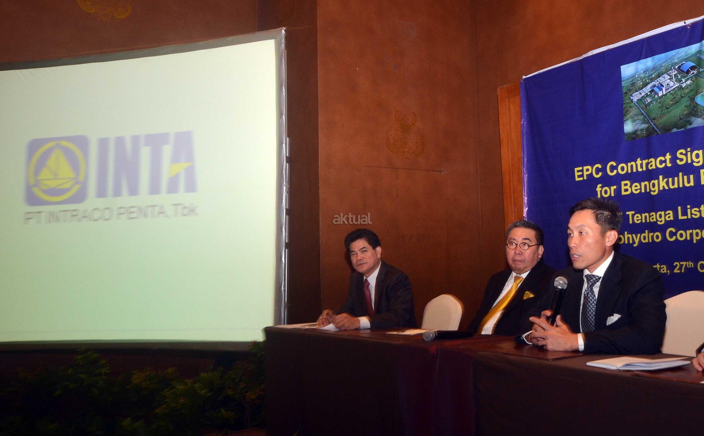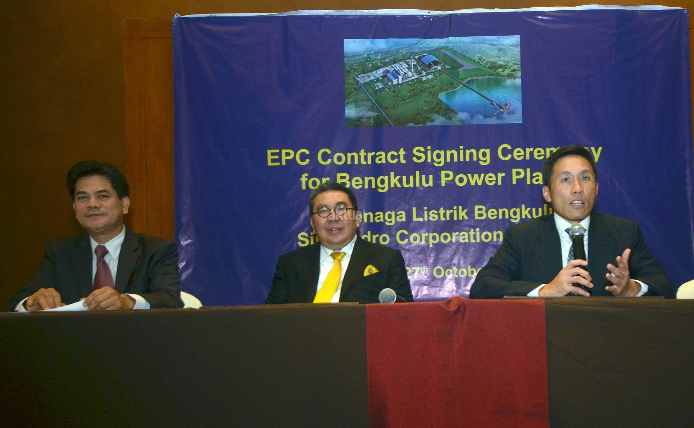 President Komisaris TLB, Petrus Halim (kanan) bersama Gubernur Bengkulu, H.Ridwan Mukti (tengah) , serta CFO INTA Group, Fred L Manibog saat penandatangan perjanjian kredit (Loan Agreement) dengan Bank dari Tiongkok untuk proyek PLTU Bengkulu di Jakarta,Kamis (26/10). Pinjaman yang akan disalurkan kepada INTA Group adalah sebesar USD 270 juta, dimana seluruhnya akan digunakan untuk membiayai pembangunan proyek PLTU berkapasitas 2×100 MW berbahan bakar batubara yang merupakan PLTU pertama di Bengkulu berlokasi di lahan milik PT Pelindo II di Teluk Sepang,Pulai Baai.Provinsi Bengkulu.