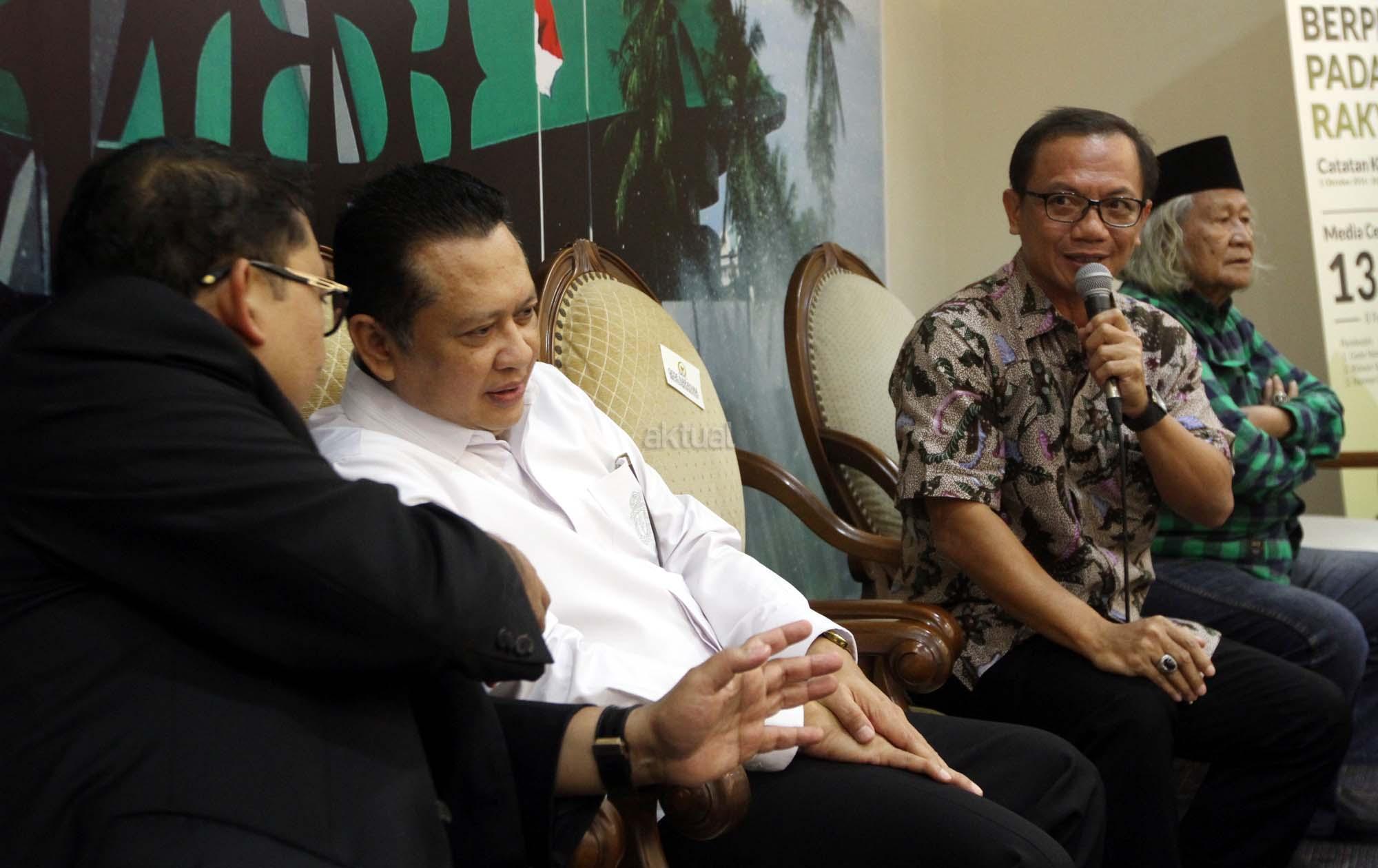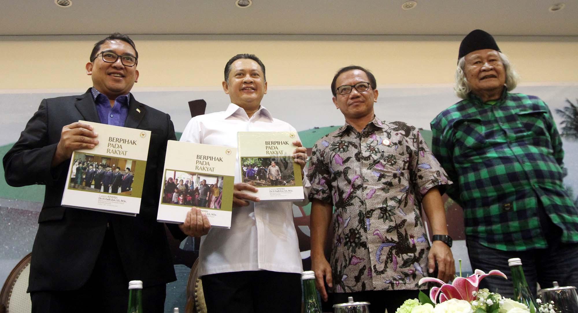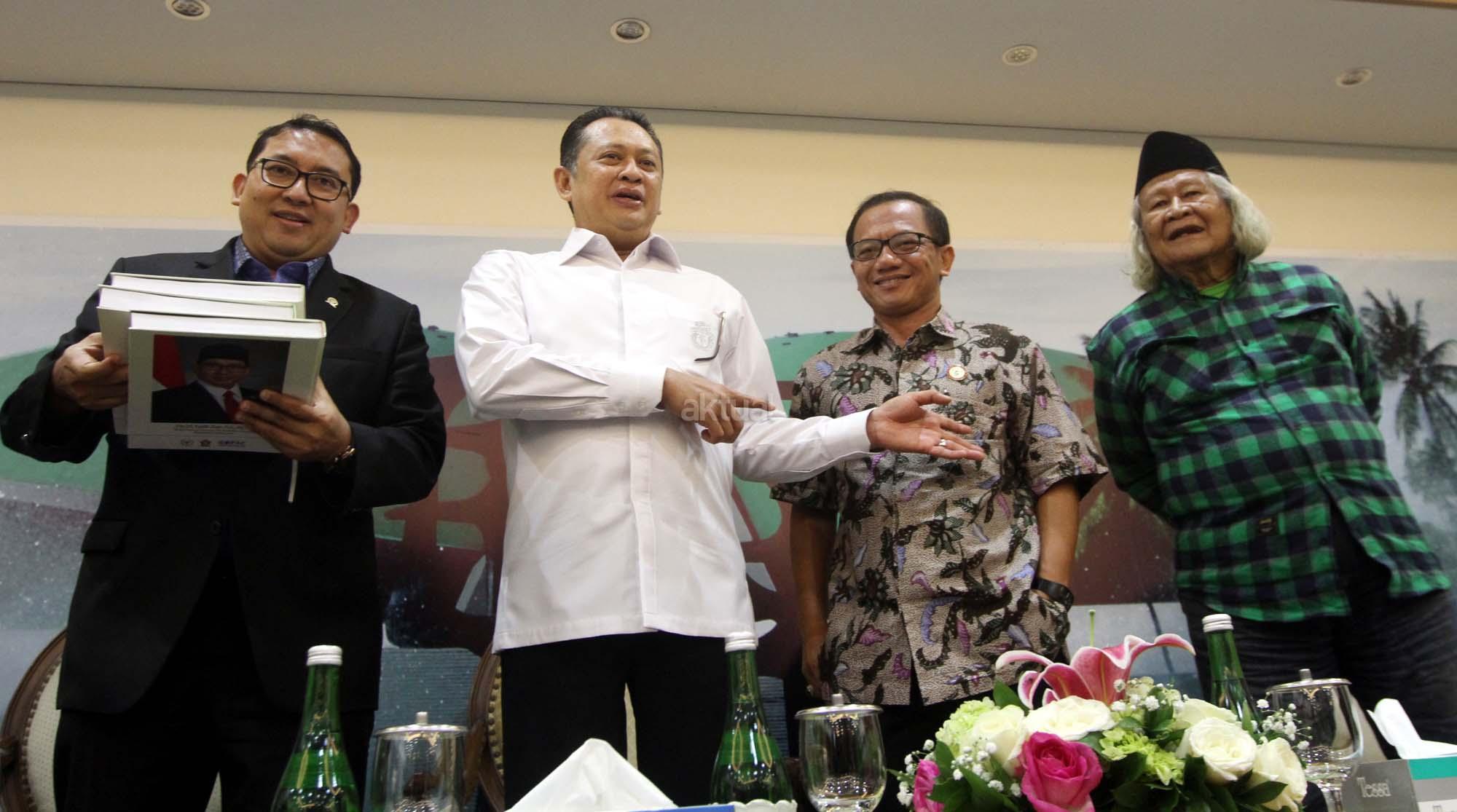 Dari kiri ke kanan, Wakil Ketua Dewan Perwakilan Rakyat (DPR) Fadli Zon, Ketua DPR Bambang Soesatyo, Wakil Ketua KIP Gede Narayana dan Budayawan Ridwan Saidi berbincang saat peluncura buku berjudul 'Berpihak Pada Rakyat' Buku berupa catatan kinerja Fadli selama menjadi salah satu pimpinan DPR yang ditulis sejak 1 Oktober 2014 sampai 30 September 2017 di Press Room DPR, gedung Parlemen, Senayan, Jakarta, Kamis (8/2/18). Dalam uku tersebut merekam mulai dari isu penistaan agama yang dilakukan oleh Basuki Tjahaja Purnama (Ahok), kriminalisasi para ulama, tuduhan makar terhadap kelompok aktivis, pengaduan korban penggusuran, pemutusan hubungan kerja, pembahasan RUU Pemilu, sampai polemik penerbitan Perppu Ormas yang dikeluarkan pemerintah. AKTUAL/Tino Oktaviano