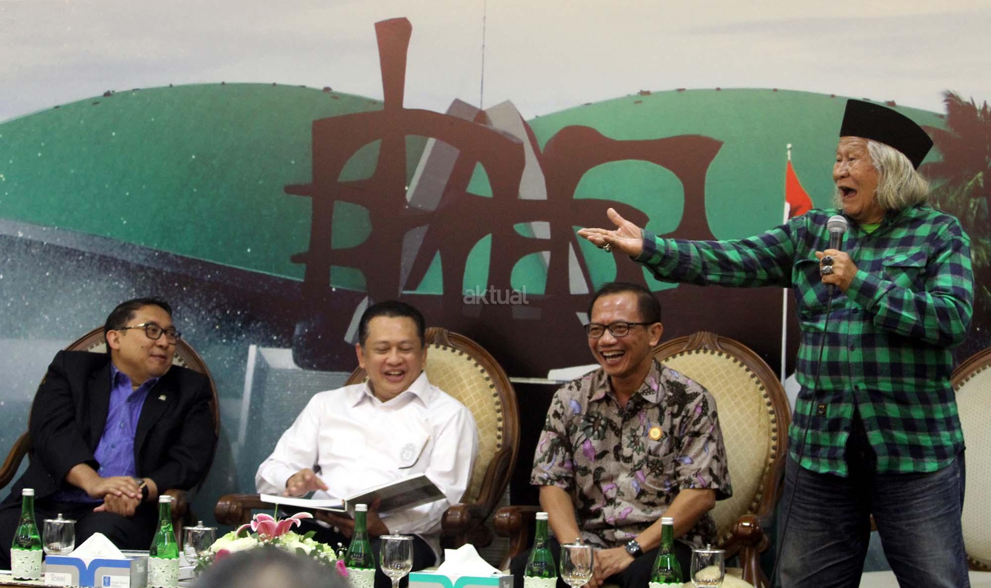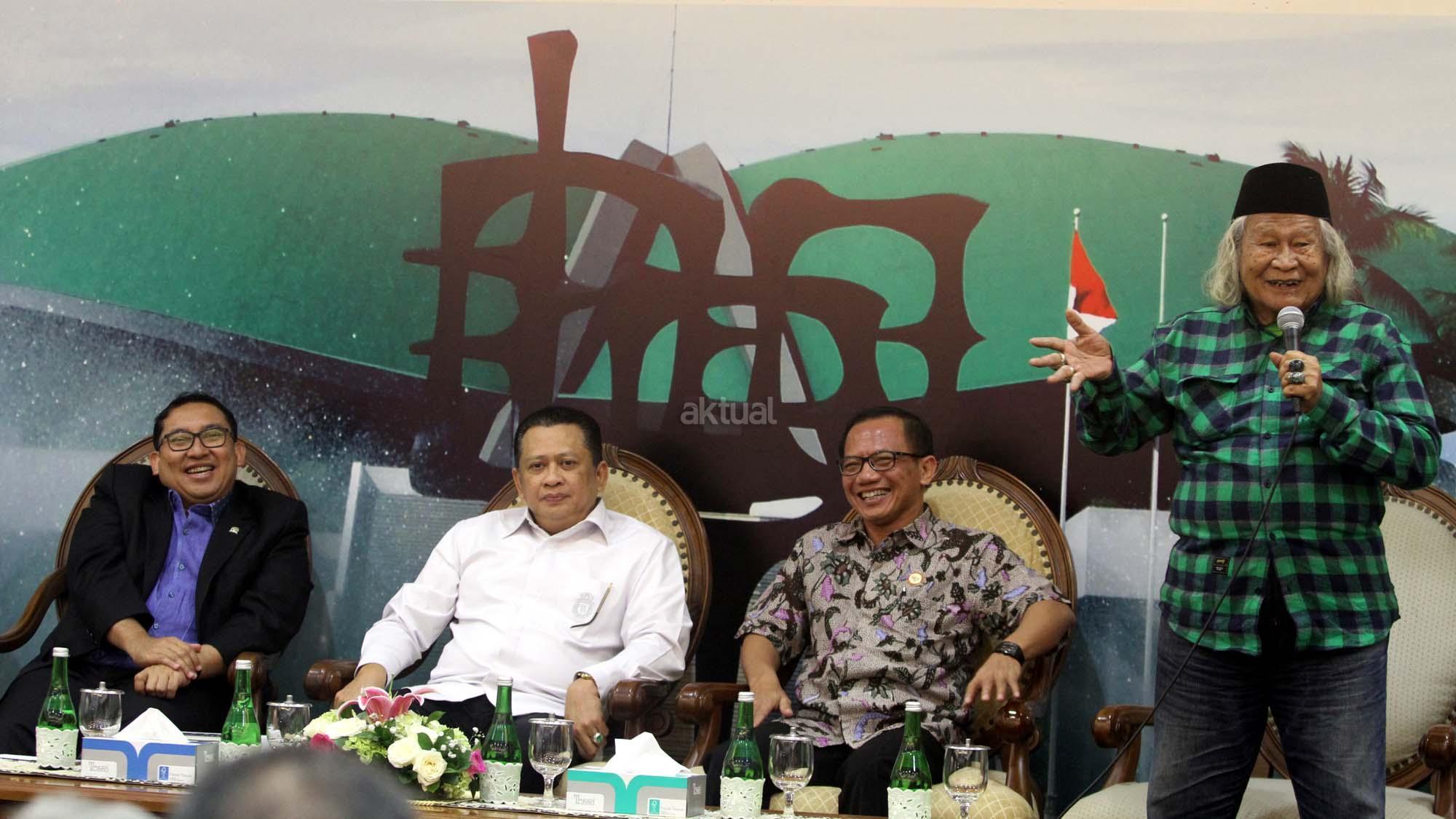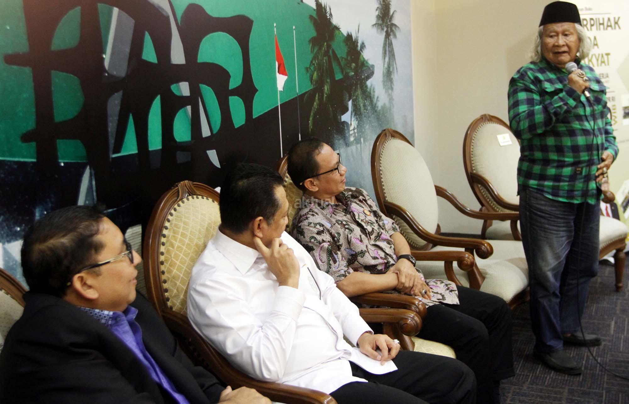 Dari kiri ke kanan, Wakil Ketua Dewan Perwakilan Rakyat (DPR) Fadli Zon, Ketua DPR Bambang Soesatyo, Wakil Ketua KIP Gede Narayana dan Budayawan Ridwan Saidi berbincang saat peluncura buku berjudul 'Berpihak Pada Rakyat' Buku berupa catatan kinerja Fadli selama menjadi salah satu pimpinan DPR yang ditulis sejak 1 Oktober 2014 sampai 30 September 2017 di Press Room DPR, gedung Parlemen, Senayan, Jakarta, Kamis (8/2/18). Dalam uku tersebut merekam mulai dari isu penistaan agama yang dilakukan oleh Basuki Tjahaja Purnama (Ahok), kriminalisasi para ulama, tuduhan makar terhadap kelompok aktivis, pengaduan korban penggusuran, pemutusan hubungan kerja, pembahasan RUU Pemilu, sampai polemik penerbitan Perppu Ormas yang dikeluarkan pemerintah. AKTUAL/Tino Oktaviano