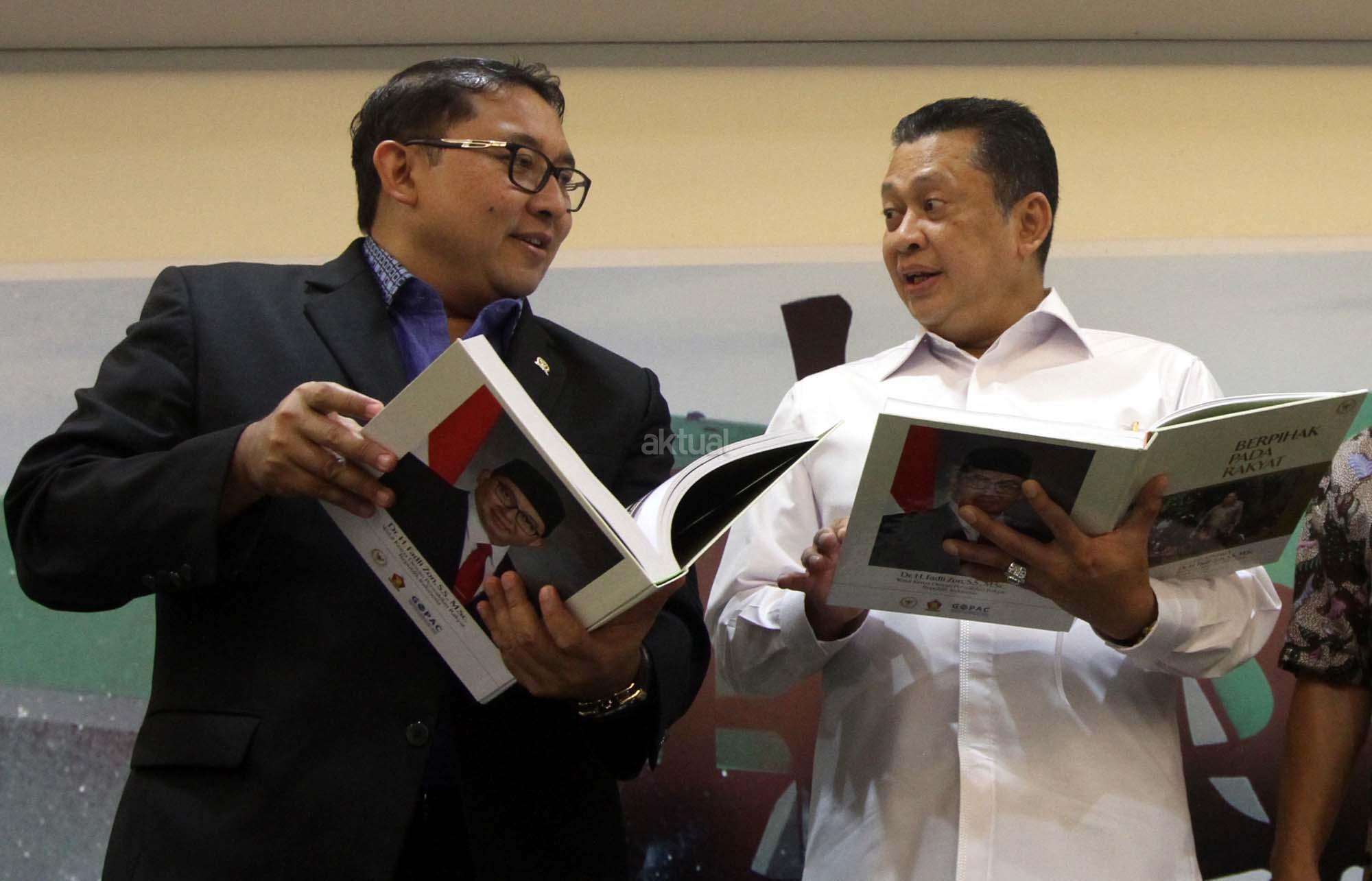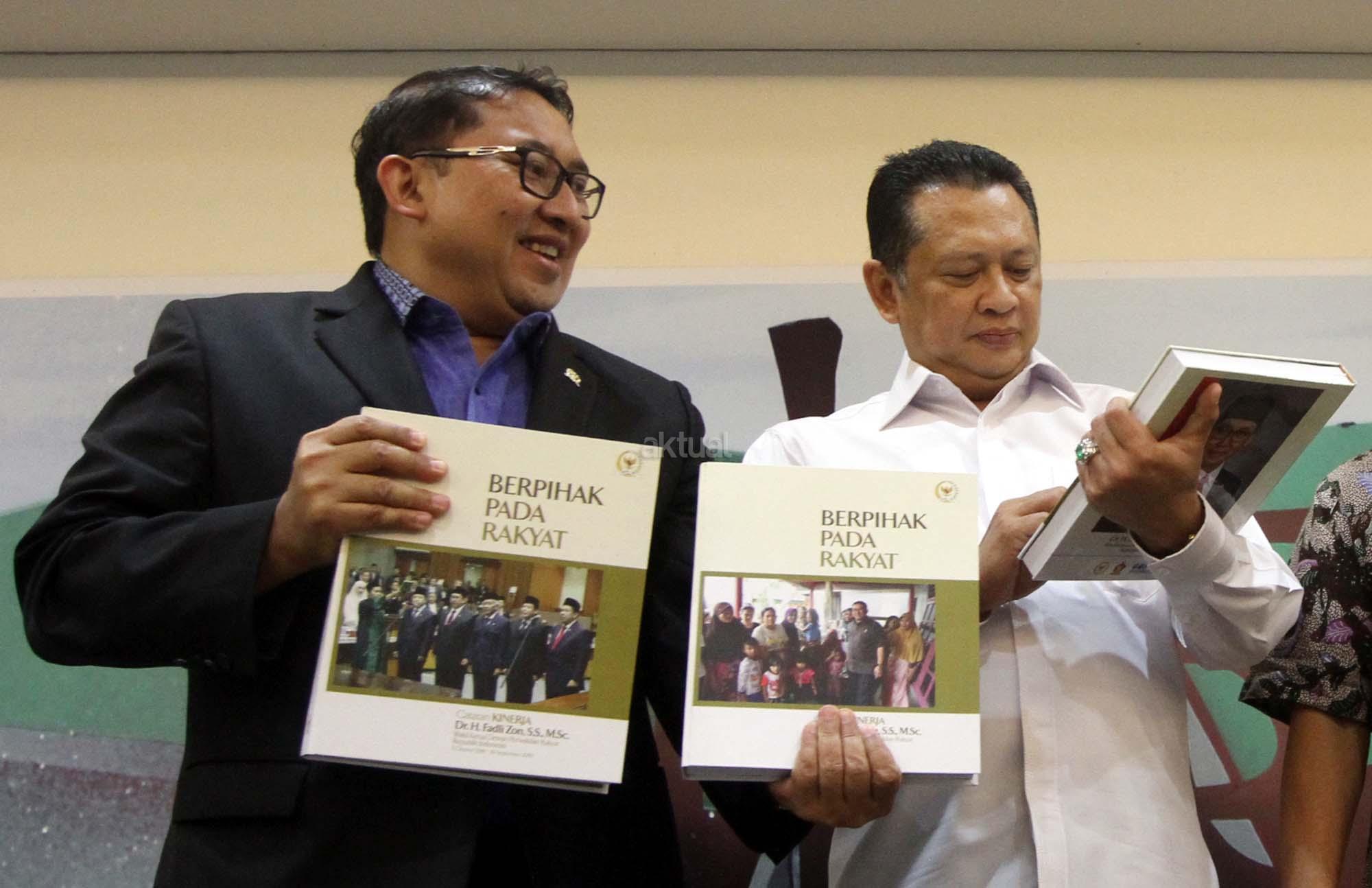 Wakil Ketua Dewan Perwakilan Rakyat (DPR) Fadli Zon memperlihatkan buku berjudul ‘Berpihak Pada Rakyat’ kepada Ketua DPR Bambang Soesatyo saat peluncuran Buku berupa catatan kinerja Fadli selama menjadi salah satu pimpinan DPR yang ditulis sejak 1 Oktober 2014 sampai 30 September 2017 di Press Room DPR, gedung Parlemen, Senayan, Jakarta, Kamis (8/2/18). Dalam uku tersebut merekam mulai dari isu penistaan agama yang dilakukan oleh Basuki Tjahaja Purnama (Ahok), kriminalisasi para ulama, tuduhan makar terhadap kelompok aktivis, pengaduan korban penggusuran, pemutusan hubungan kerja, pembahasan RUU Pemilu, sampai polemik penerbitan Perppu Ormas yang dikeluarkan pemerintah. AKTUAL/Tino Oktaviano