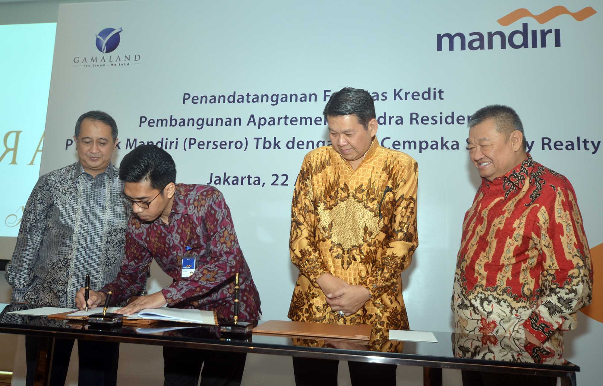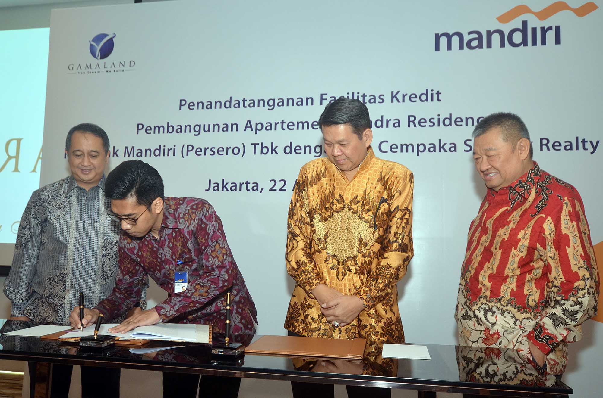 Direktur Corporate Banking Bank Mandiri, Royke Tumilaar (kiri) bersama Komisaris Utama PT Cempaka Sinergy Realty, Ganda (kanan) dan Direktur PT Cempaka Sinergy Realty, Dicky Iksan Soetikno (kedua dari kanan) menyaksikan SVP Corporate Banking Bank Mandiri,M Iswahyudi menandatangani naskah pemberian fasilitas kredit di Jakarta, Senin (22/8). Rencananya fasilitas kredit sebesar Rp 700 Miliar tersebut akan digunakan untuk membiayai pembangunan apartemen Arandra Residence di Kawasan Cempaka Putih yang diharapkan rampung tahun 2020.Untuk mendorong industri properti Bank Mandiri telah mengucurkan pembiayaan senilai Rp 12,7 Triliun kepada berbagai pengembang di seluruh Indonesia serta KPR senilai Rp 28,3 Triliun pada akhir Juni 2016