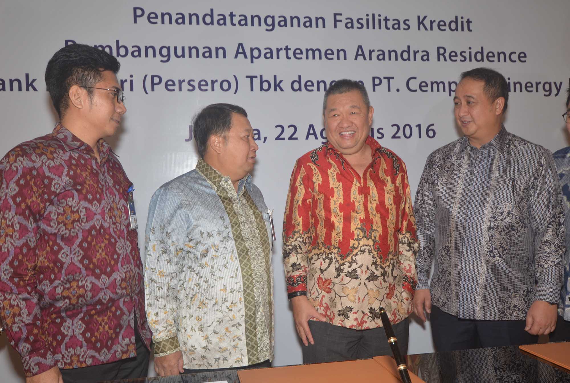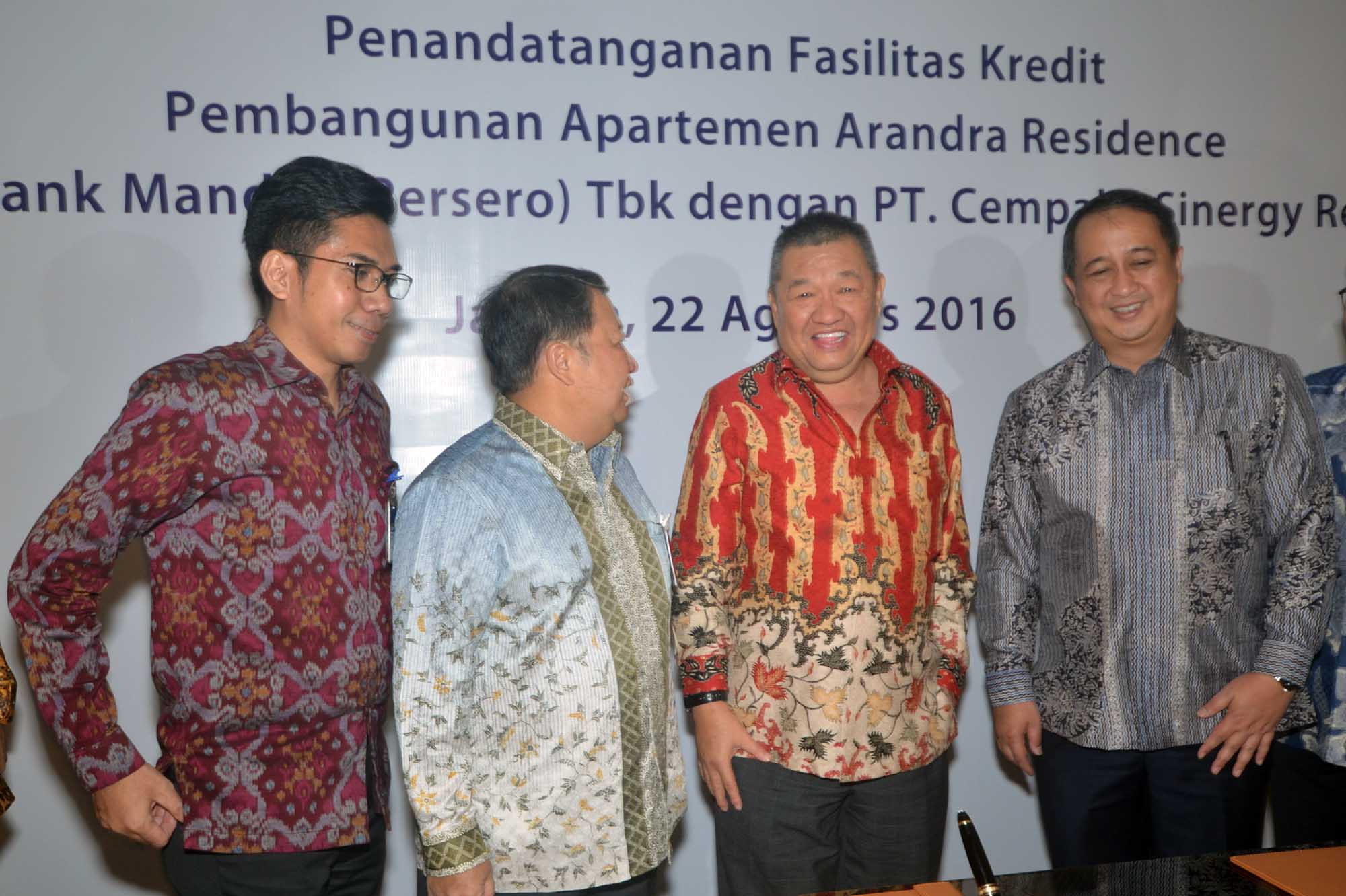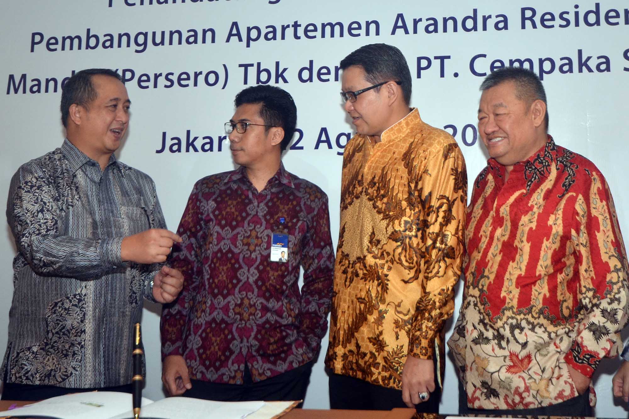 Wakil Direktur Utama Bank Mandiri, Sulaiman A Arianto (kedua dari kiri) berbincang dengan Komisaris Utama PT Cempaka Sinergy Realty, Ganda (kedua dari kanan) disaksikan Direktur Corporate Banking Bank Mandiri, Royke Tumilaar (kanan) dan SVP Corporate Banking Bank Mandiri,M Iswahyudi (kiri) seusai menandatangani naskah pemberian fasilitas kredit di Jakarta, Senin (22/8). Rencananya fasilitas kredit sebesar Rp 700 Miliar tersebut akan digunakan untuk membiayai pembangunan apartemen Arandra Residence di Kawasan Cempaka Putih yang diharapkan rampung tahun 2020.Untuk mendorong industri properti Bank Mandiri telah mengucurkan pembiayaan senilai Rp 12,7 Triliun kepada berbagai pengembang di seluruh Indonesia serta KPR senilai Rp 28,3 Triliun pada akhir Juni 2016