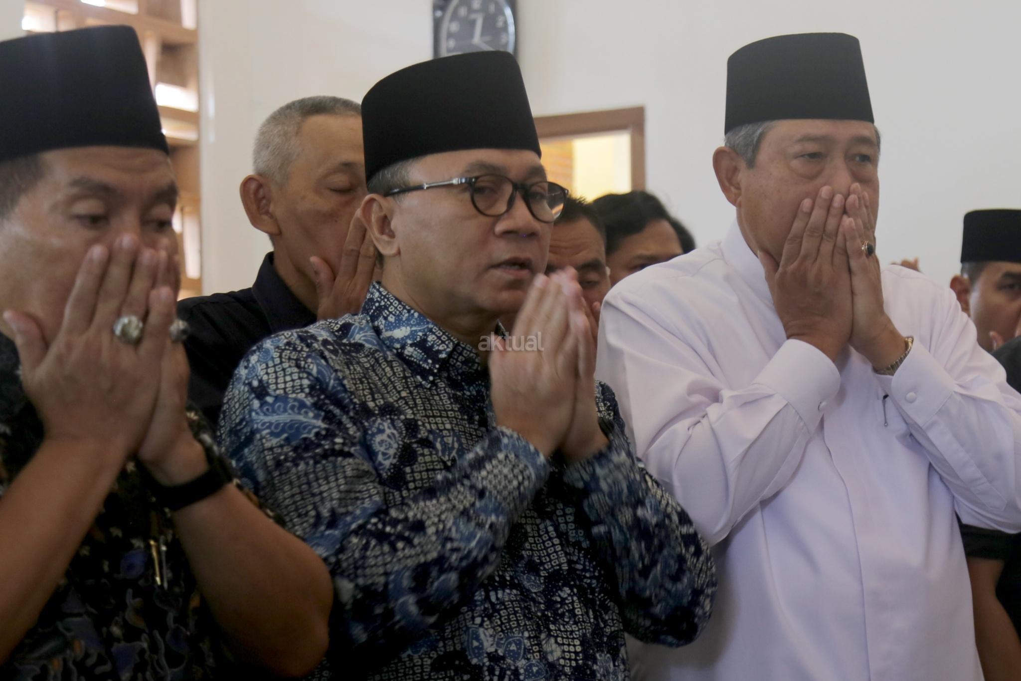 Presiden ke 6 Susilo Bambang Yudhoyono didampingi Ketua MPR Zulkifli Hasan saat melayat Almarhum Anggota Dewan Perwakilan Daerah (DPD) RI, Andi Mappetahang Fatwa atau yang akrab disapa AM Fatwa di rumah duka Jalan Condet Pejaten, Jakarta Selatan, Kamis (14/12/2017). AM Fatwa meninggal dunia pada pukul 06.25 WIB. Almarhum mengembuskan nafas terakhirnya di usia 78 tahun di Rumah Sakit MMC, Kuningan, Jakarta Selatan. AKTUAL/Tino Oktaviano