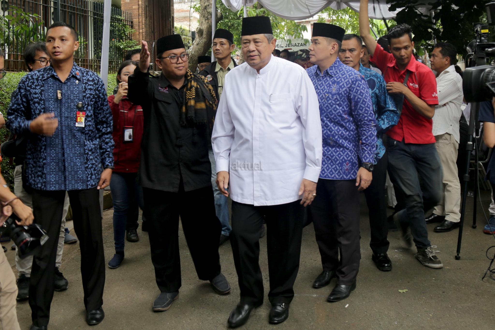 Presiden ke 6 Susilo Bambang Yudhoyono melayat Almarhum Anggota Dewan Perwakilan Daerah (DPD) RI, Andi Mappetahang Fatwa atau yang akrab disapa AM Fatwa di rumah duka Jalan Condet Pejaten, Jakarta Selatan, Kamis (14/12/2017). AM Fatwa meninggal dunia pada pukul 06.25 WIB. Almarhum mengembuskan nafas terakhirnya di usia 78 tahun di Rumah Sakit MMC, Kuningan, Jakarta Selatan. AKTUAL/Tino Oktaviano