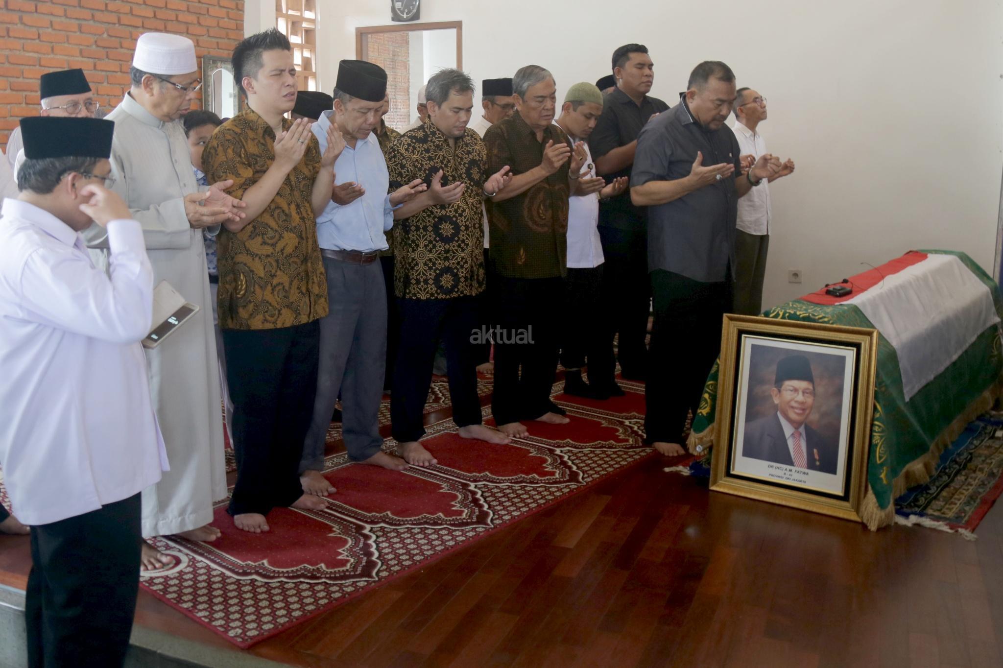 Kerabat melaksakan salat jenazah saat melayat Almarhum Anggota Dewan Perwakilan Daerah (DPD) RI, Andi Mappetahang Fatwa atau yang akrab disapa AM Fatwa di rumah duka Jalan Condet Pejaten, Jakarta Selatan, Kamis (14/12/2017). AM Fatwa meninggal dunia pada pukul 06.25 WIB. Almarhum mengembuskan nafas terakhirnya di usia 78 tahun di Rumah Sakit MMC, Kuningan, Jakarta Selatan. AKTUAL/Tino Oktaviano
