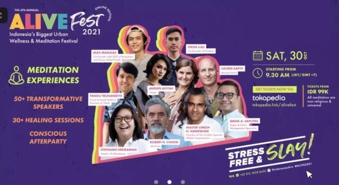 Jakarta, Aktual.com – ALIVE Fest 2021 adalah Festival kesehatan dan meditasi urban pertama di Indonesia. ALIVE Fest akan digelar secara daring pada Sabtu 30 Oktober mendatang. The Golden Space Indonesia yang bertindak sebagai penyelenggara, diketahui telah menyelenggarakan kegiatan ini empat kali.