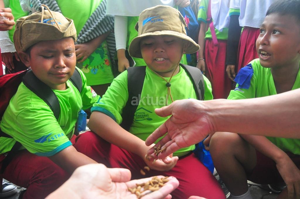 Anak-anak memegang beberapa belatung (maggot) yang dimanfaatkan untuk pengolahan sampah organik sekaligus sebagai pakan ternak ikan maupun ayam di KBA Depok pada Festival KBA di Cibinong, Bogor, Jawa Barat, Sabtu (28/4). AKTUAL/Astra