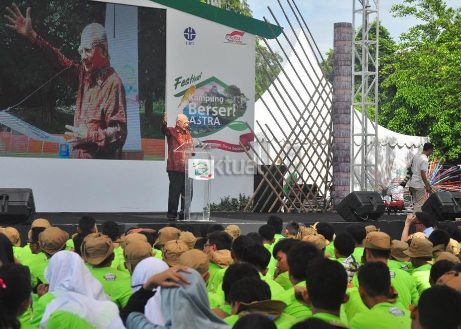Prof. Emil Salim, tokoh lingkungan hidup nasional, memberi semangat kepada anak-anak peserta Jambore Adiwiyata. Emil Salim berpesan bahwa hutan lebih dari sekedar kumpulan pohon. “Banyak aspek-aspek yang bisa kita manfaatkan. Tahukah kamu pacet dapat mengurangi sakit vertigo jika ditempelkan di kepala?” AKTUAL/Astra