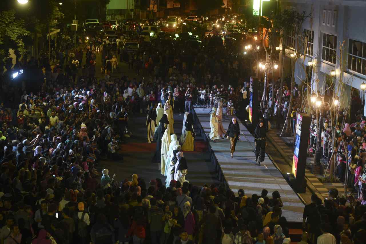 Warga menyaksikan sejumlah model yang memperagakan busana muslim saat digelar Fashion on the Street di Surabaya di Surabaya, Jawa Timur, Selasa (26/7). Peragaan busana tersebut merupakan salah satu hiburan untuk menyemarakkan PrepCom III UN Habitat. ANTARA FOTO/Zabur Karuru/aww/16.