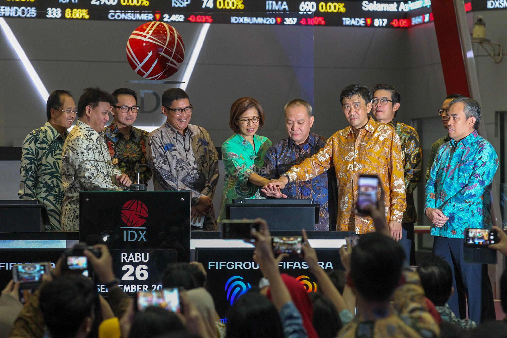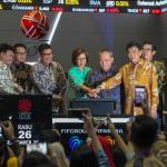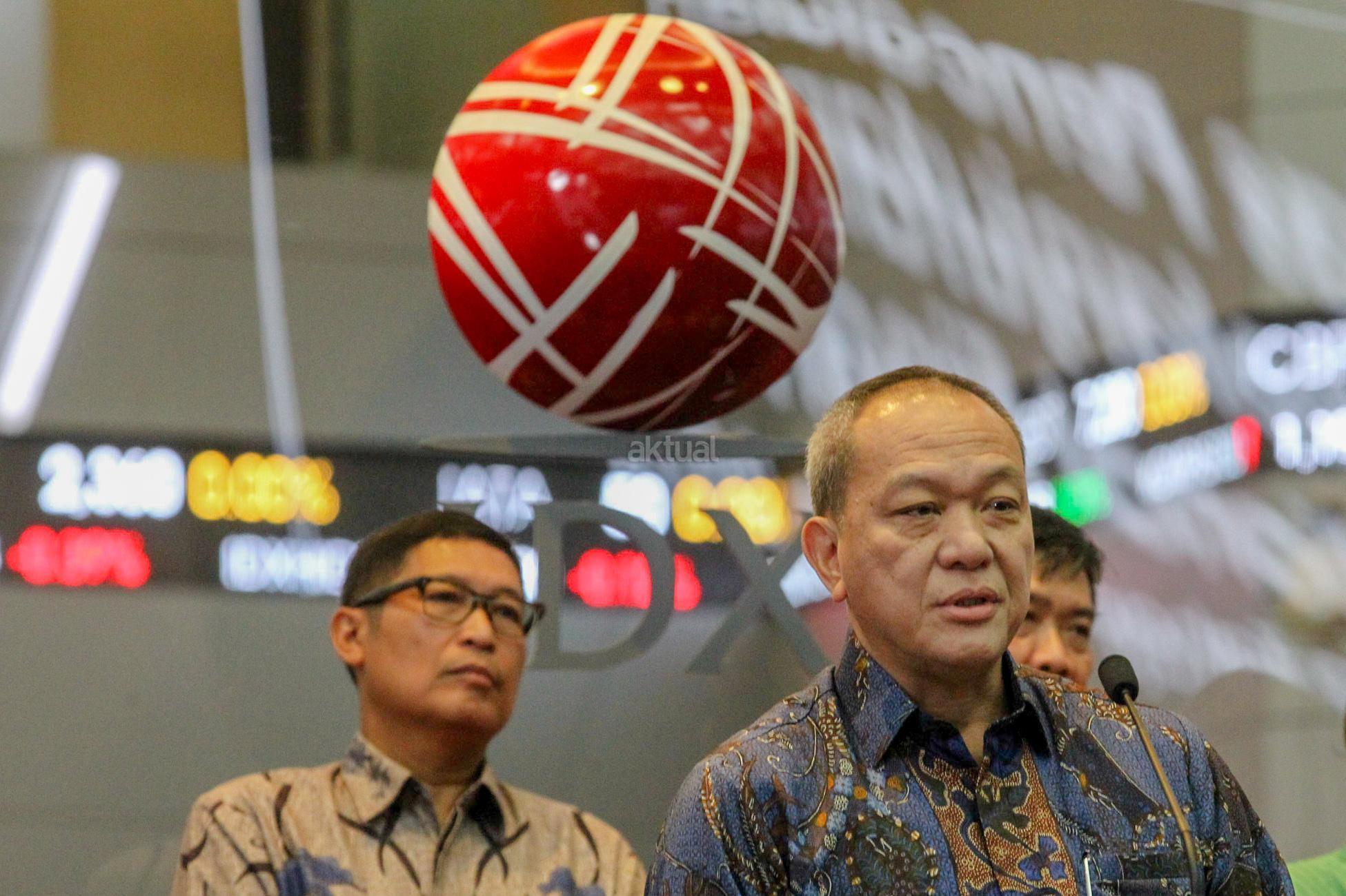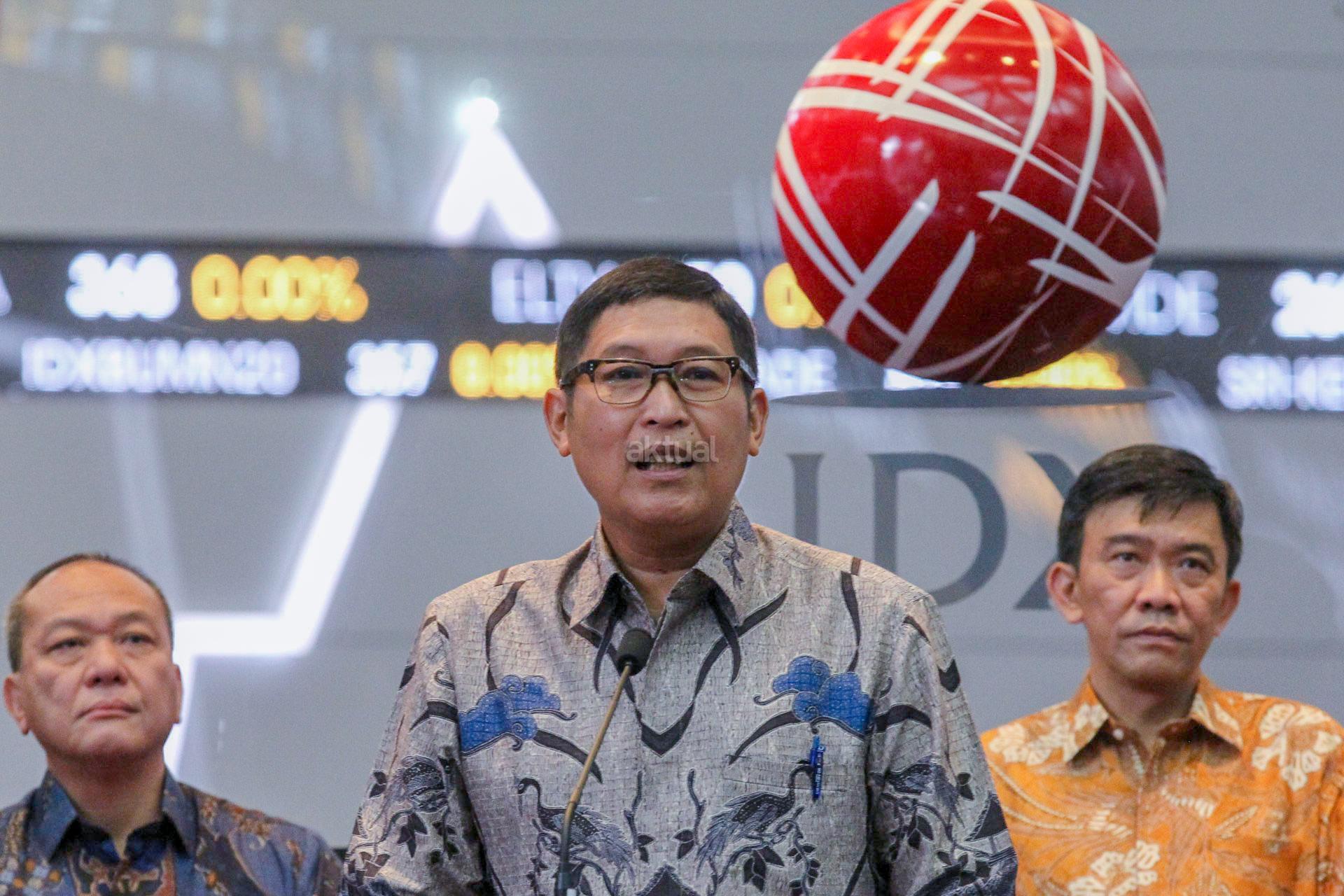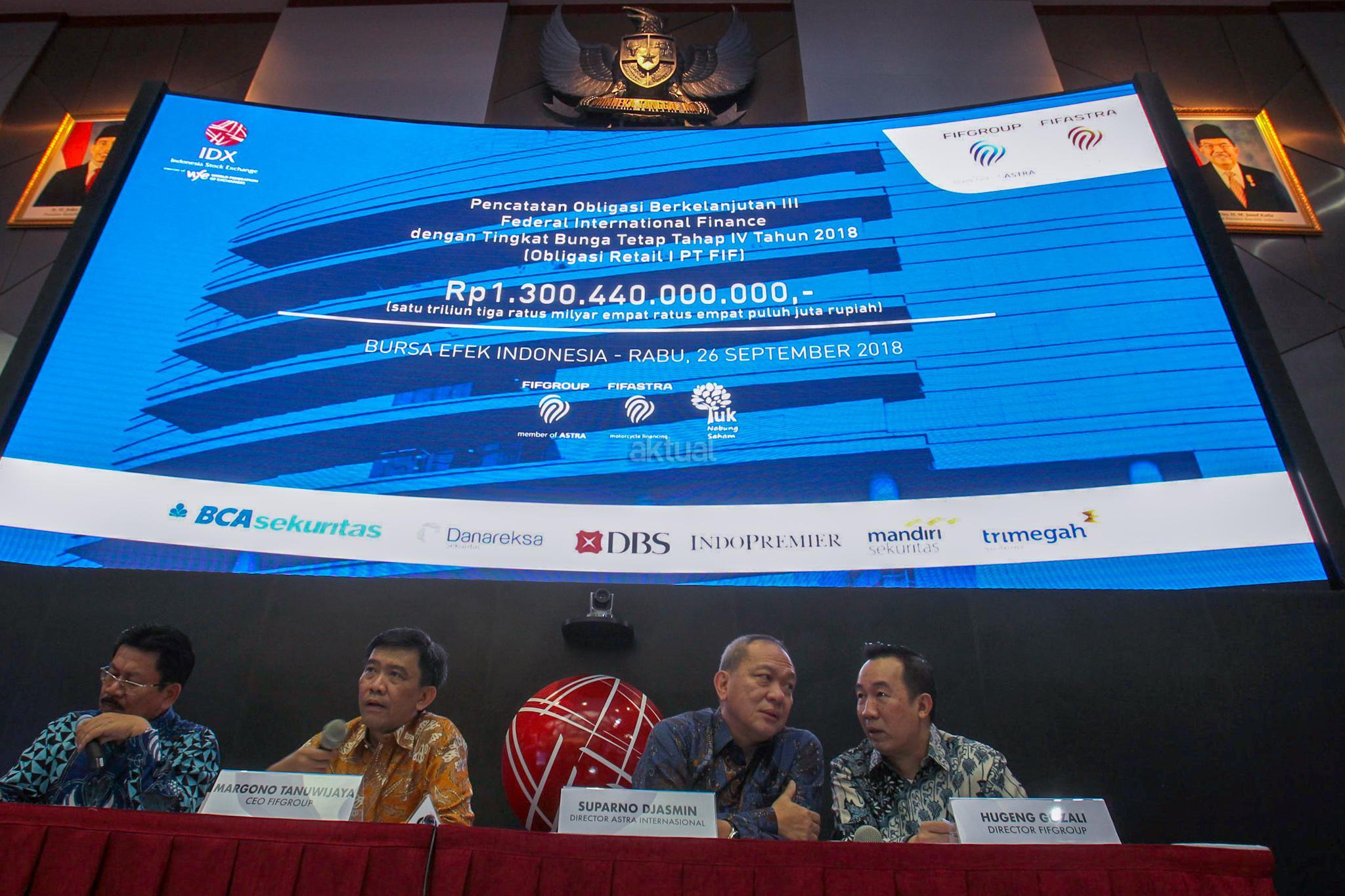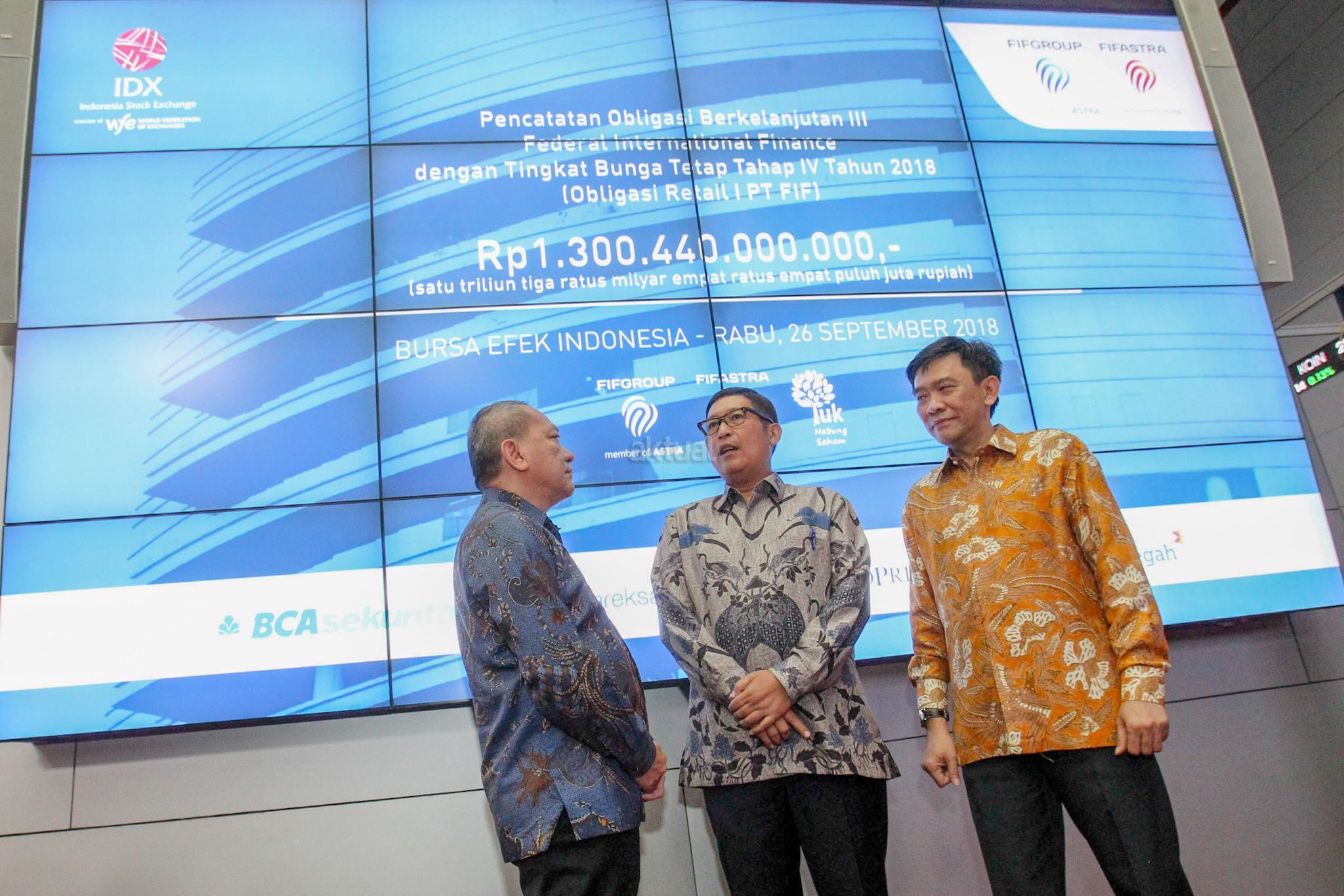 Direktur Utama PT Bursa Efek Indonesia Inarno Djajadi (tengah), berbincang dengan Chief Executive Officer PT Federal International Finance (FIF) Margono Tanuwijaya (kanan) dan Komisaris Utama Suparno Djasmin di sela-sela peluncuran obligasi senilai Rp1,3 triliun di Jakarta, Rabu (26/9/2018). Surat utang ini merupakan penawaran Obligasi Berkelanjutan III Federal International Finance Tahap IV Tahun 2018. Surat utang yang diterbitkan itu merupakan penawaran Obligasi Berkelanjutan III Federal International Finance Tahap IV Tahun 2018. Obligasi ini terdiri atas dua seri, yakni seri A bertenor 370 hari, dan seri B dengan tenor 36 bulan. Seri A memiliki jumlah pokok sebesar Rp639 miliar yang menawarkan bunga tetap 7,50 persen per tahun, akan jatuh tempo pada 5 Oktober 2019. Sedangkan seri B dengan jumlah pokok sebesar Rp661 miliar dengan menawarkan bunga tetap 8,75 persen per tahun, akan jatuh tempo pada 25 September 2021. AKTUAL/Eko S Hilman